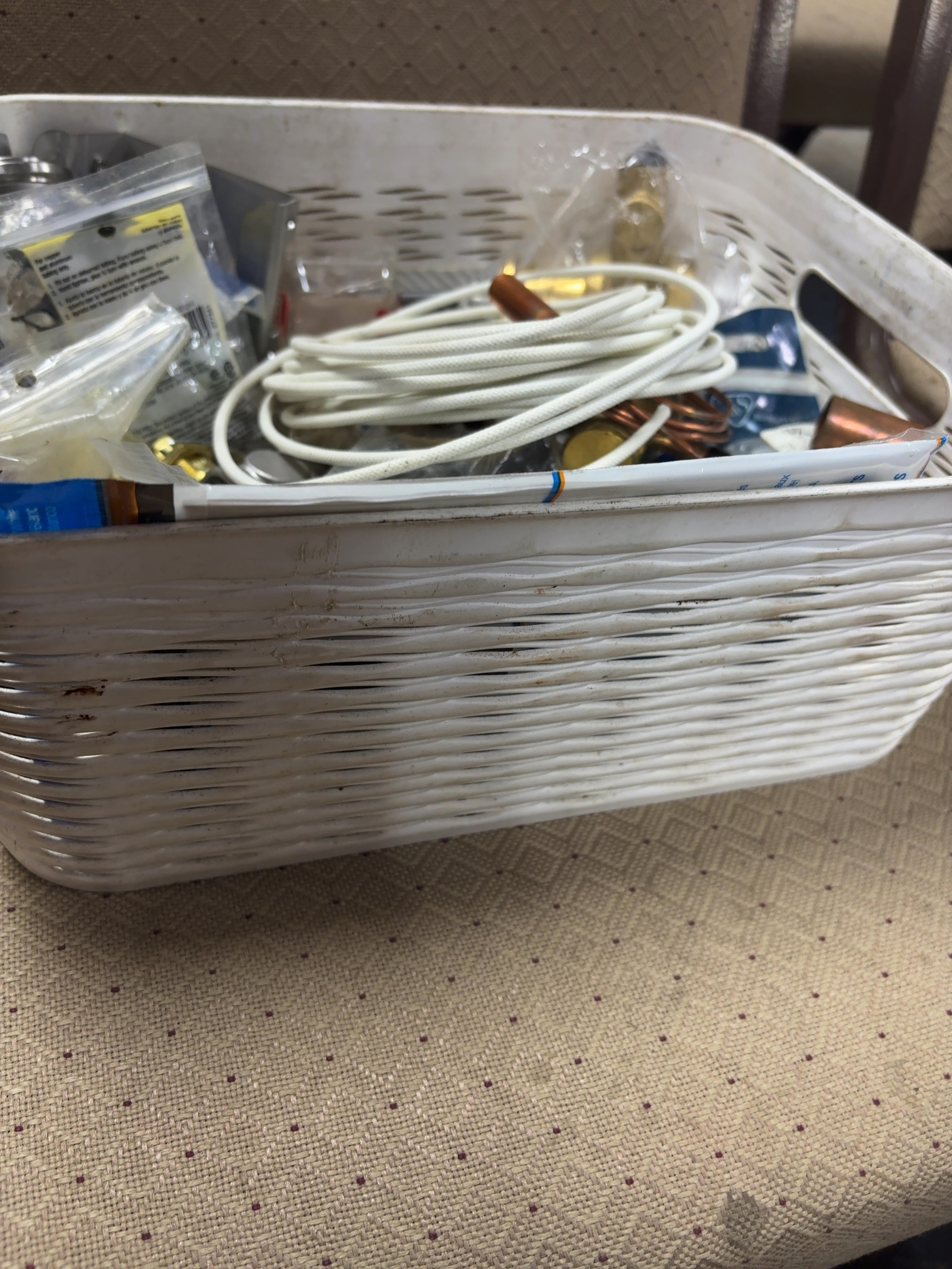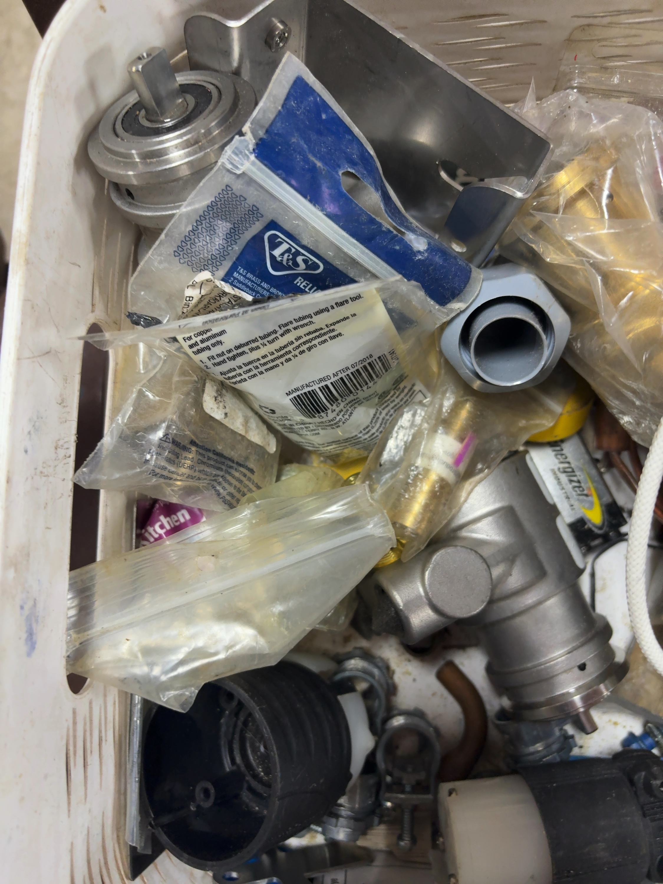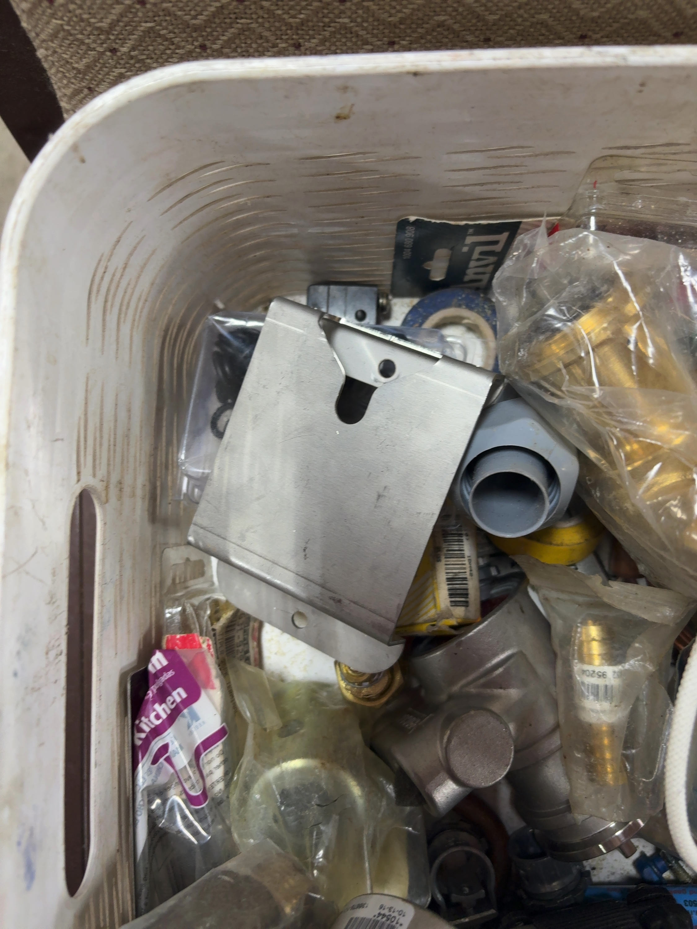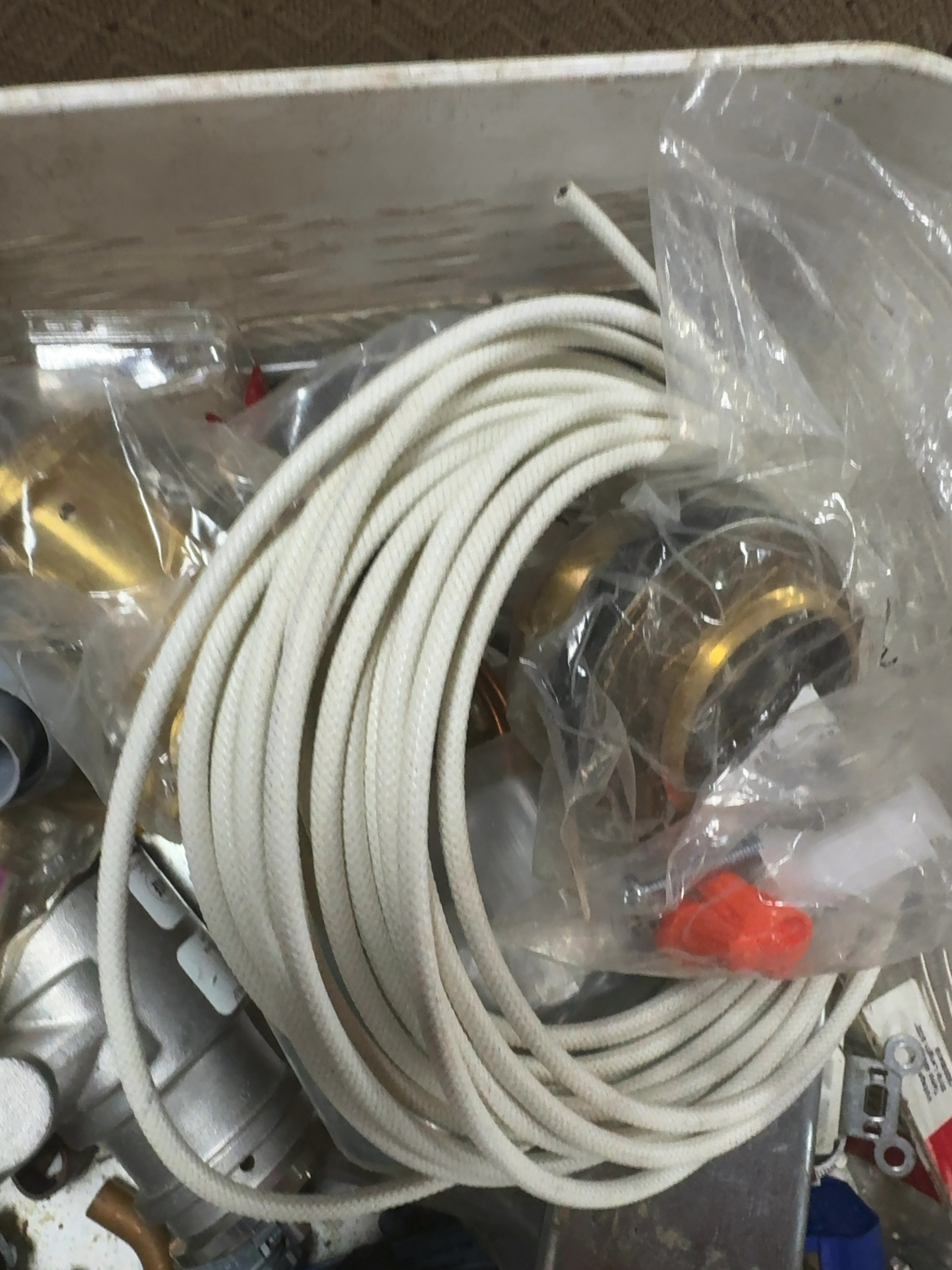 This lot comprises a diverse collection of industrial trade supplies, including plumbing, electrical, and mechanical components. Plumbing highlights include various valves and fittings from T&S Brass and Bronze Works, Everbilt 3/8 inch brass flare fittings, a coil of small-diameter copper tubing, various copper pipe segments and elbows, a large stainless steel valve body, and a roll of white PTFE thread seal tape. Electrical components consist of RACO metal electrical boxes and covers, standard white duplex receptacles, an ivory toggle light switch, heavy-duty industrial connectors, a roll of blue electrical tape, wire nut connectors, and a large coil of white braided or fabric-covered electrical cord. Mechanical hardware includes a bearing and shaft assembly, a custom stainless steel mounting bracket, and miscellaneous fasteners, with some hardware from Anvil International. Many items are new-old-stock in original packaging and feature UL and CSA certification marks. One label specifies a manufacture date after July 2018.