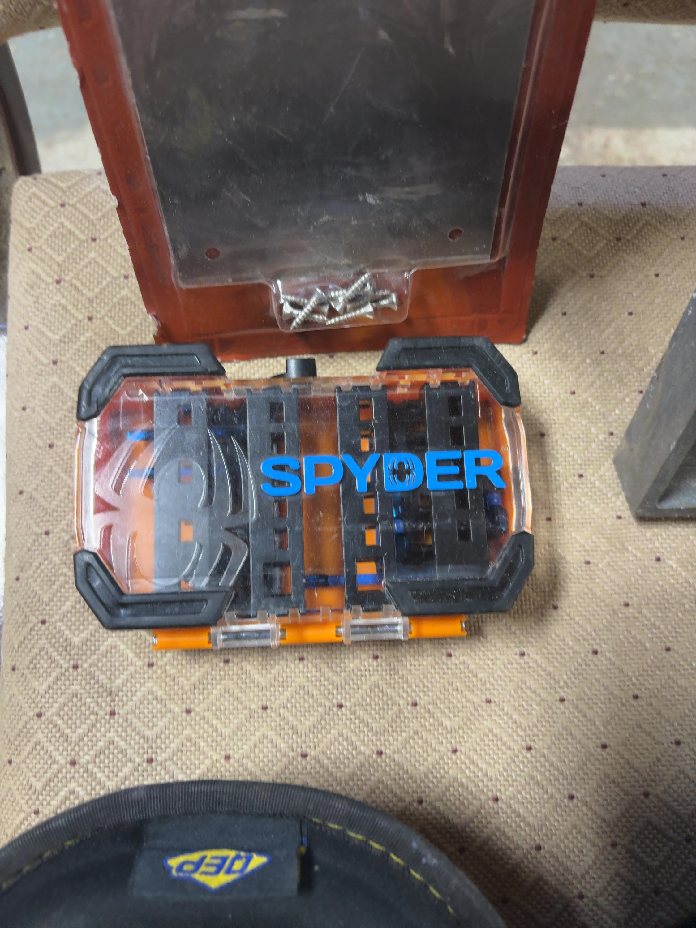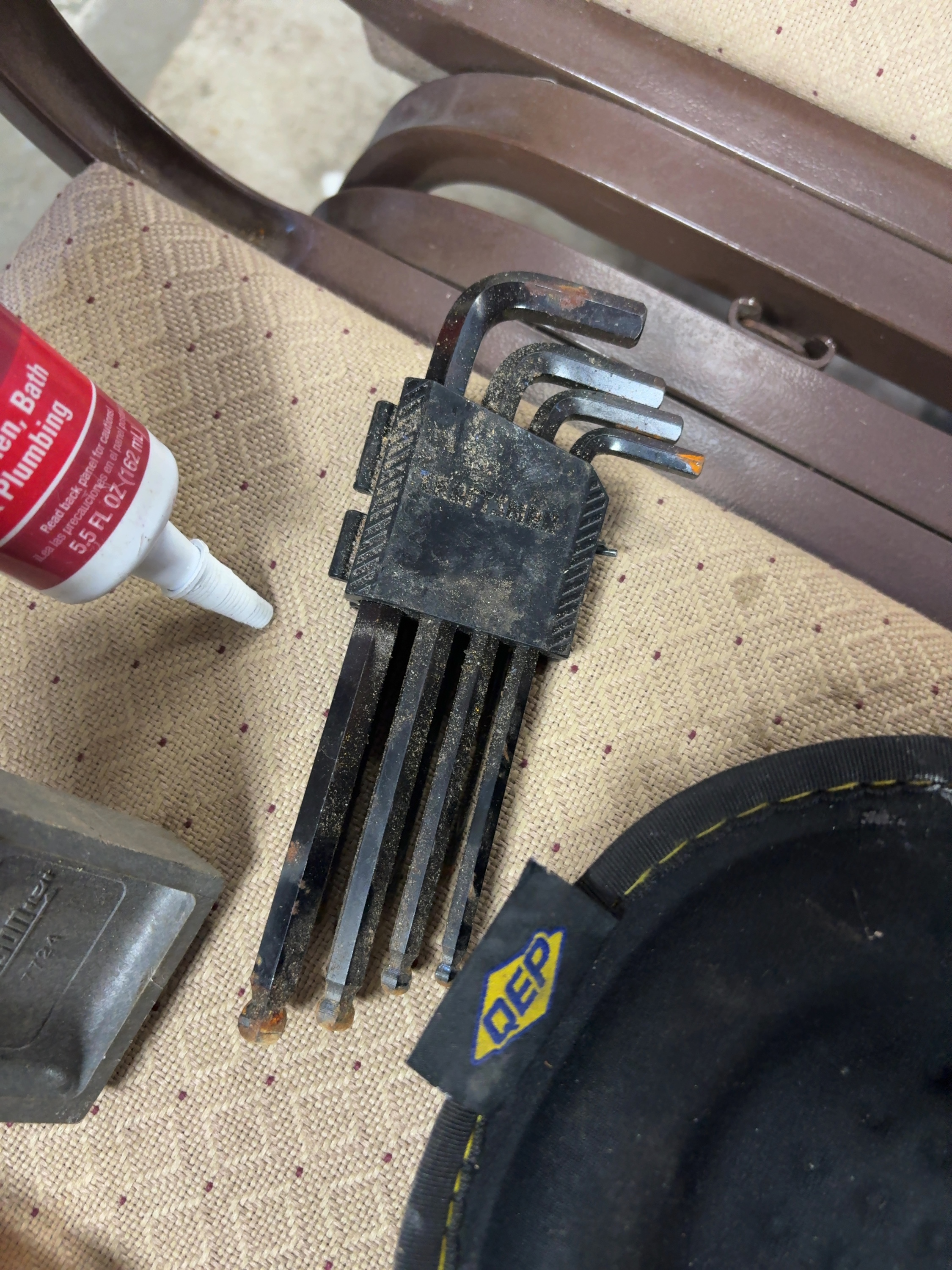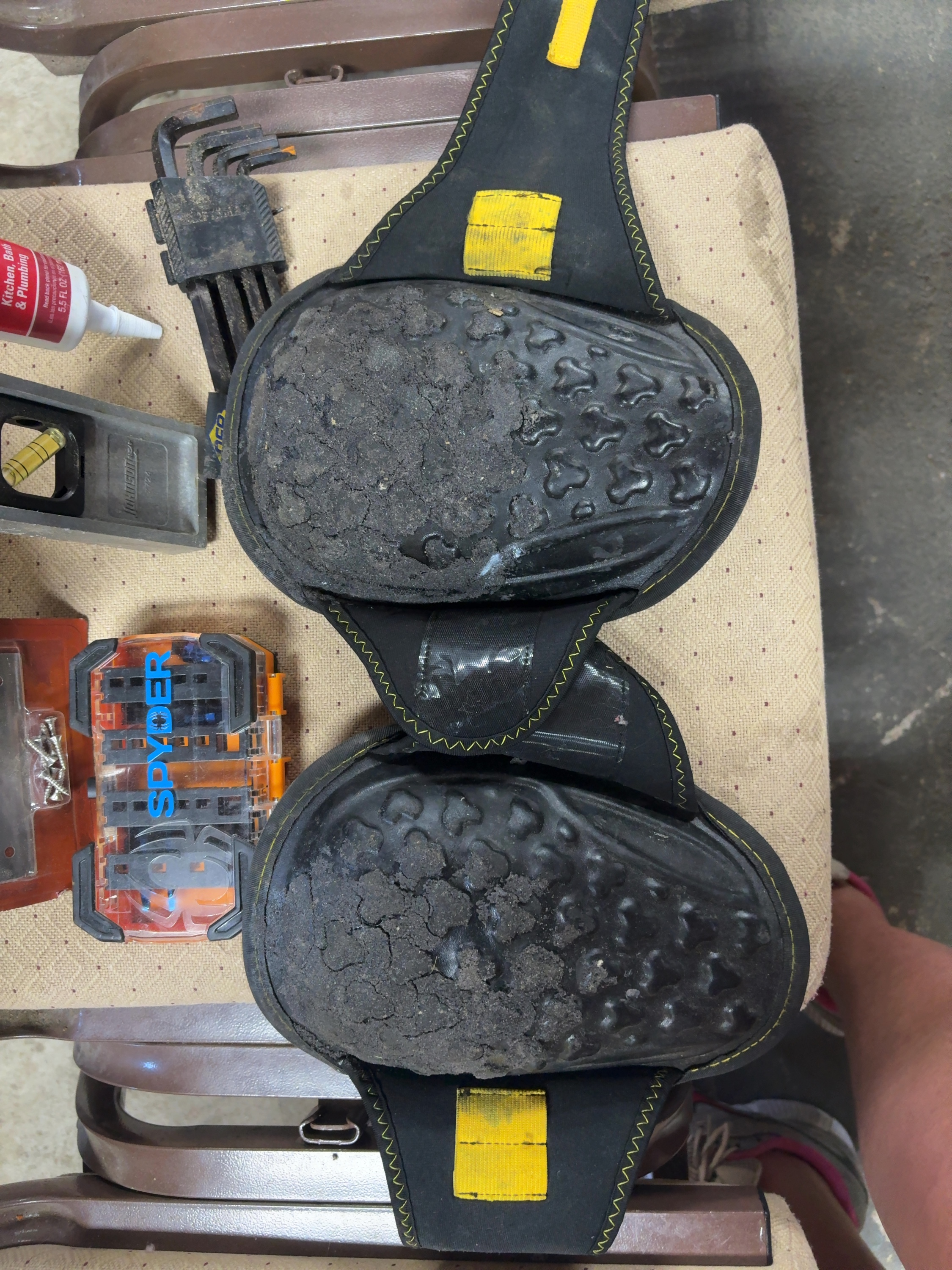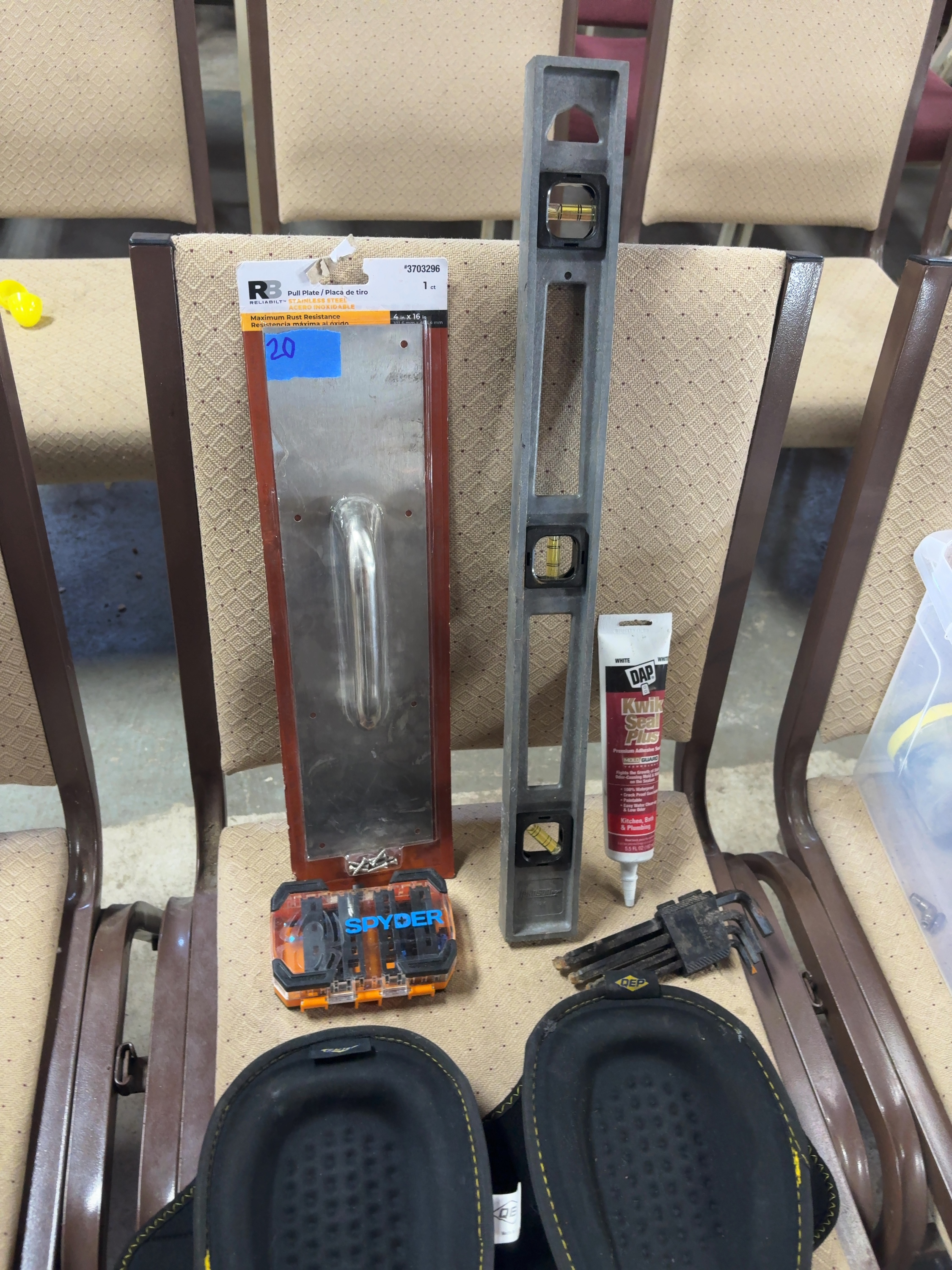 This lot features a selection of tools, safety gear, and building hardware. Included is a Reliabilt stainless steel pull plate, model number 3703296, which is unopened in its original packaging with the necessary mounting screws. A Johnson Level & Tool model 7724 cast metal I-beam level provides vials for horizontal, vertical, and 45-degree measurements. The lot also contains a 5.5 fluid ounce tube of white DAP Kwik Seal Plus adhesive sealant. A Spyder brand drill and driver bit set is stored in a branded clear and orange plastic case. A Craftsman hex key set includes a variety of L-shaped wrenches in a black plastic index holder. A pair of QEP fabric knee pads with yellow accents completes the assortment.