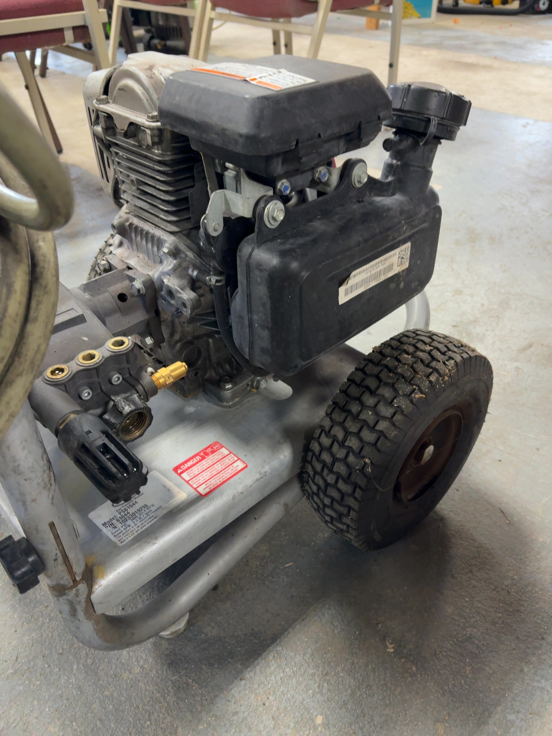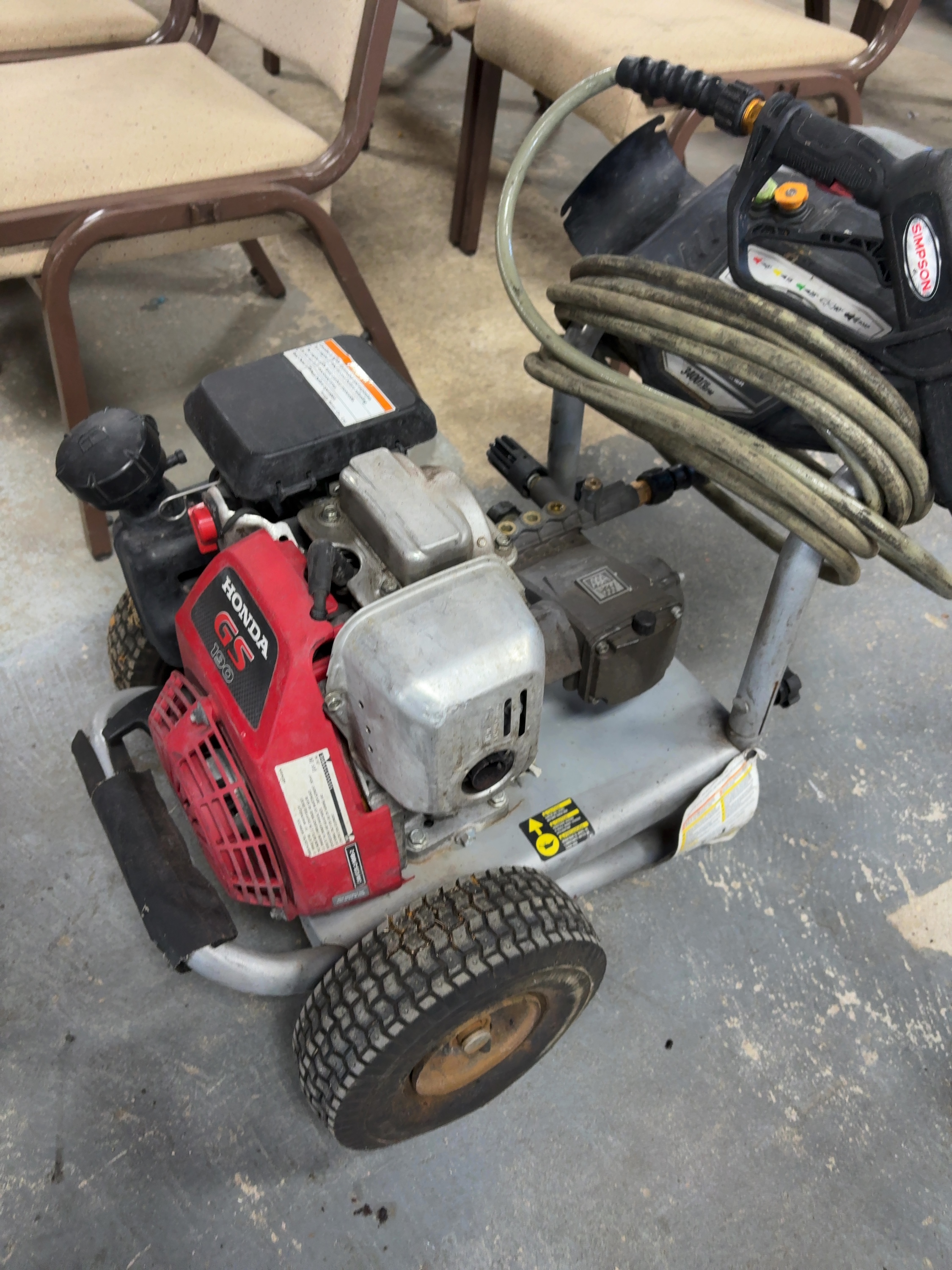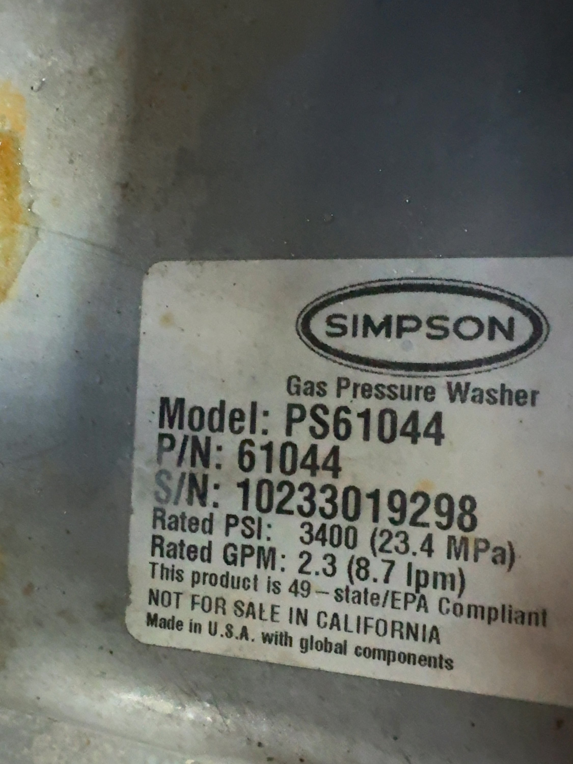 This Simpson Pro Series gas-powered cold water pressure washer, model PS61044, is equipped with a Honda GS 190 engine and an AAA triplex plunger pump. The unit is factory rated for 3400 PSI at 2.3 GPM. It is constructed on a silver powder-coated steel frame and features pneumatic tires. The washer includes a Simpson spray gun, a high-pressure hose, and four quick-connect nozzles for 0 degree, 15 degree, 25 degree, and soap applications. Visible labels confirm model number PS61044, part number 61044, and serial number 10233019298. The engine is a Honda GS series with an overhead cam design. The unit features integrated storage for accessories on the dashboard.