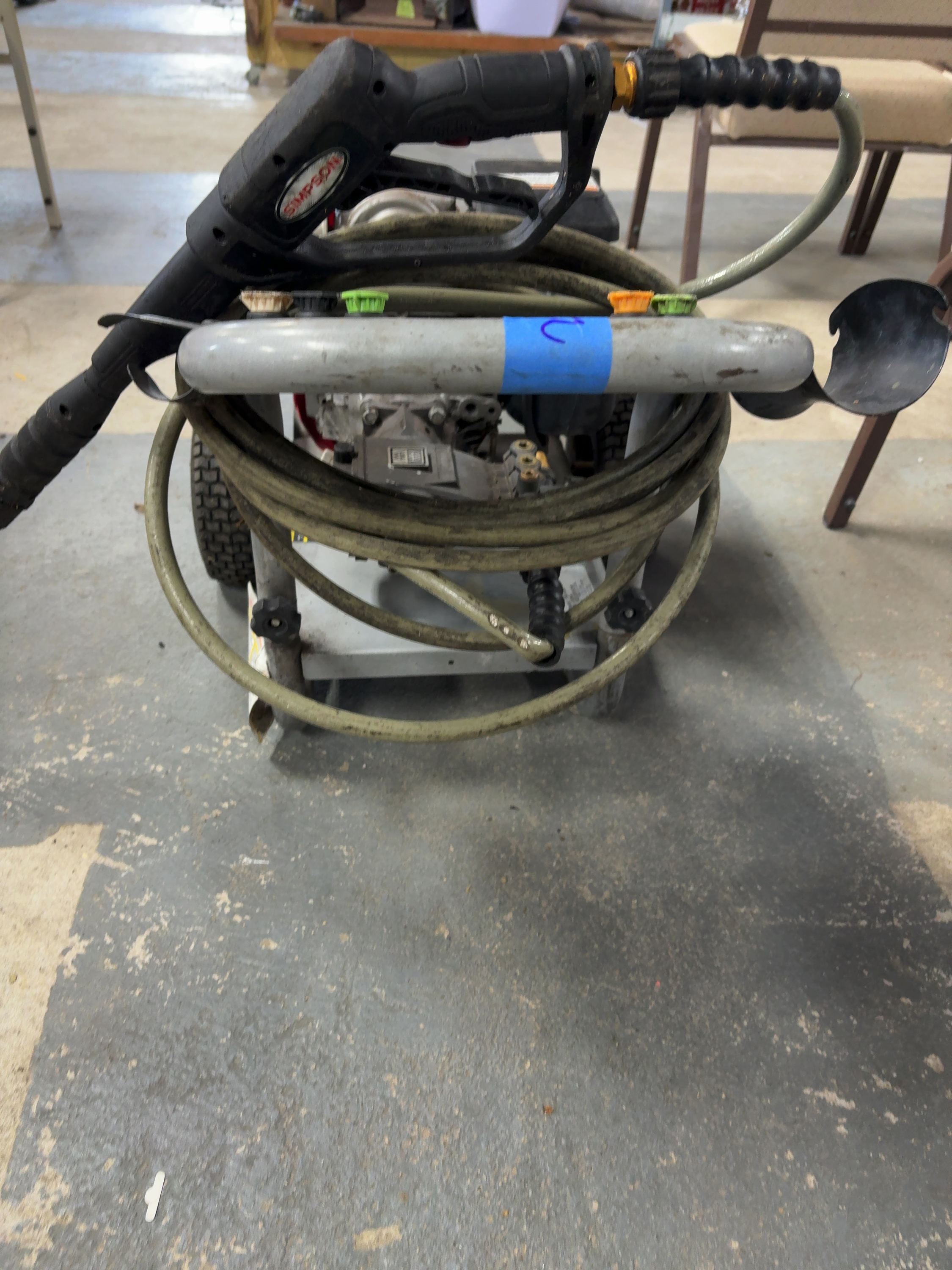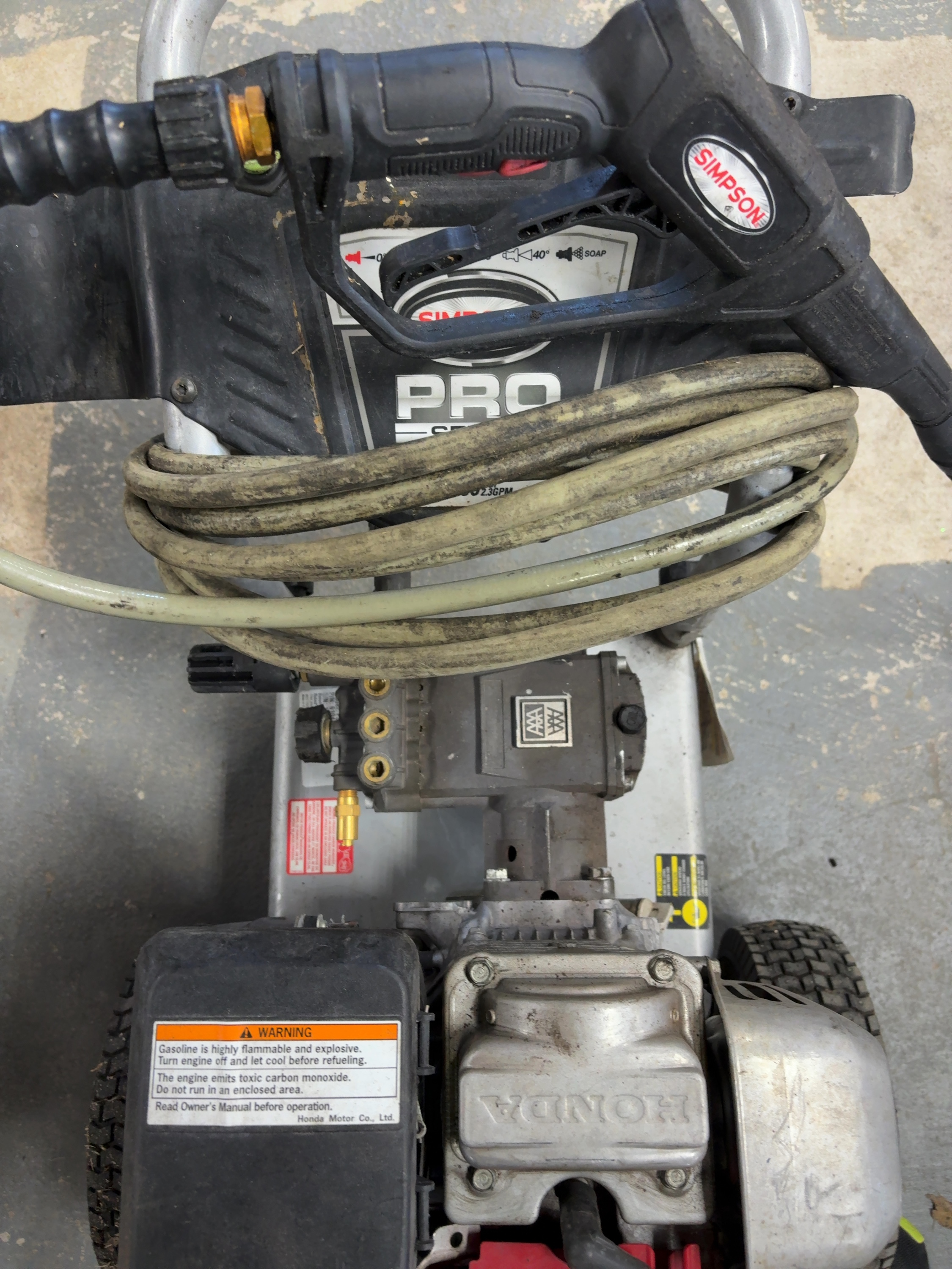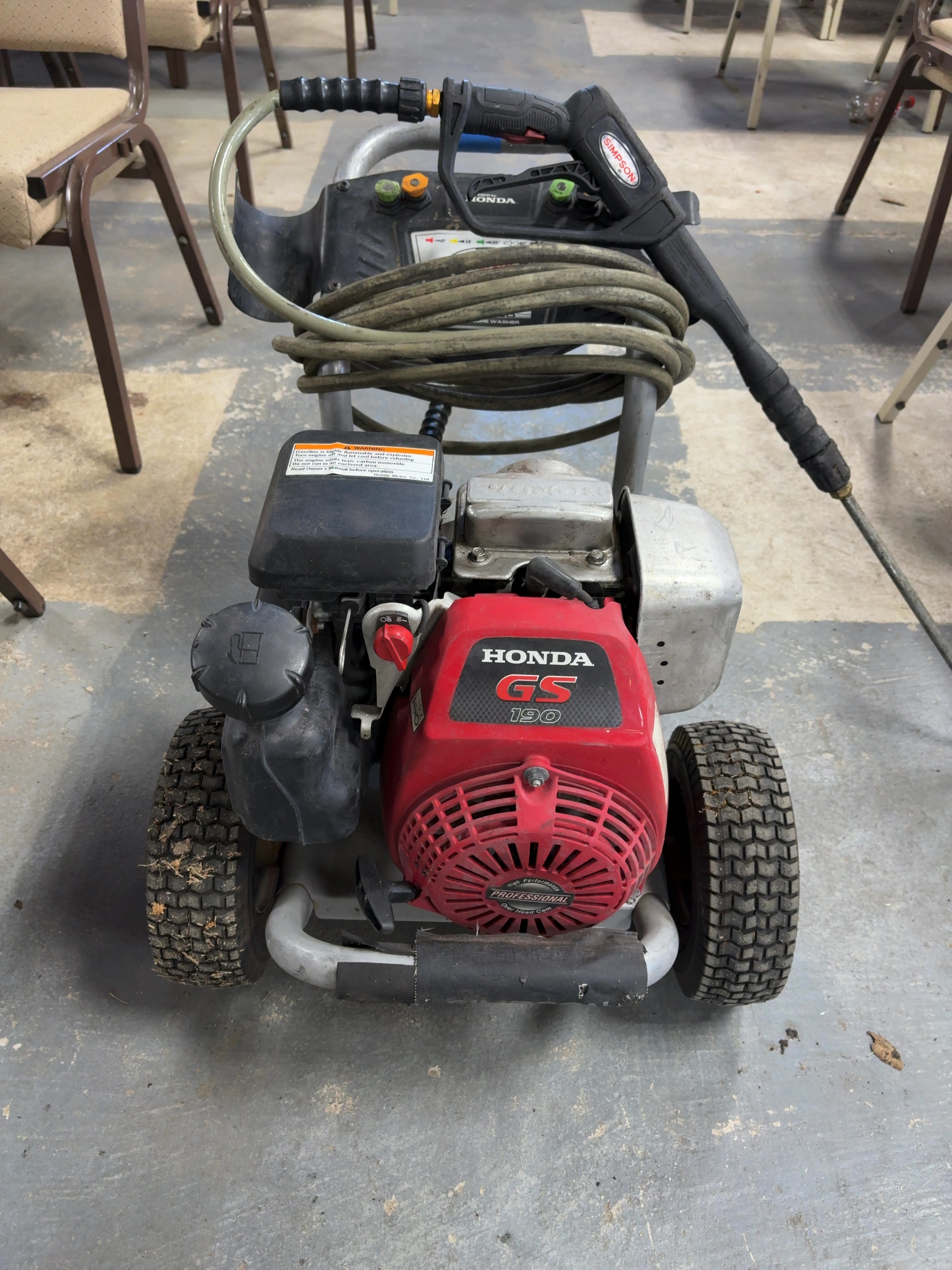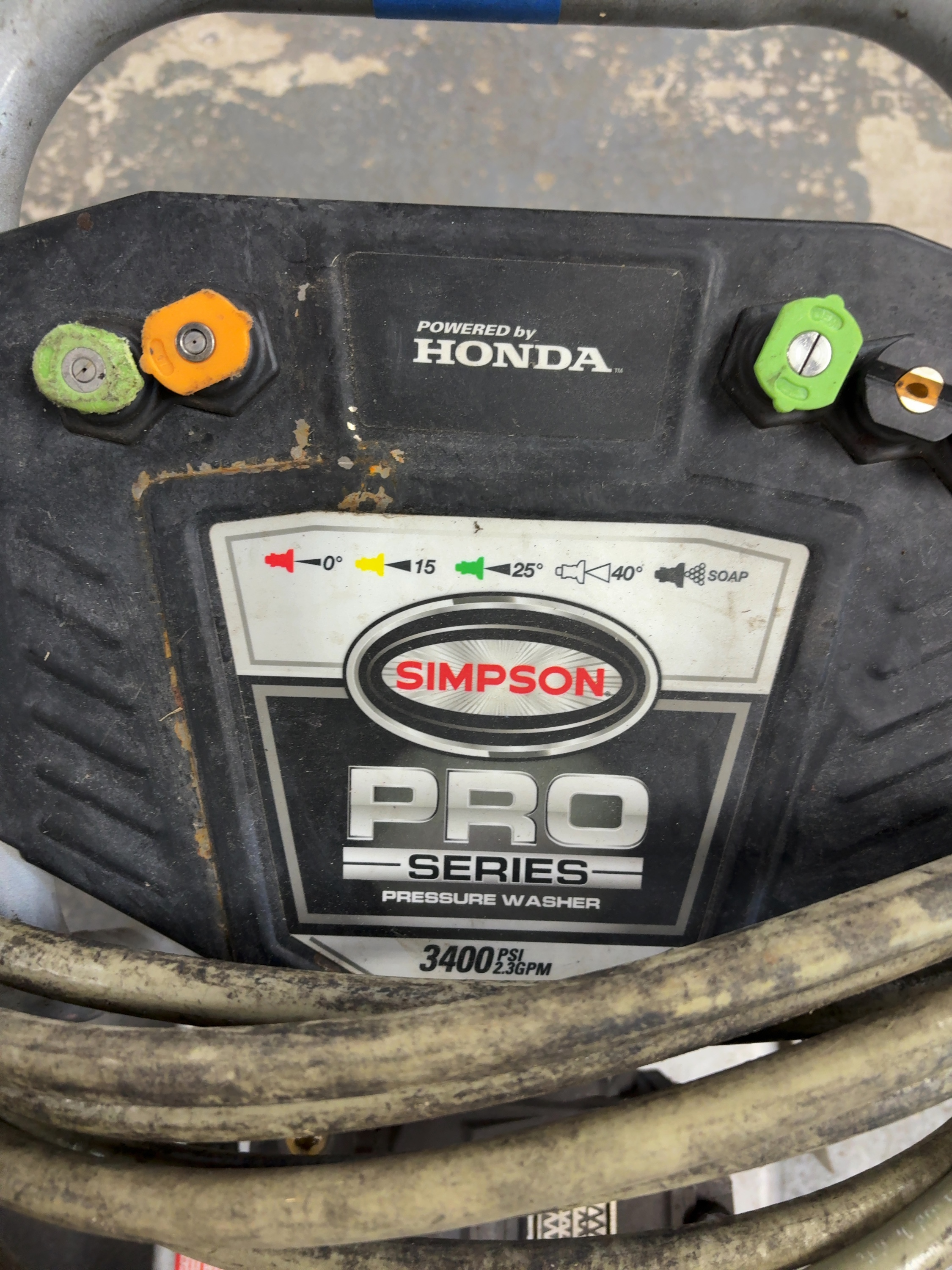 This Simpson Pro Series gas-powered cold water pressure washer, model PS61044, is equipped with a Honda GS 190 engine and an AAA triplex plunger pump. The unit is factory rated for 3400 PSI at 2.3 GPM. It is constructed on a silver powder-coated steel frame and features pneumatic tires. The washer includes a Simpson spray gun, a high-pressure hose, and four quick-connect nozzles for 0 degree, 15 degree, 25 degree, and soap applications. Visible labels confirm model number PS61044, part number 61044, and serial number 10233019298. The engine is a Honda GS series with an overhead cam design. The unit features integrated storage for accessories on the dashboard.