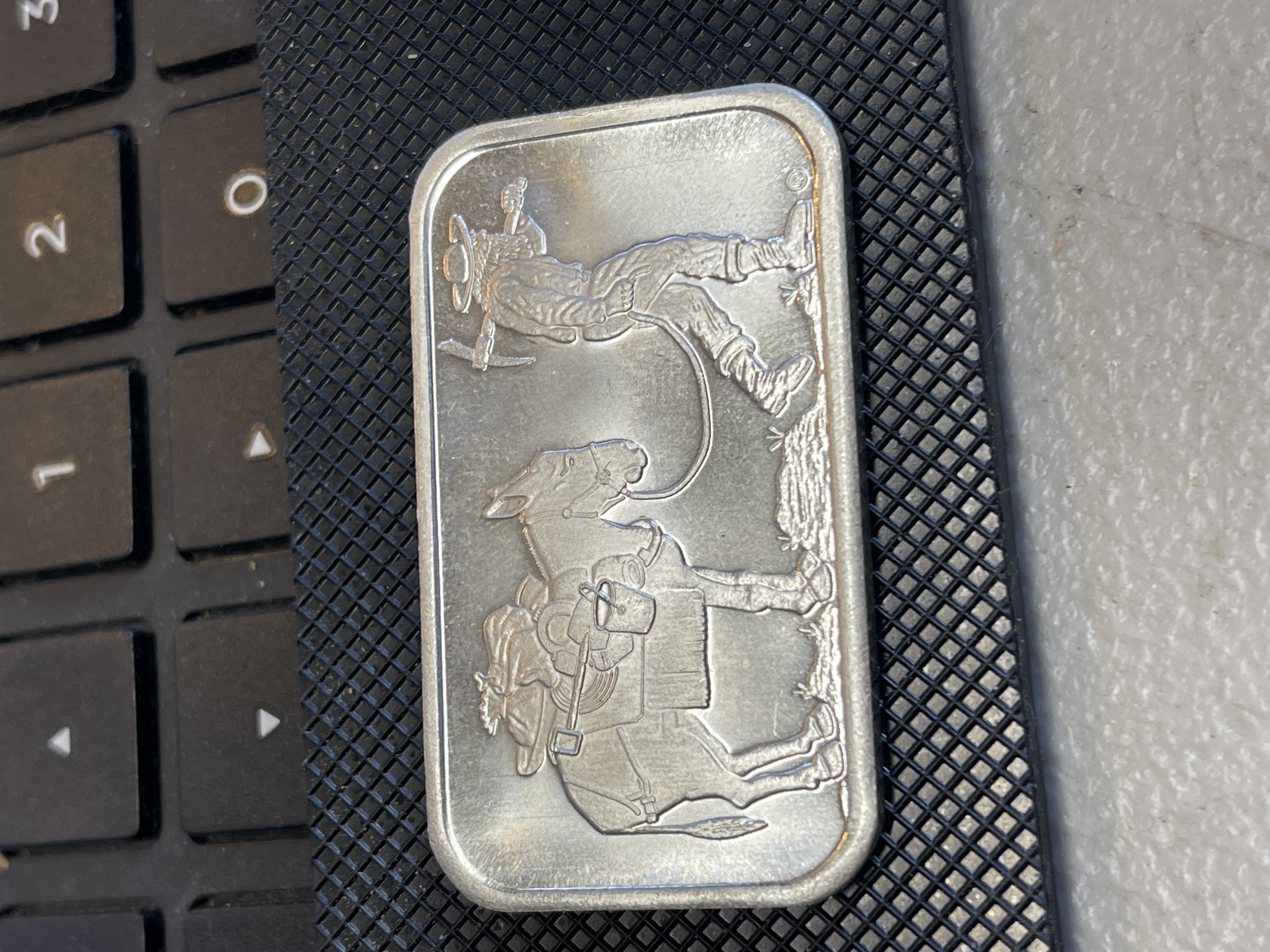 SILVER TOWN ONE OUNCE .999 BAR WITH GOLD MINER AND PACK MULE ON FRONT WEIGHT IT CORRECT AND CHECK OUT 100 AUTHENTIC ON THE SIGMA PURCHASE WITH CONFIDENCE