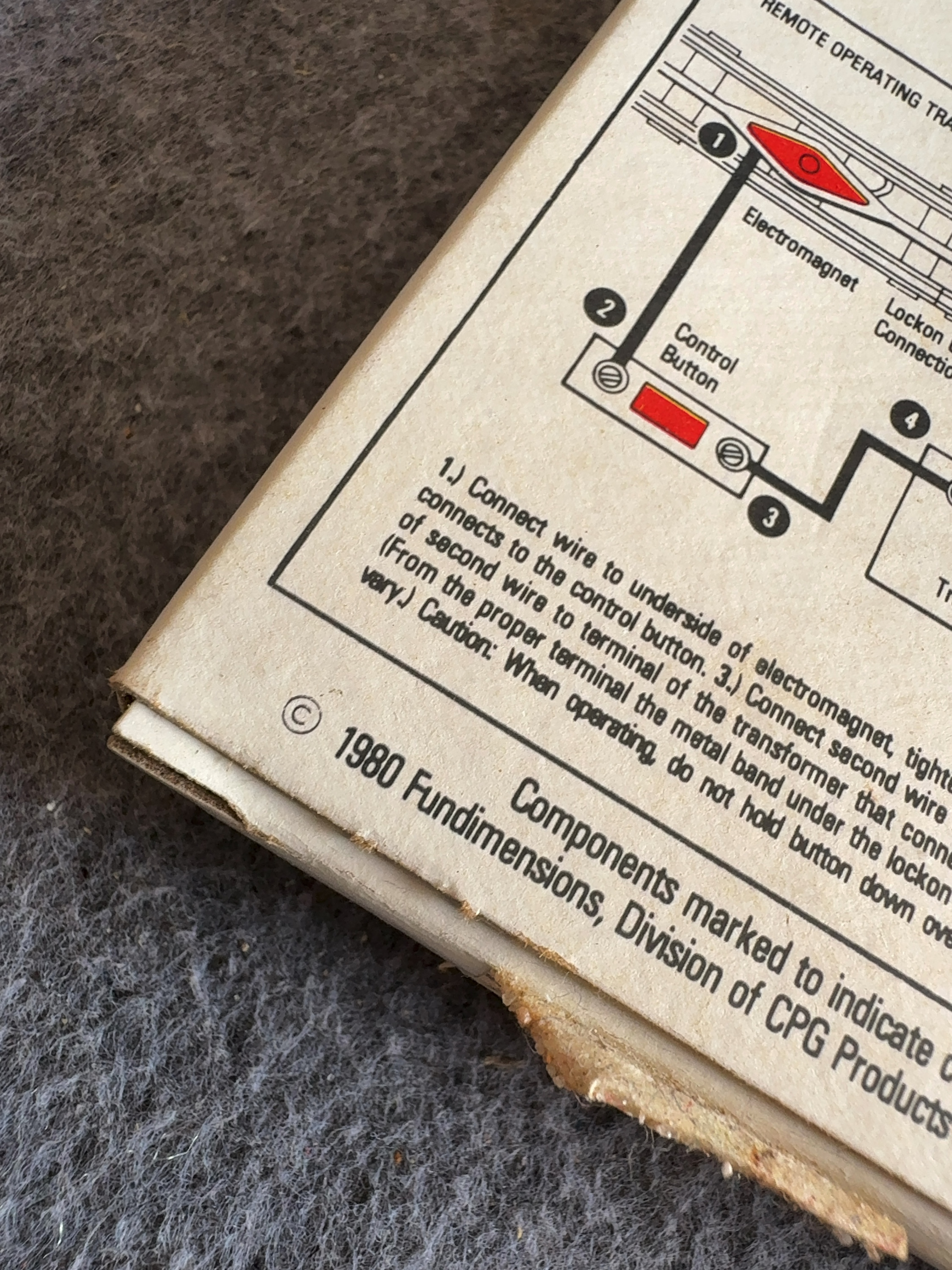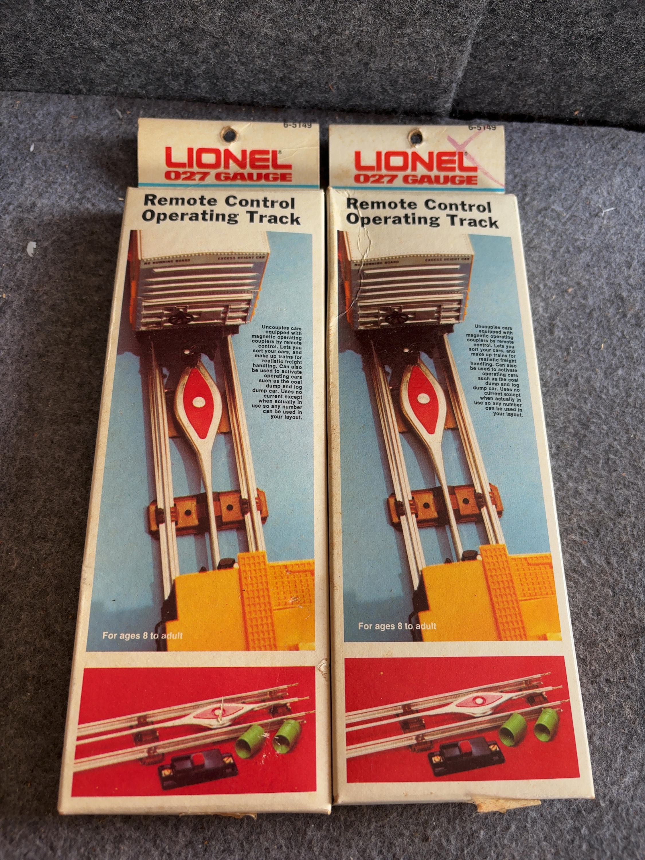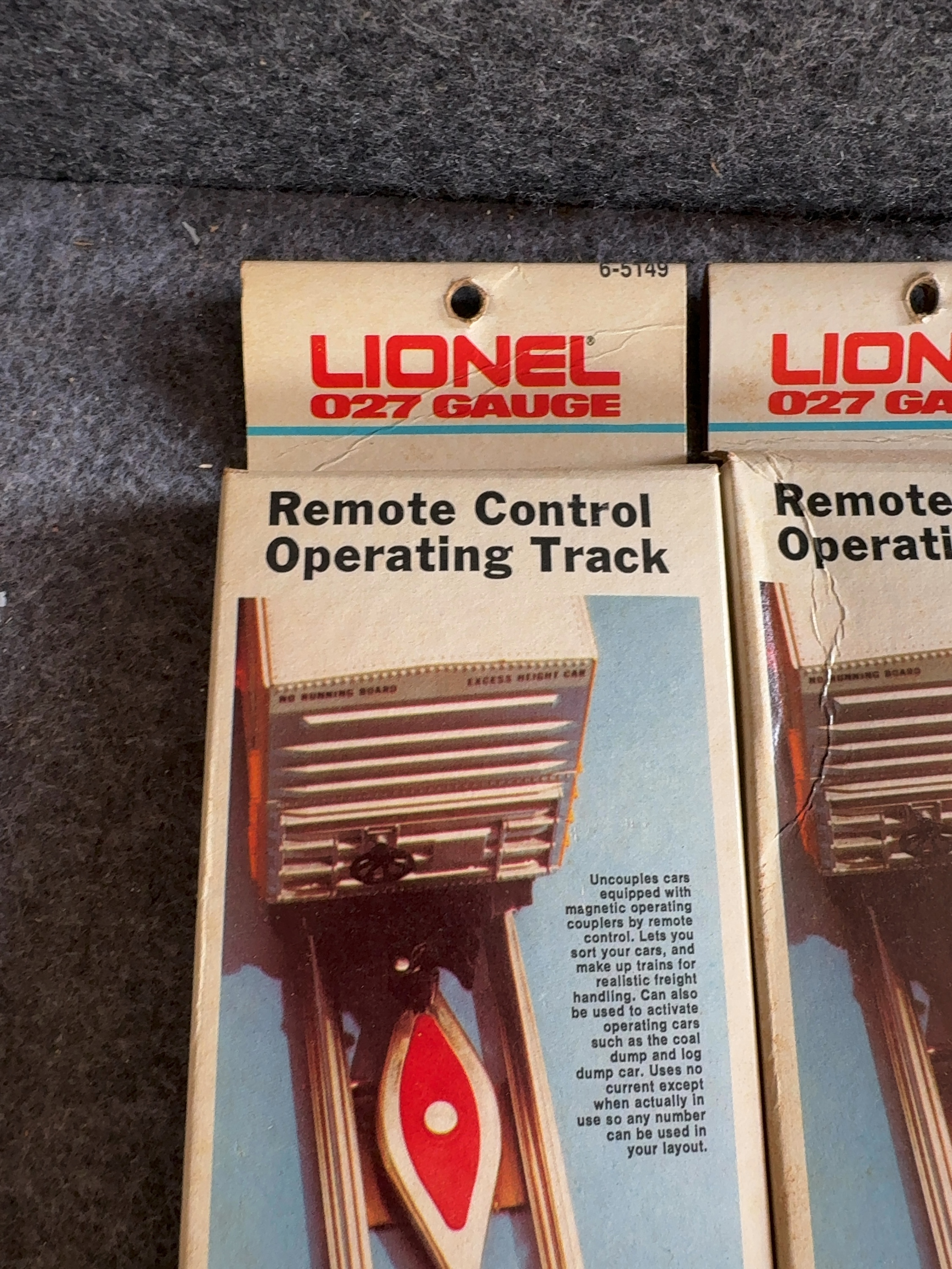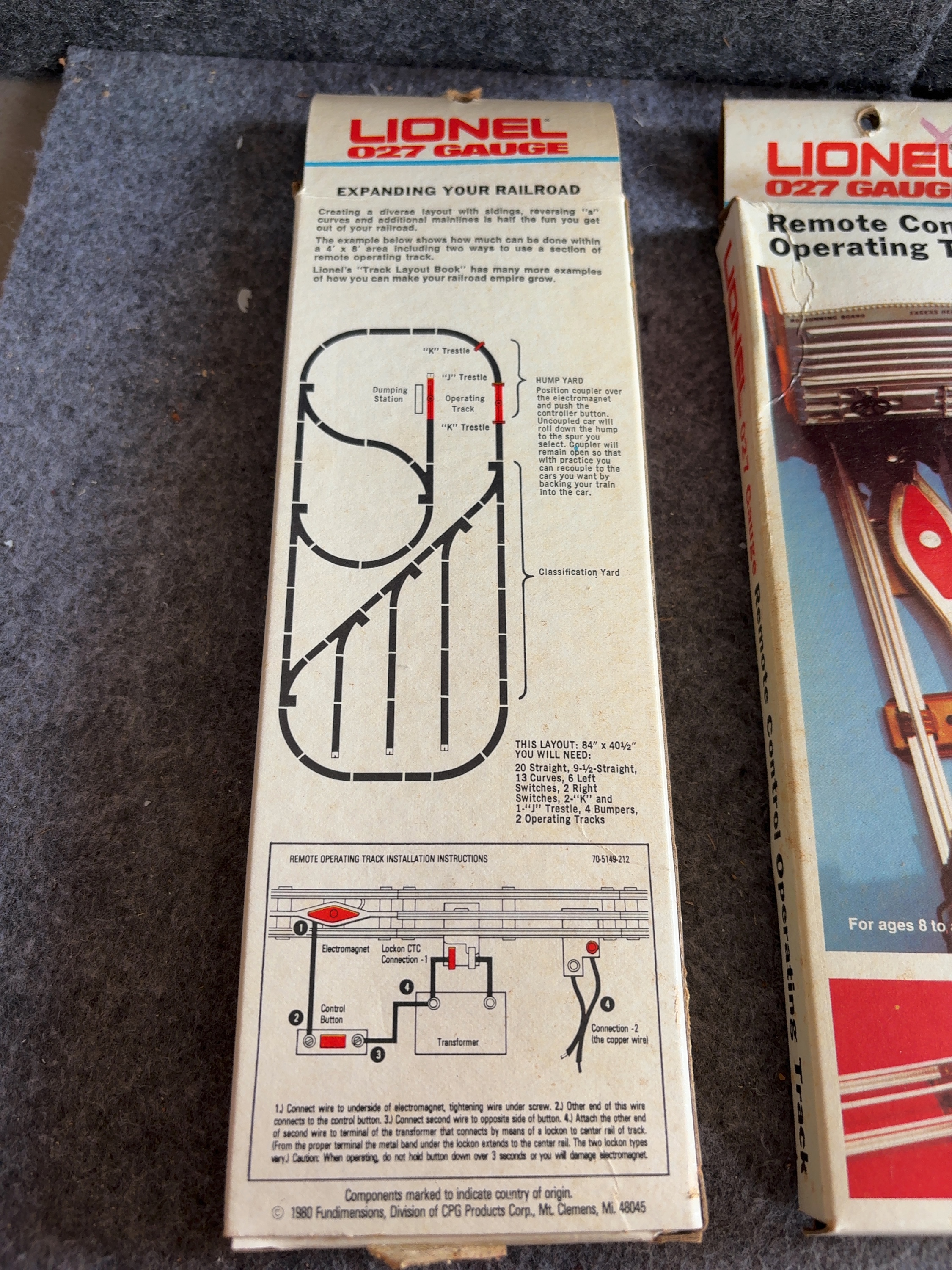 This lot consists of a pair of Lionel model 6-5149 Remote Control Operating Tracks designed for O27 gauge model train layouts. Manufactured by the Fundimensions division of CPG Products Corp. circa 1980, these units are constructed with metal rails and integrated electromagnetic components mounted on plastic bases. Each track section is designed to enable the remote uncoupling of railroad cars equipped with magnetic couplers or to activate the mechanisms of operating freight cars, such as coal dump or log cars. The items are contained within their original illustrated cardboard retail packaging. The reverse of the boxes features technical diagrams for layout expansion and step-by-step wiring instructions for installation. Printed markings on the boxes include the Lionel logo, the O27 gauge designation, and the model number 6-5149. The manufacturer attribution on the reverse reads: 1980 Fundimensions, Division of CPG Products Corp., Mt. Clemens, MI.
