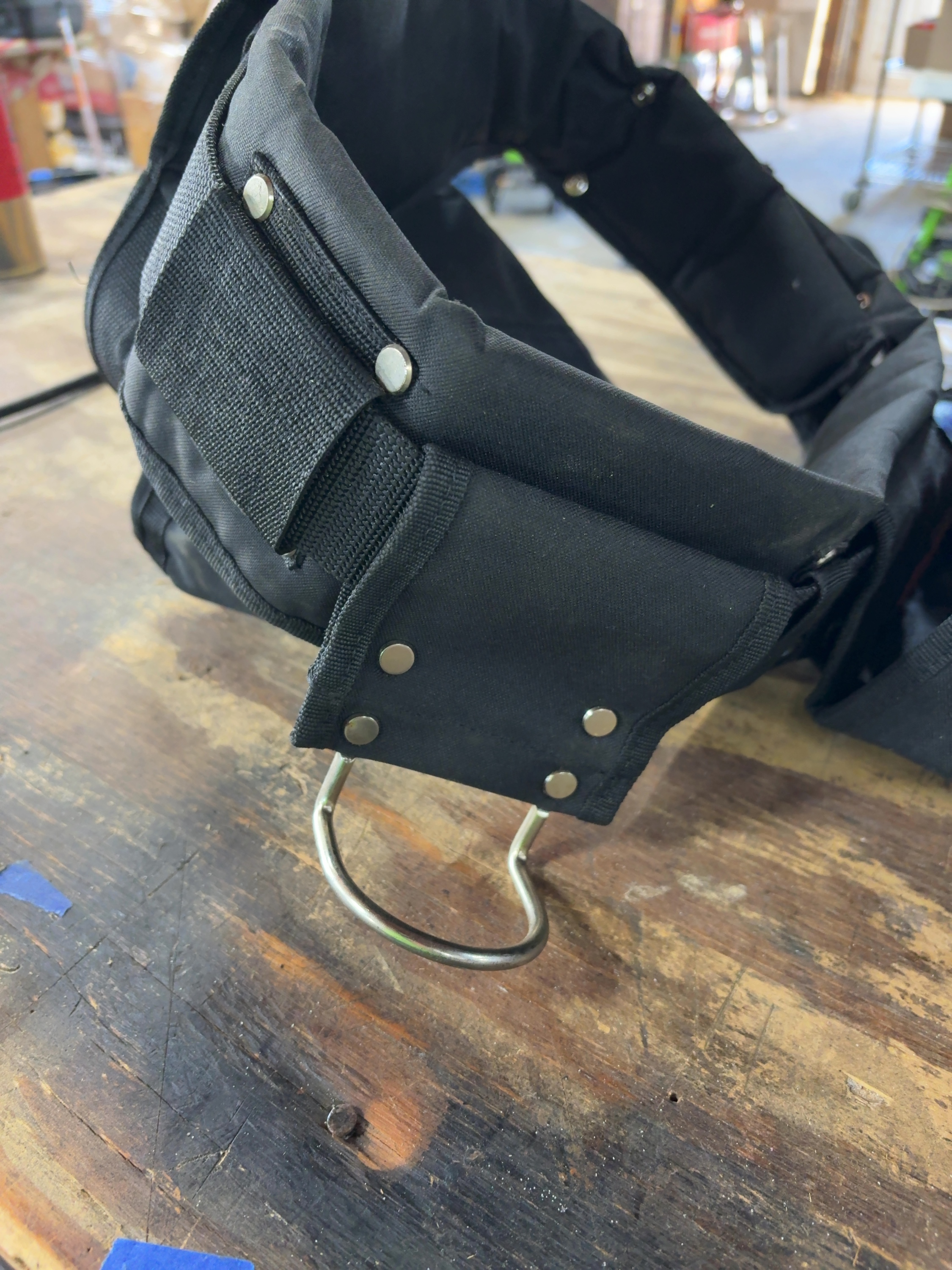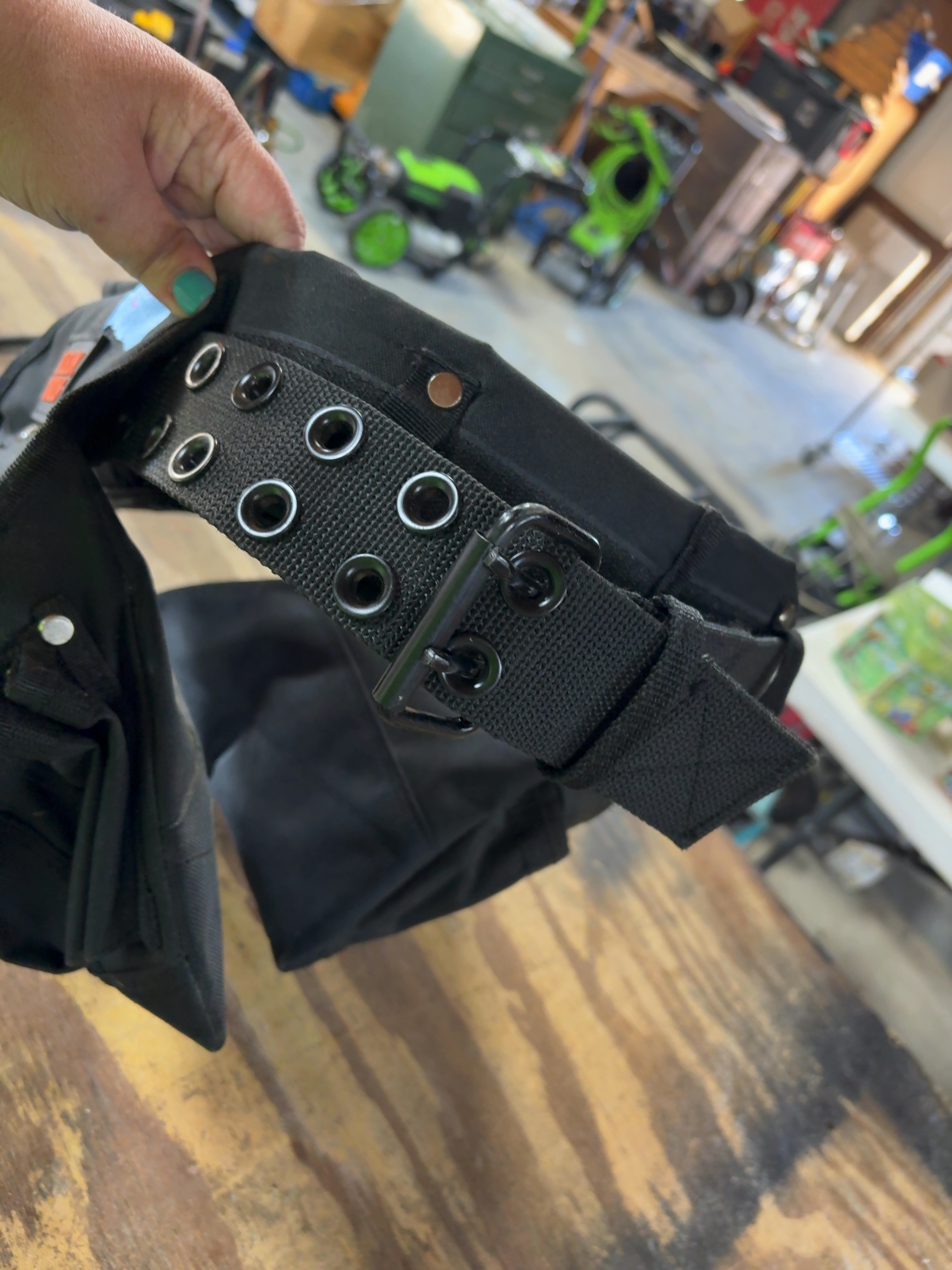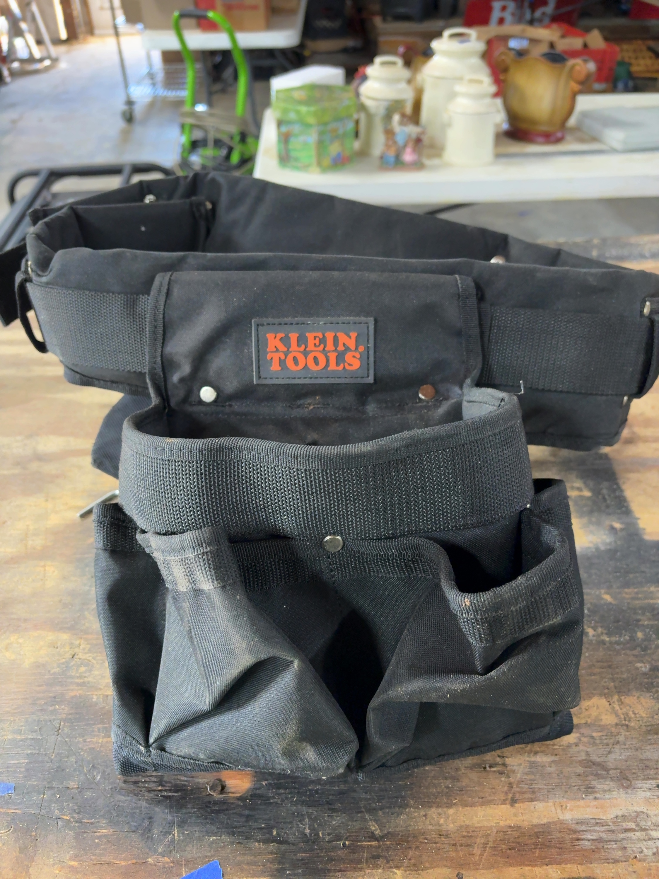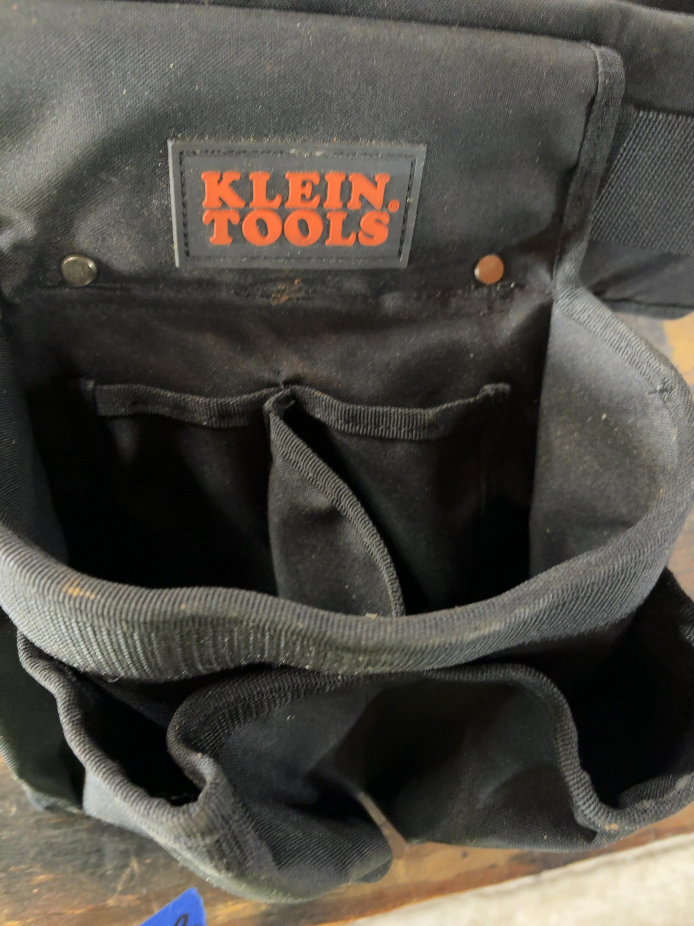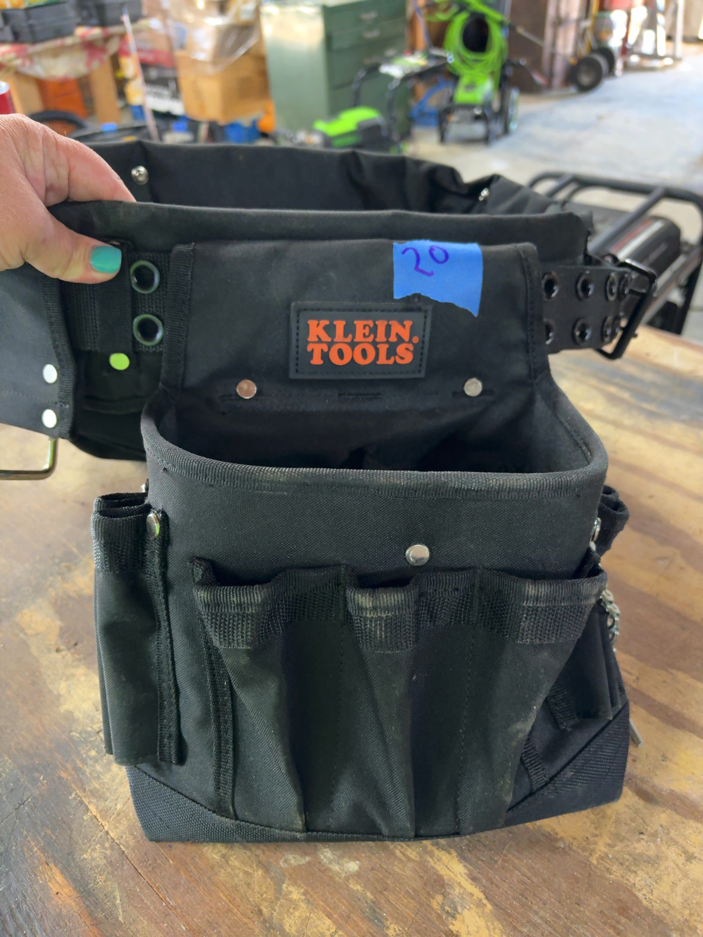 Professional-grade tool belt system manufactured by Klein Tools, designed for electrical and construction trade use. The assembly is constructed from heavy-duty black ballistic nylon reinforced with metal rivets at high-stress points. The system features a wide, padded waist belt for ergonomic support and a heavy-duty black nylon strap with a double-tongue metal buckle and dual rows of reinforced metal grommets for size adjustment. Included is a large multi-pocket tool pouch with tiered internal and external compartments and a dedicated chrome-finished metal hammer loop. The front of the pouch features a rectangular rubberized manufacturer’s patch with orange lettering on a black background reading KLEIN TOOLS. An interior white fabric tag contains a circular blue logo with the characters KLEIN TOOLS EST 1857 surrounding a central lineman graphic. A piece of blue painter’s tape with the handwritten number 20 is adhered to the top of the pouch.
