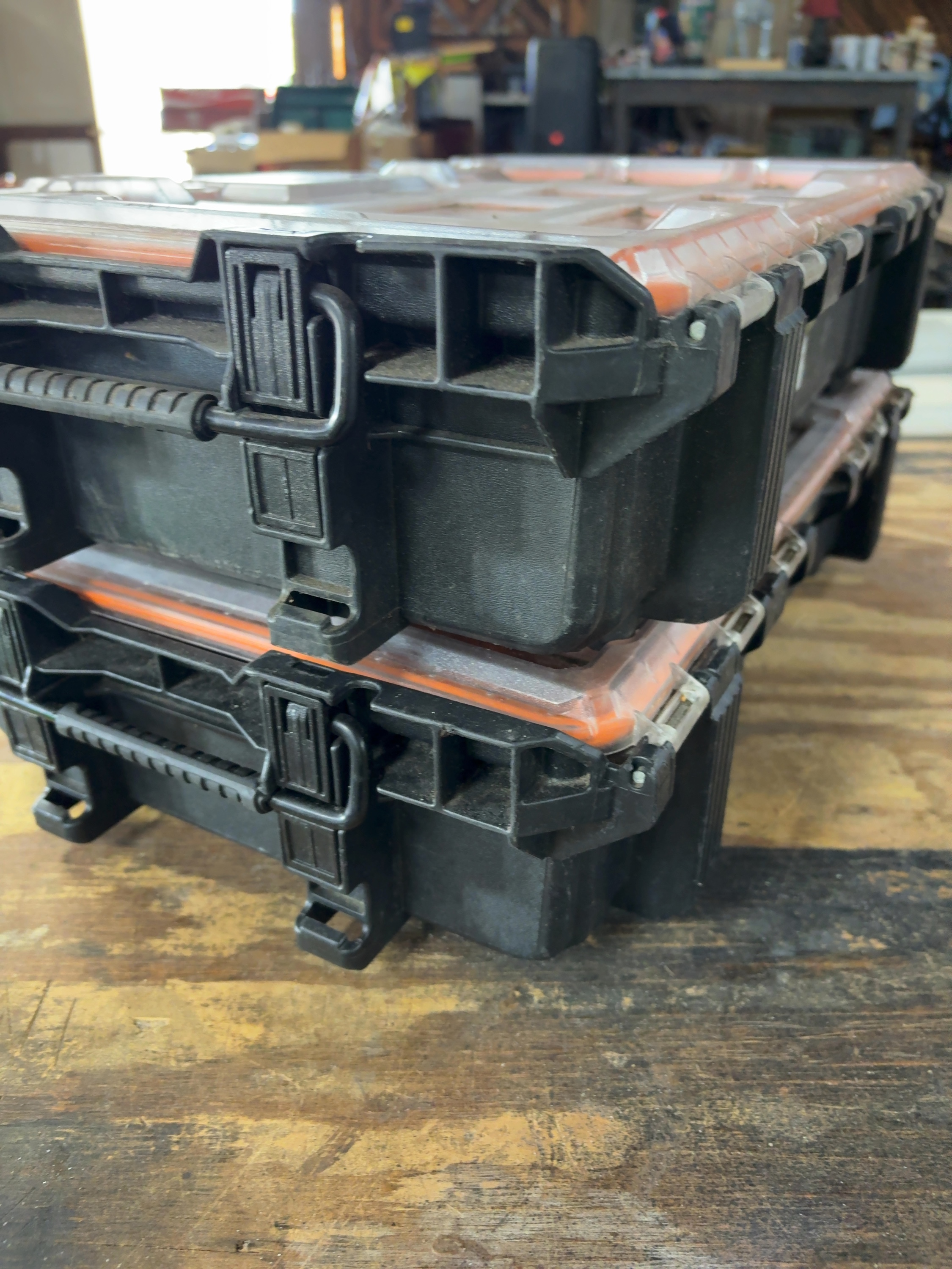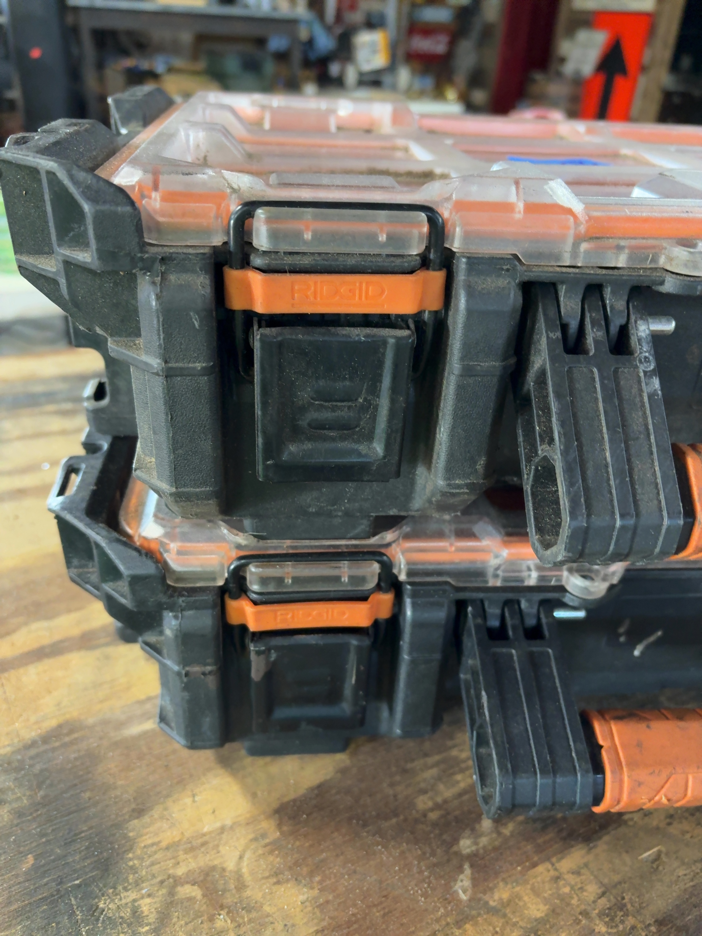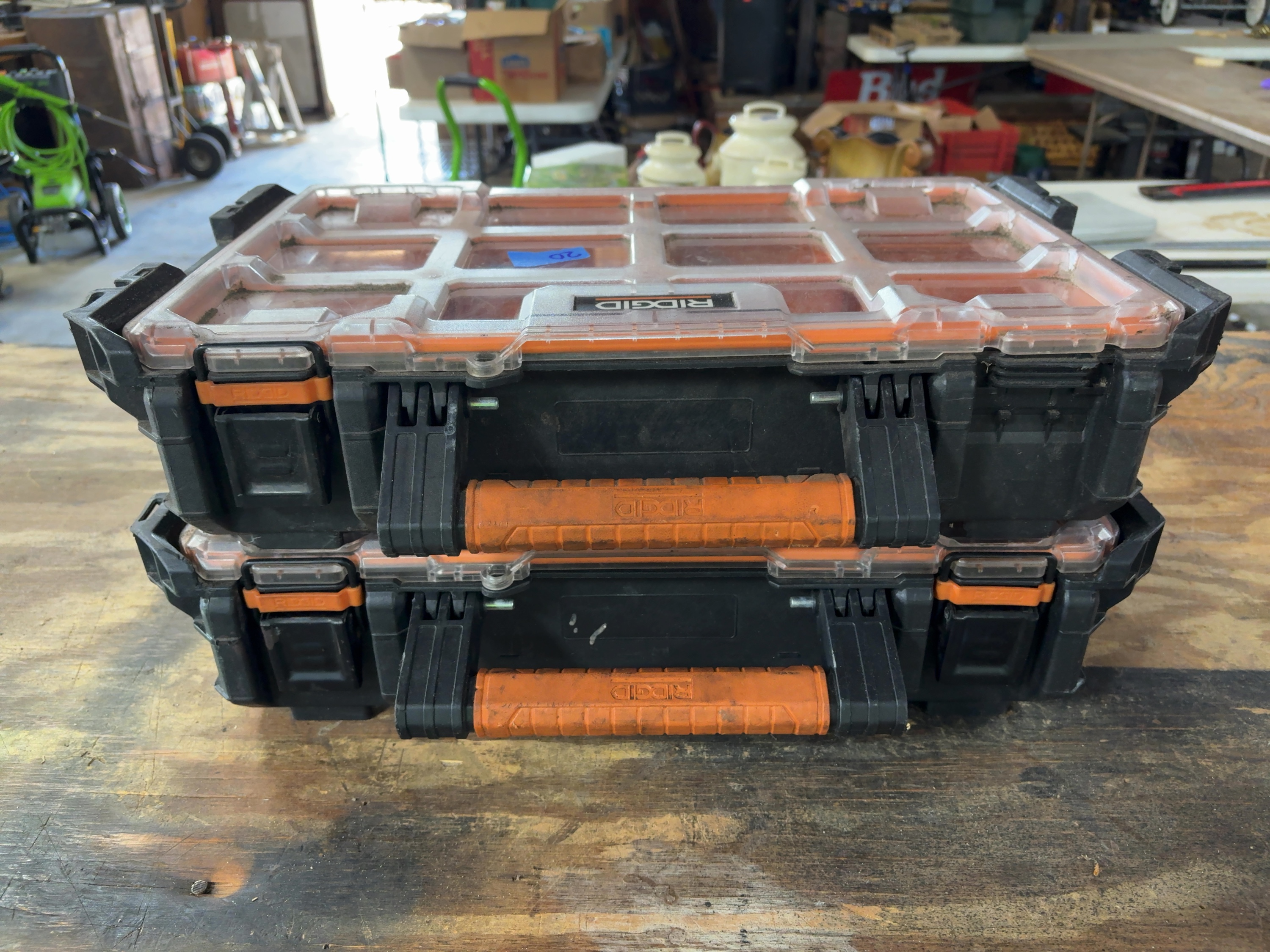 A Pair of RIDGID Pro Gear System Gen 2.0 Stackable Small Parts Organizers with Plumbing Hardware