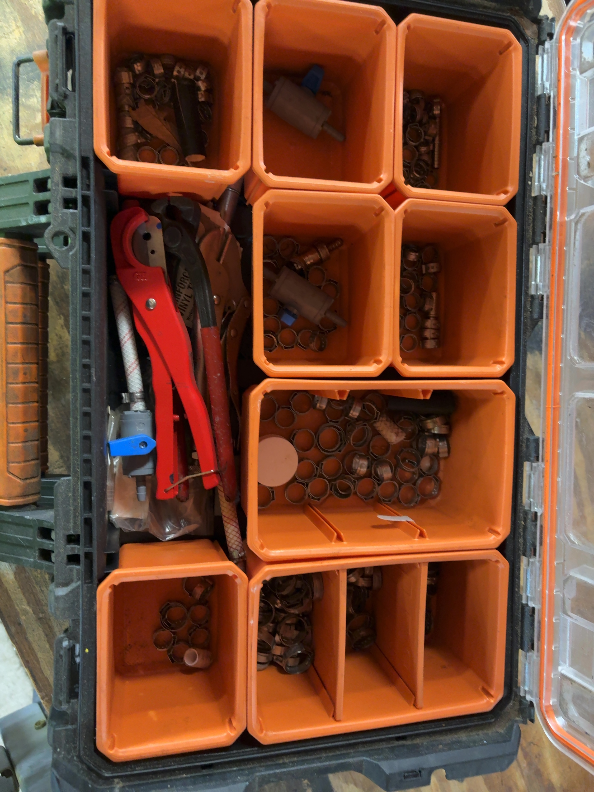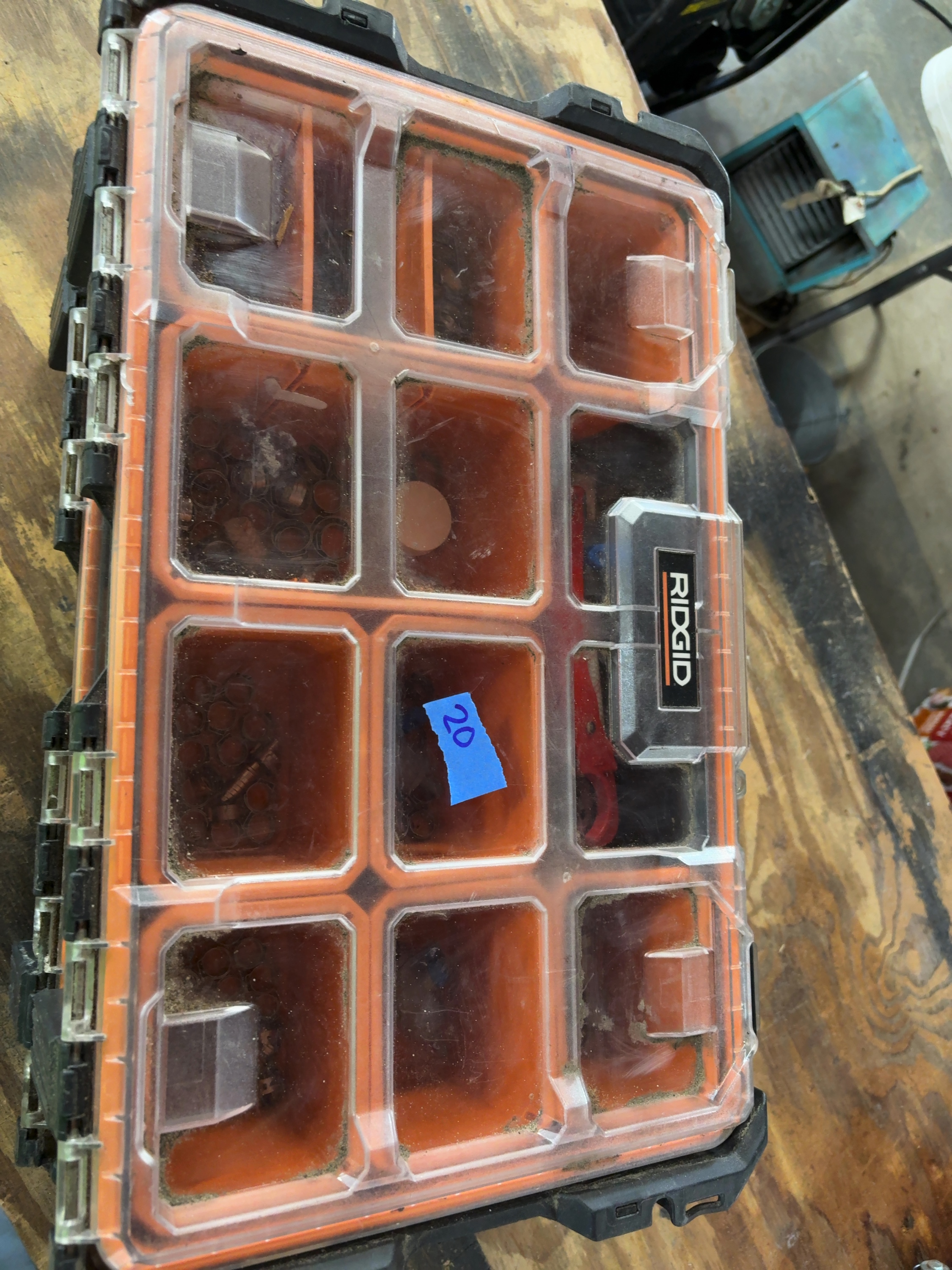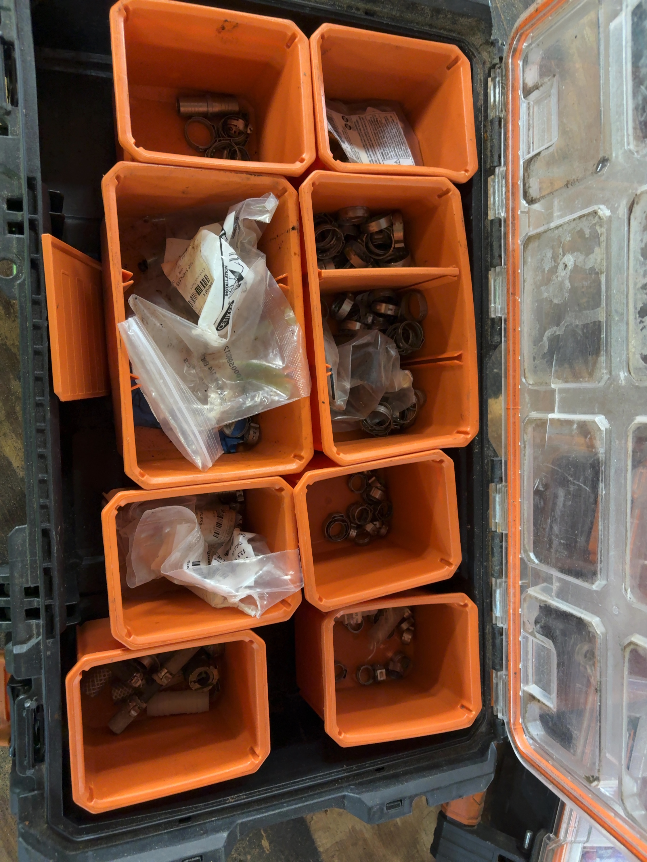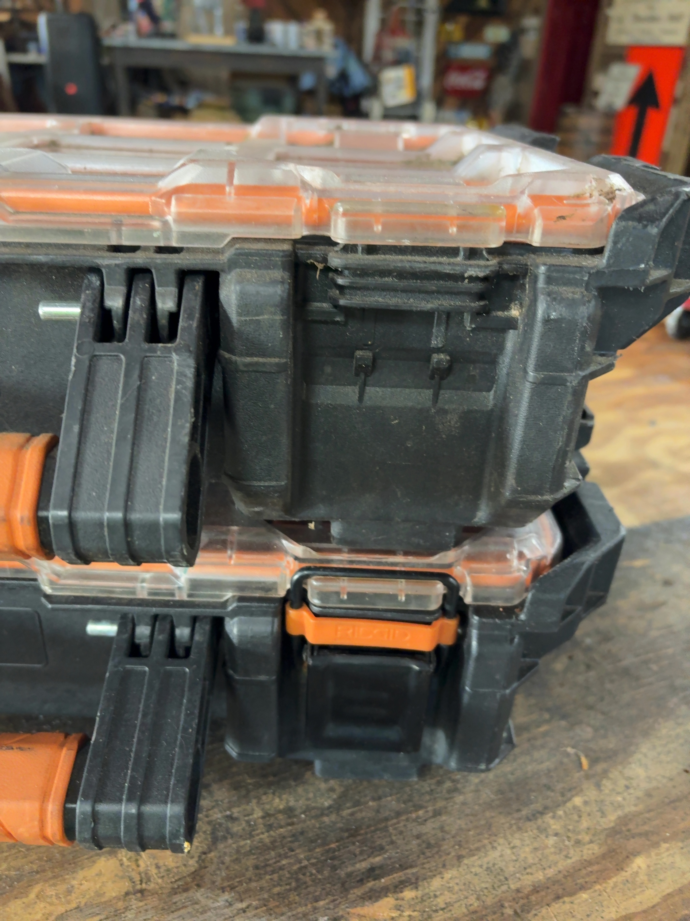 A Pair of RIDGID Pro Gear System Gen 2.0 Stackable Small Parts Organizers with Plumbing Hardware