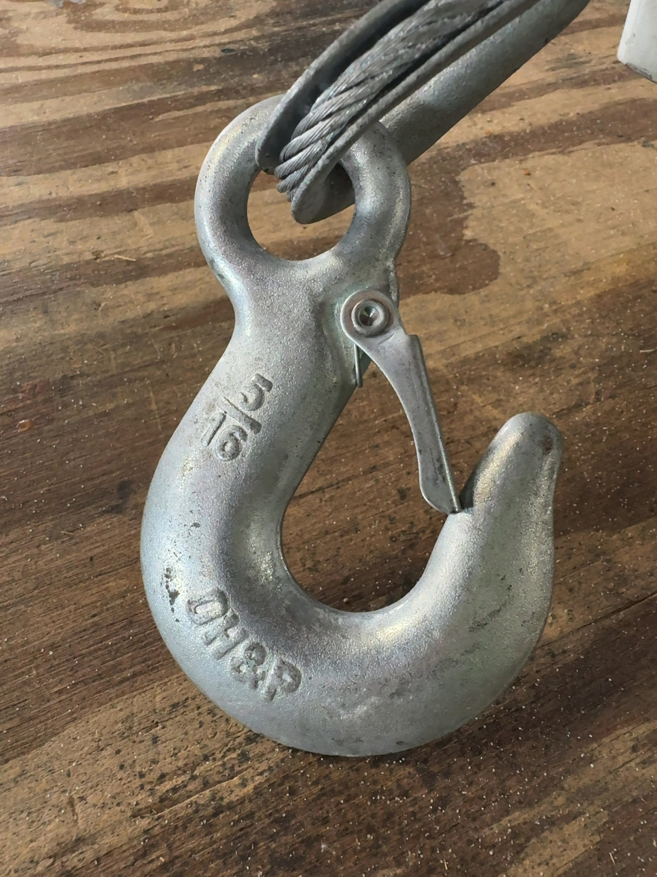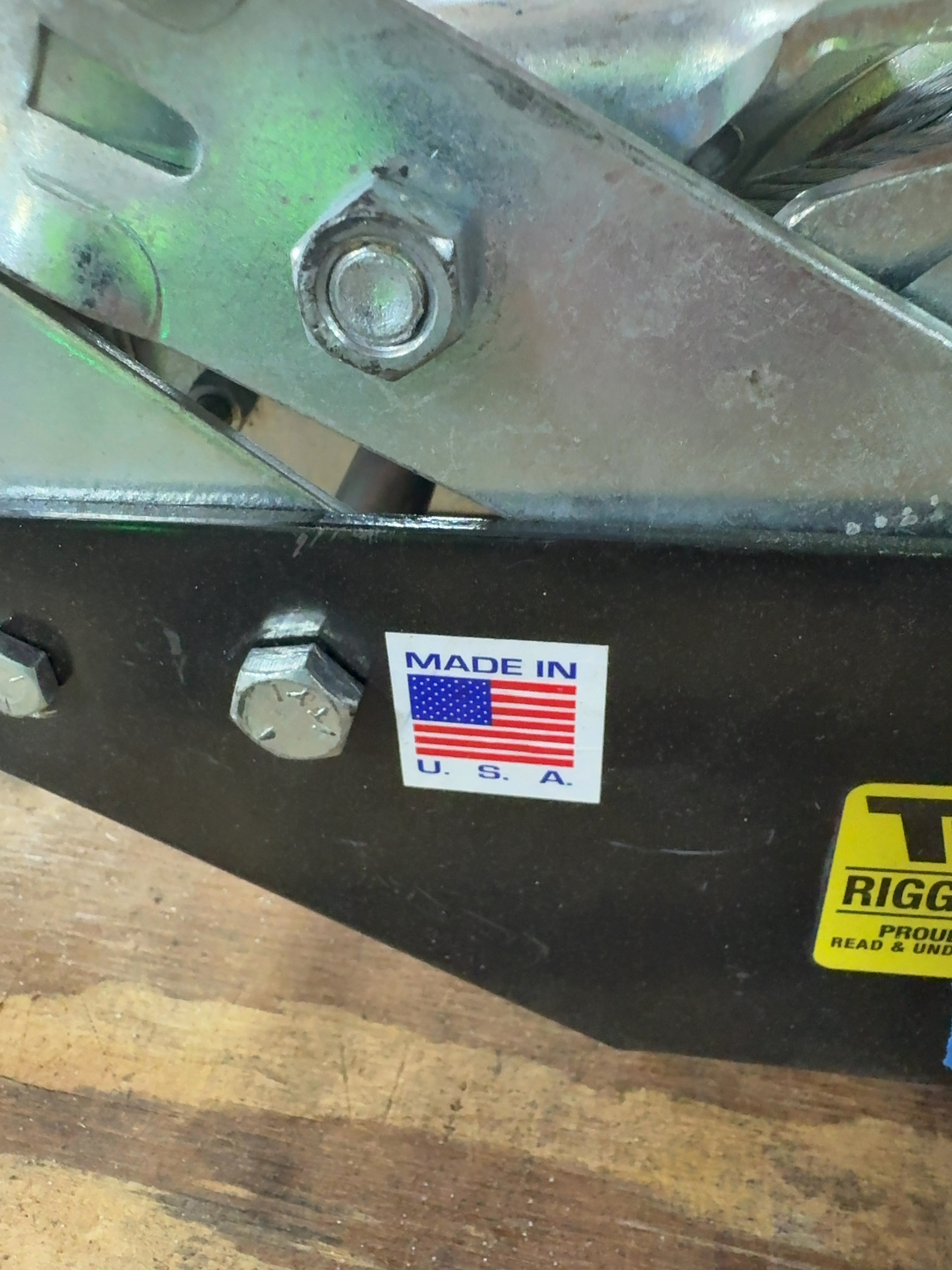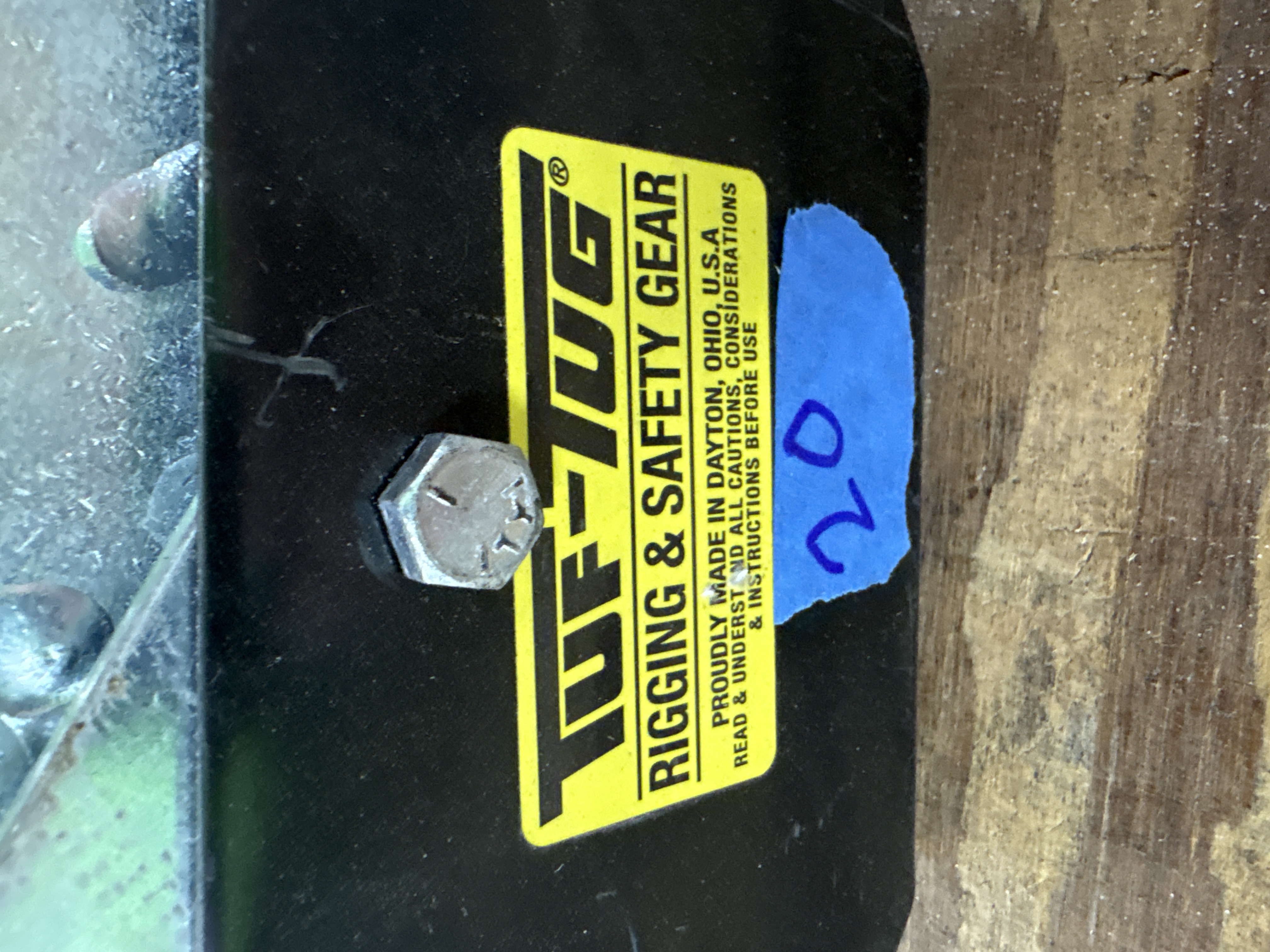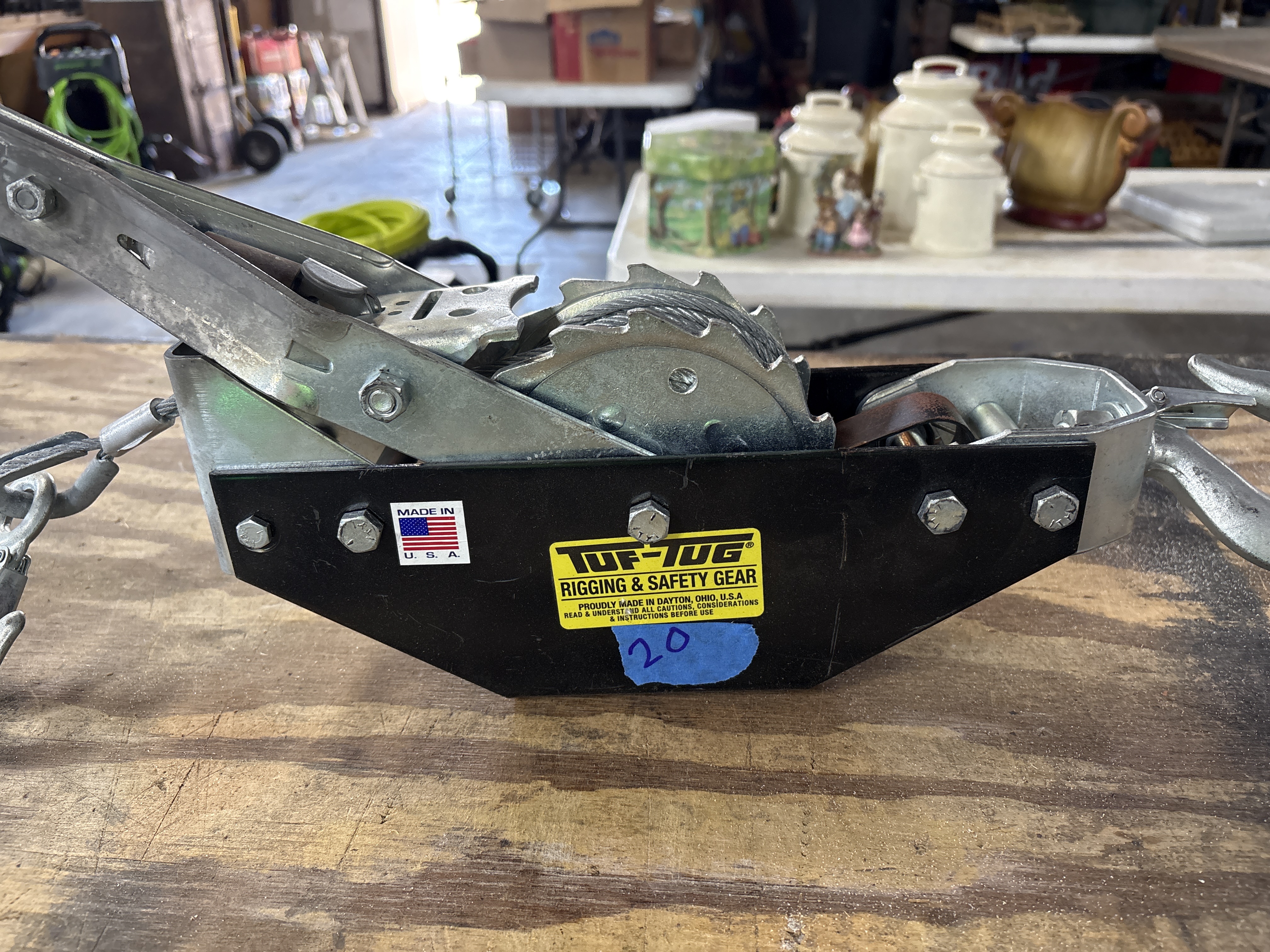 Tuf-Tug Rigging & Safety Gear manual cable puller, commonly known as a come-along, designed for professional-grade lifting and rigging. The tool features a heavy-gauge black-coated steel frame and galvanized steel internal components. It utilizes a double-ratchet drive mechanism to wind a steel wire cable onto a central spool. The unit is equipped with two drop-forged steel hooks, each fitted with a spring-loaded safety latch. The long-reach handle is finished with a black foam non-slip grip. A yellow and black manufacturer label on the frame reads TUF-TUG RIGGING & SAFETY GEAR and includes the text PROUDLY MADE IN DAYTON, OHIO, U.S.A. An additional sticker features the U.S. flag and states MADE IN U.S.A. The cable hook is embossed with 5/16 and OH&P. The body-mounted swivel hook is embossed with OH&P. A piece of blue painter’s tape with the handwritten number 20 is adhered to the side.