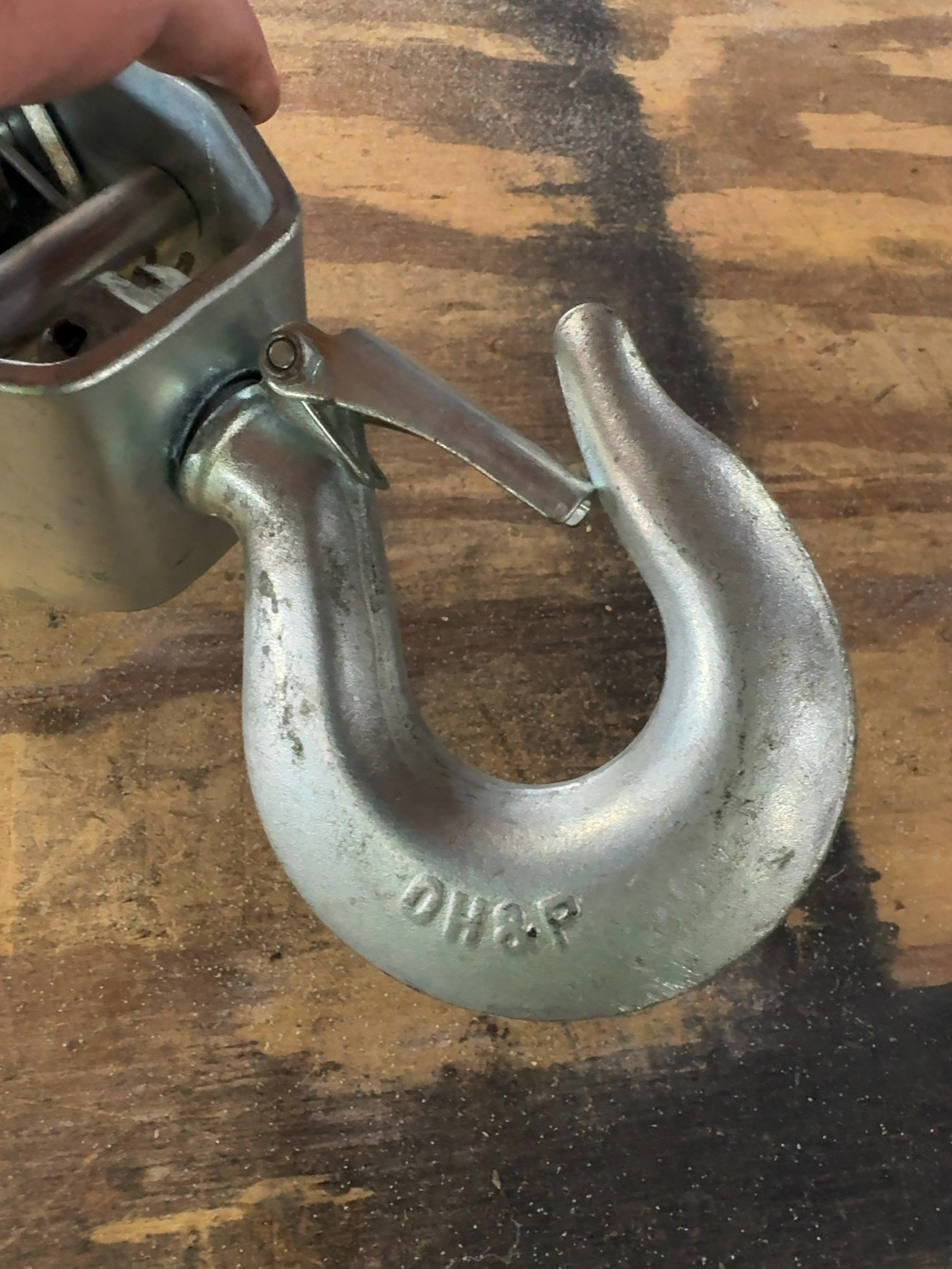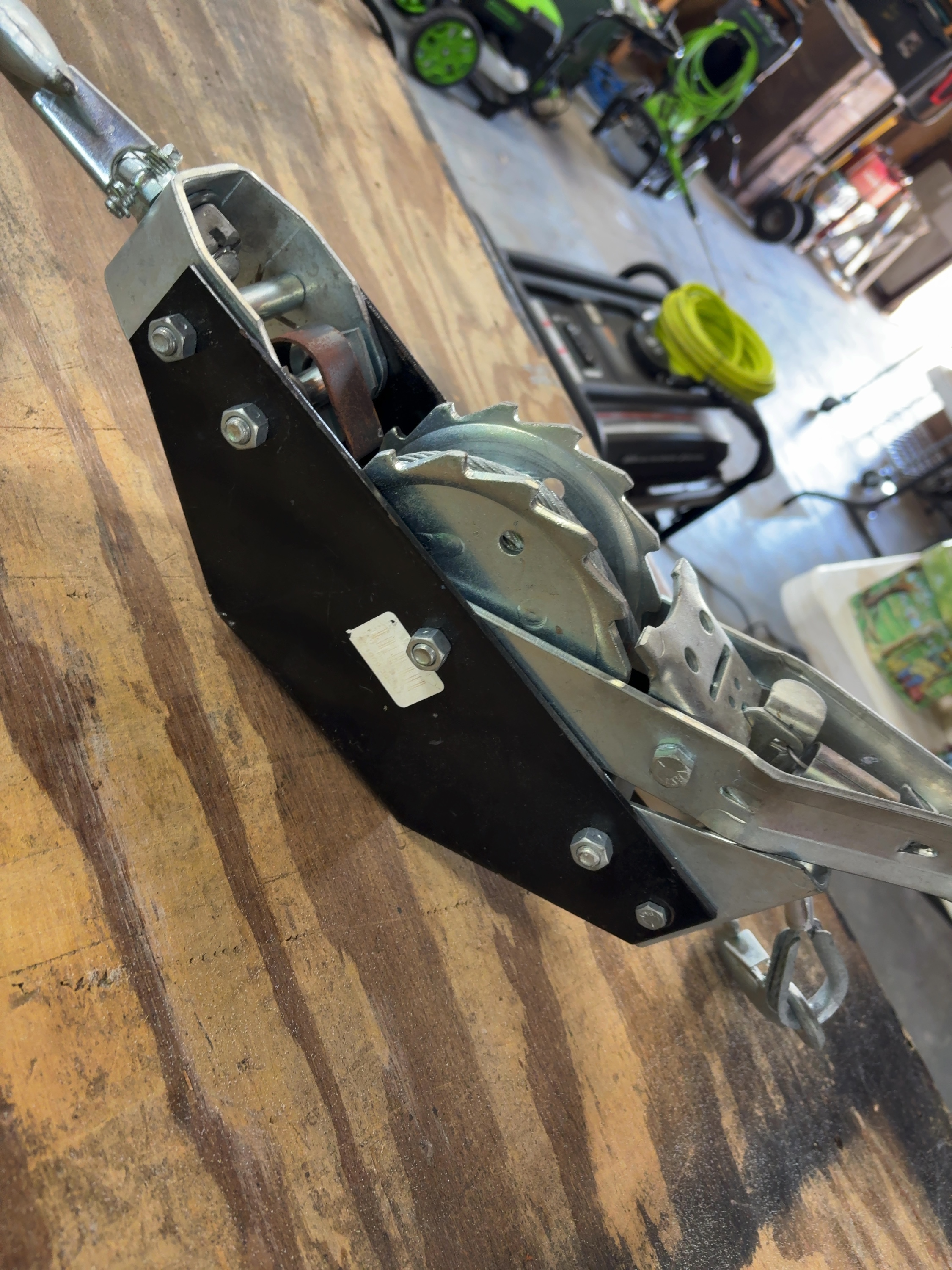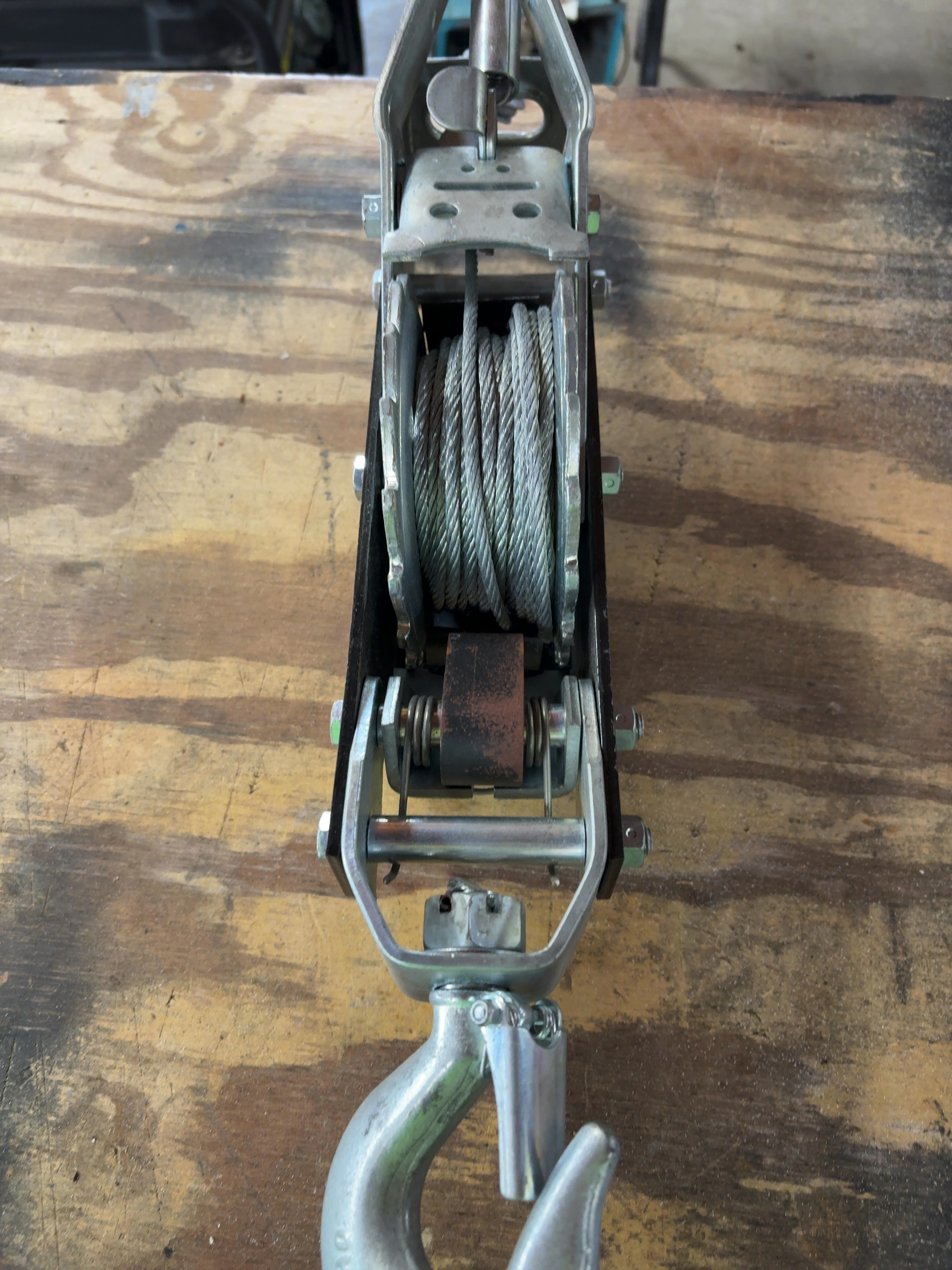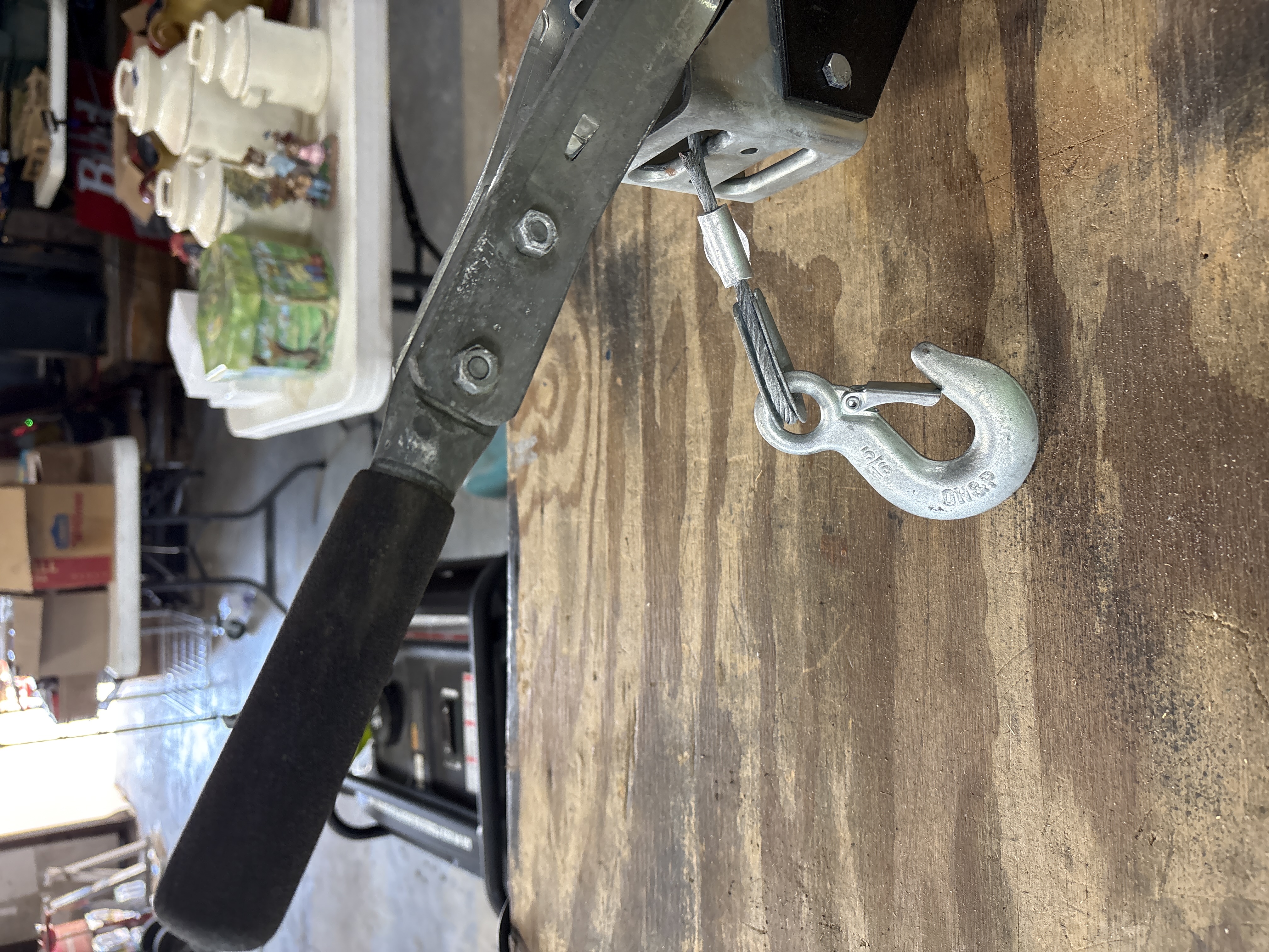 Tuf-Tug Rigging & Safety Gear manual cable puller, commonly known as a come-along, designed for professional-grade lifting and rigging. The tool features a heavy-gauge black-coated steel frame and galvanized steel internal components. It utilizes a double-ratchet drive mechanism to wind a steel wire cable onto a central spool. The unit is equipped with two drop-forged steel hooks, each fitted with a spring-loaded safety latch. The long-reach handle is finished with a black foam non-slip grip. A yellow and black manufacturer label on the frame reads TUF-TUG RIGGING & SAFETY GEAR and includes the text PROUDLY MADE IN DAYTON, OHIO, U.S.A. An additional sticker features the U.S. flag and states MADE IN U.S.A. The cable hook is embossed with 5/16 and OH&P. The body-mounted swivel hook is embossed with OH&P. A piece of blue painter’s tape with the handwritten number 20 is adhered to the side.
