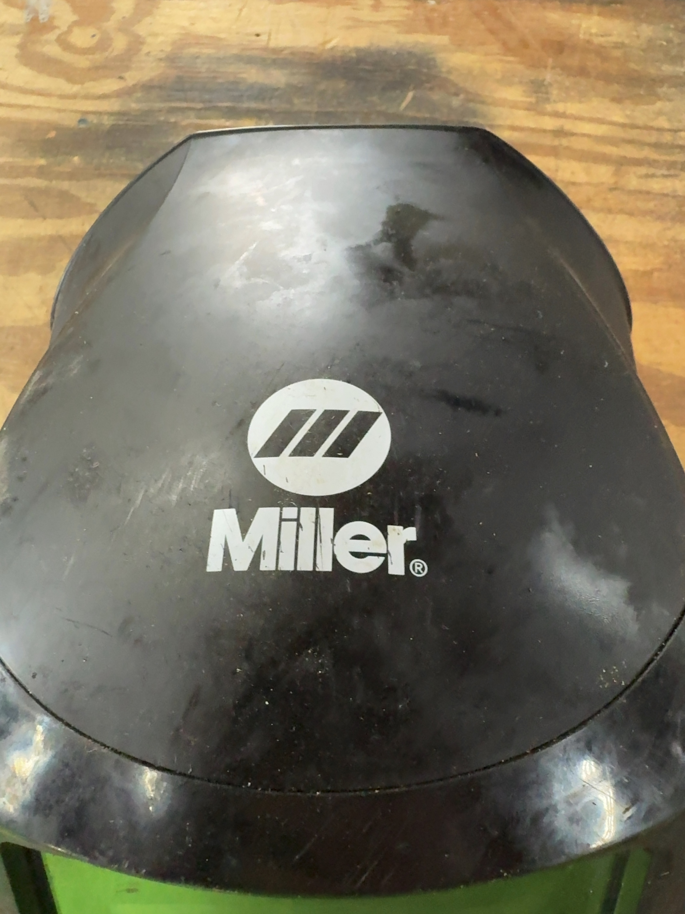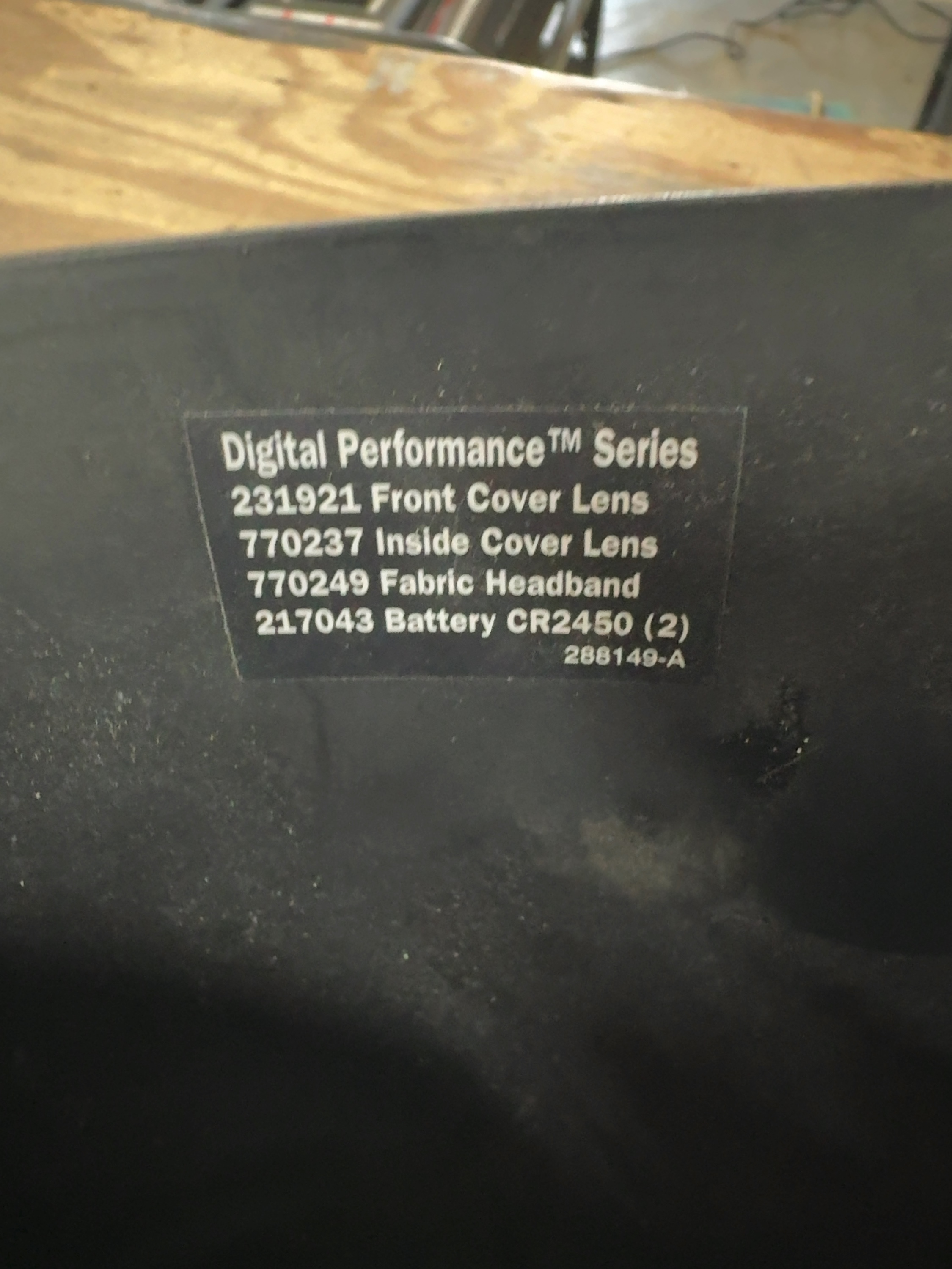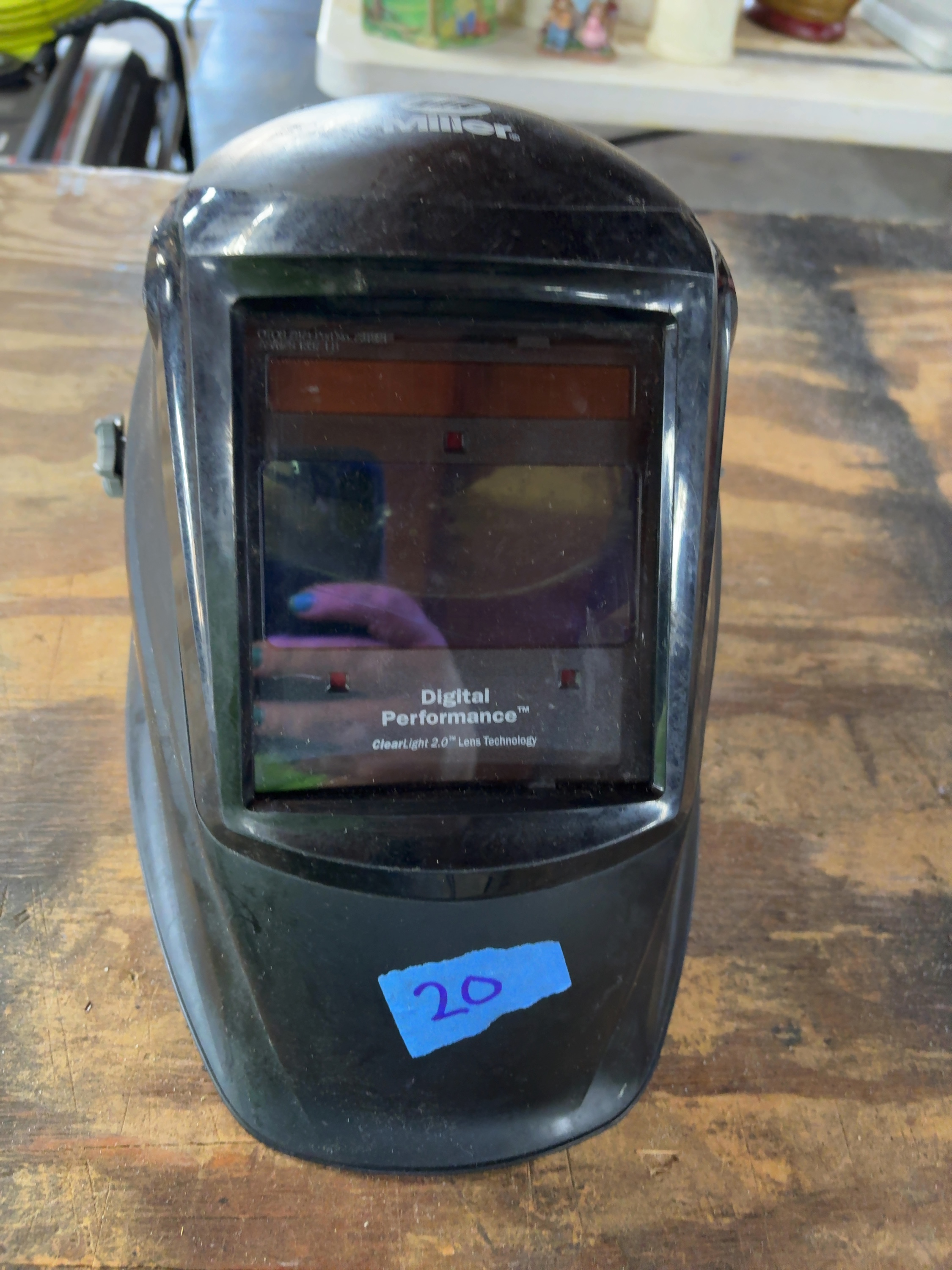 This lot consists of a used Miller Digital Performance series welding helmet featuring ClearLight 2.0 auto-darkening lens technology. The exterior black plastic shell displays the Miller brand logo on the forehead area. The helmet is equipped with an internal digital interface for adjusting shade, delay, and sensitivity settings, including operational modes for welding, cutting, and grinding. The interior features an adjustable headgear assembly with a blue adjustment knob and a grey perforated foam brow pad. A manufacturer label located on the interior provides replacement part numbers for the front cover lens (231921), inside cover lens (770237), fabric headband (770249), and CR2450 batteries (217043). Safety warning labels in English, French, and Spanish are affixed to the interior. A piece of blue adhesive tape with the handwritten number 20 is present on the lower front chin.