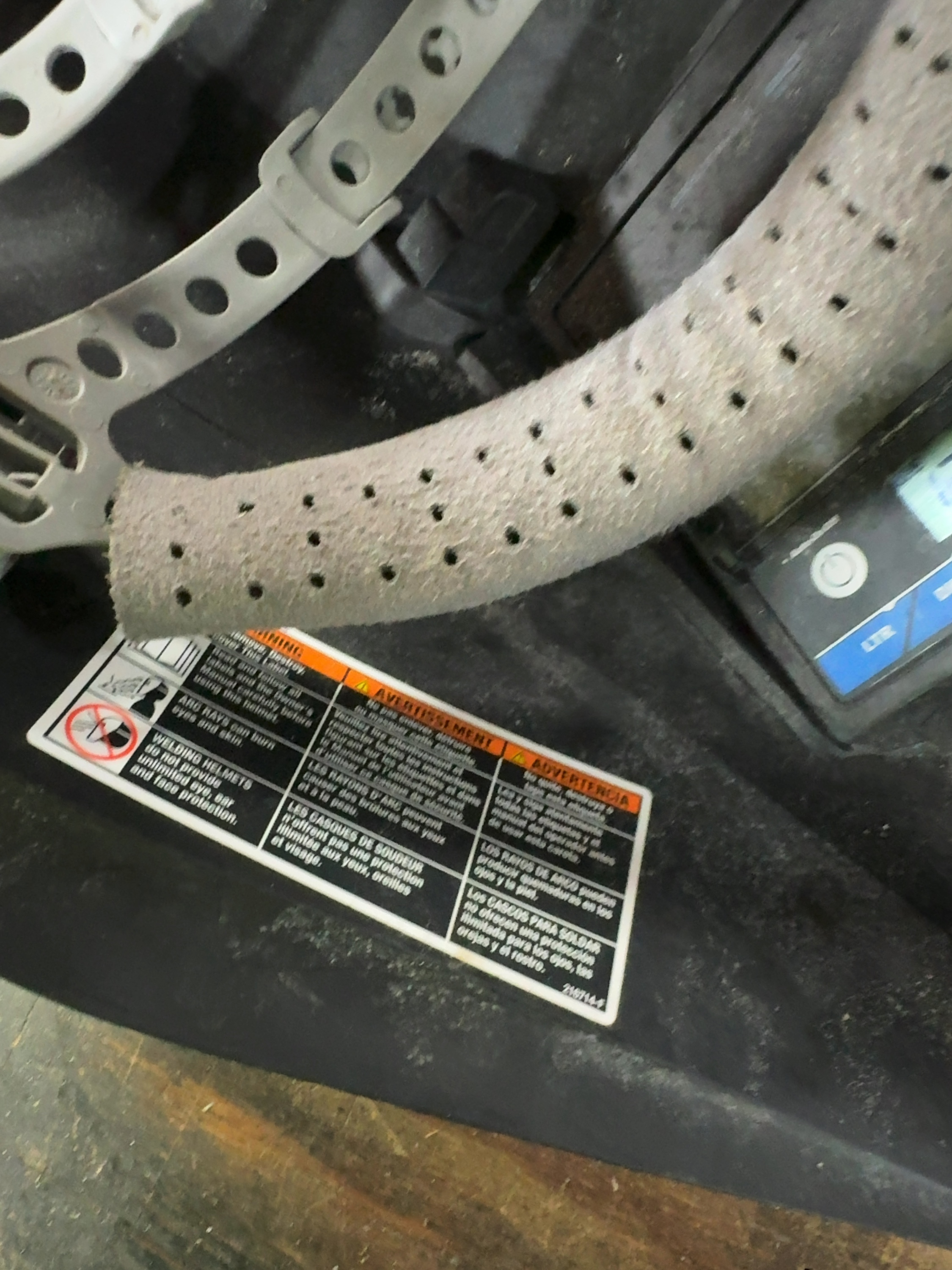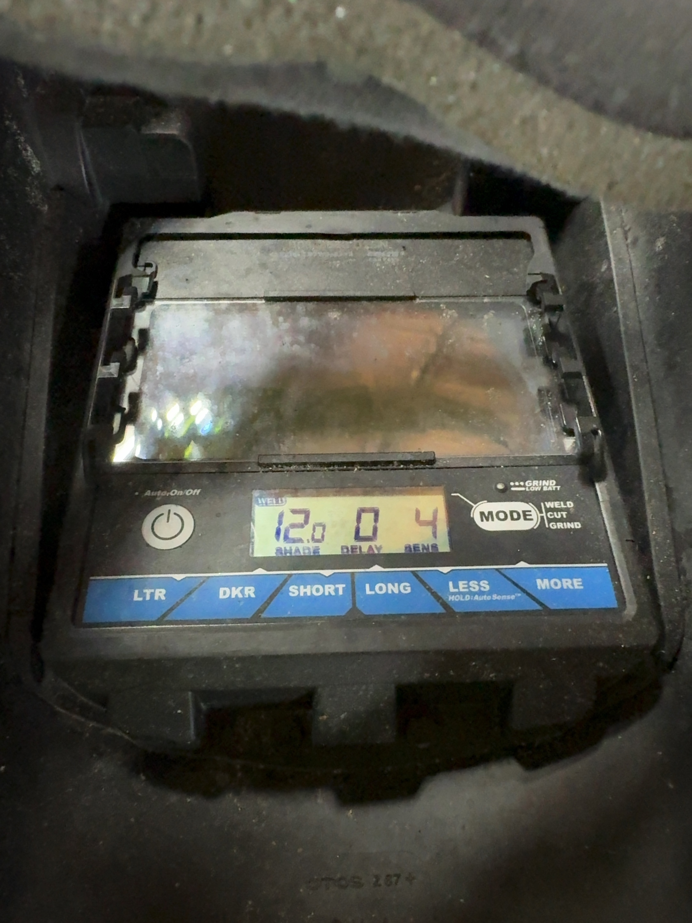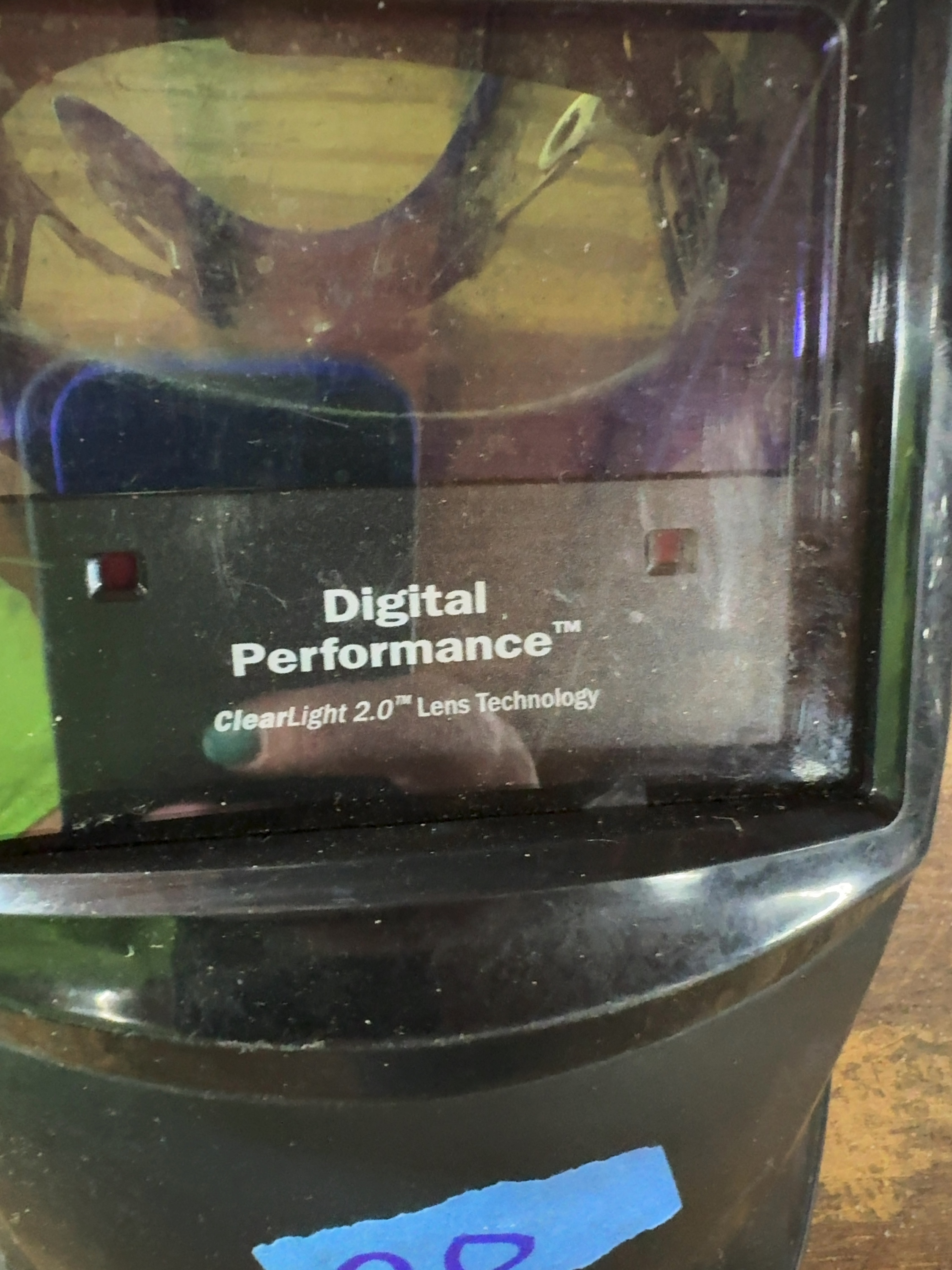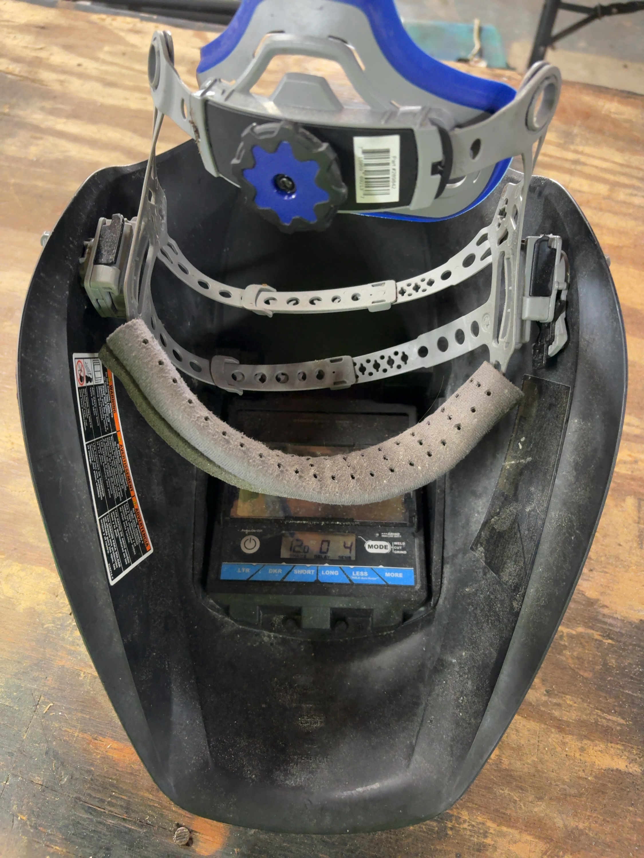 This lot consists of a used Miller Digital Performance series welding helmet featuring ClearLight 2.0 auto-darkening lens technology. The exterior black plastic shell displays the Miller brand logo on the forehead area. The helmet is equipped with an internal digital interface for adjusting shade, delay, and sensitivity settings, including operational modes for welding, cutting, and grinding. The interior features an adjustable headgear assembly with a blue adjustment knob and a grey perforated foam brow pad. A manufacturer label located on the interior provides replacement part numbers for the front cover lens (231921), inside cover lens (770237), fabric headband (770249), and CR2450 batteries (217043). Safety warning labels in English, French, and Spanish are affixed to the interior. A piece of blue adhesive tape with the handwritten number 20 is present on the lower front chin.