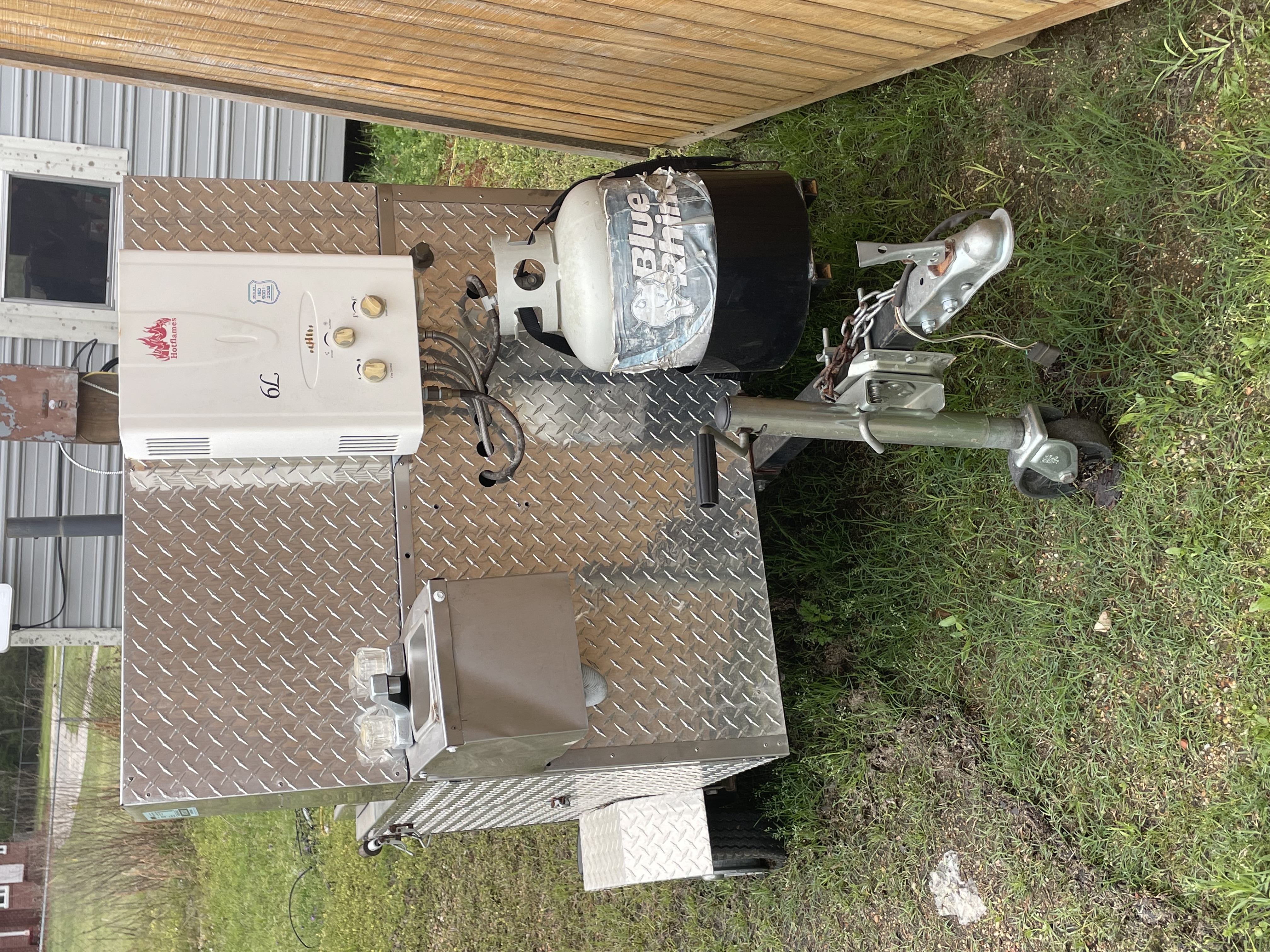 A silver diamond-plate towable hot dog cart trailer featuring a Hotflames 6L water heater, a Blue Rhino propane tank, a built-in sink, and identifying decals for Raydiculous Hot Dogs and Cat.