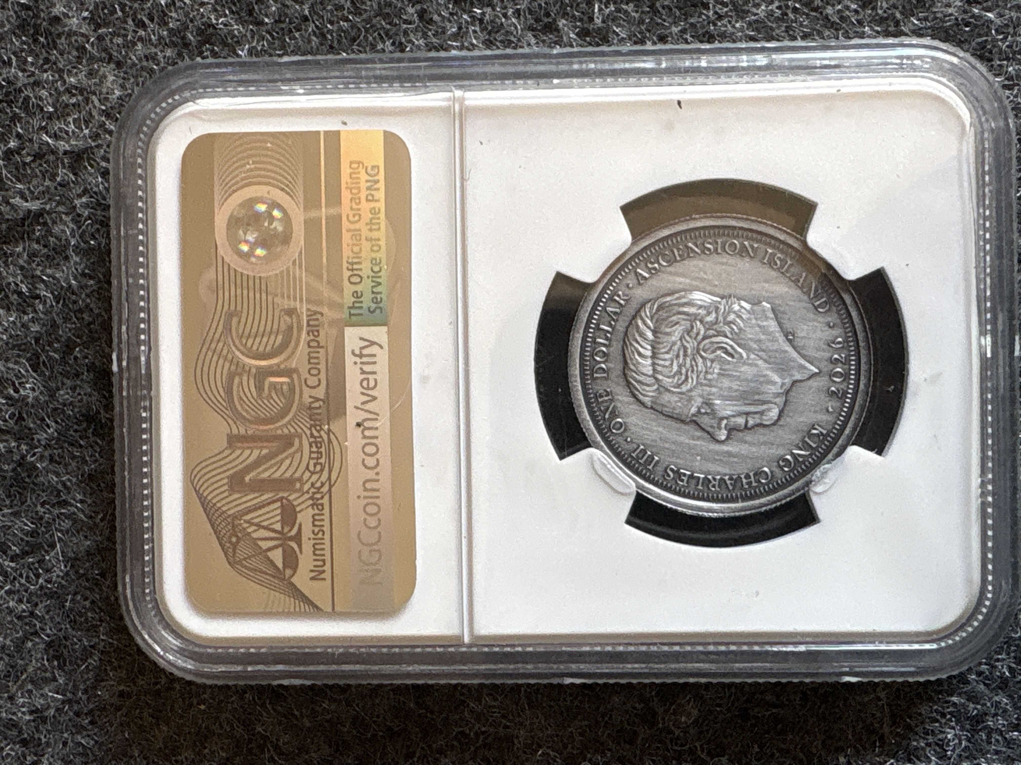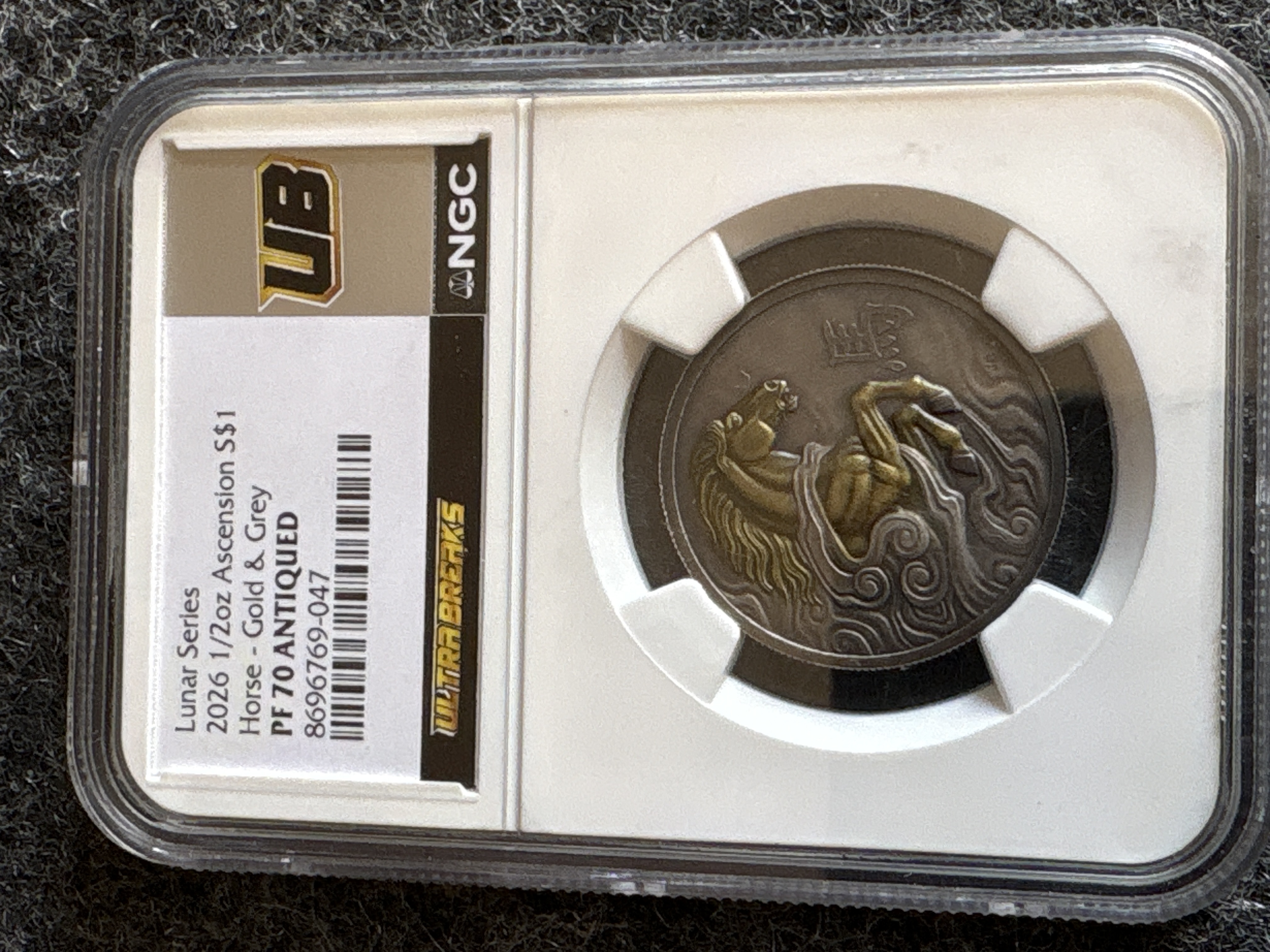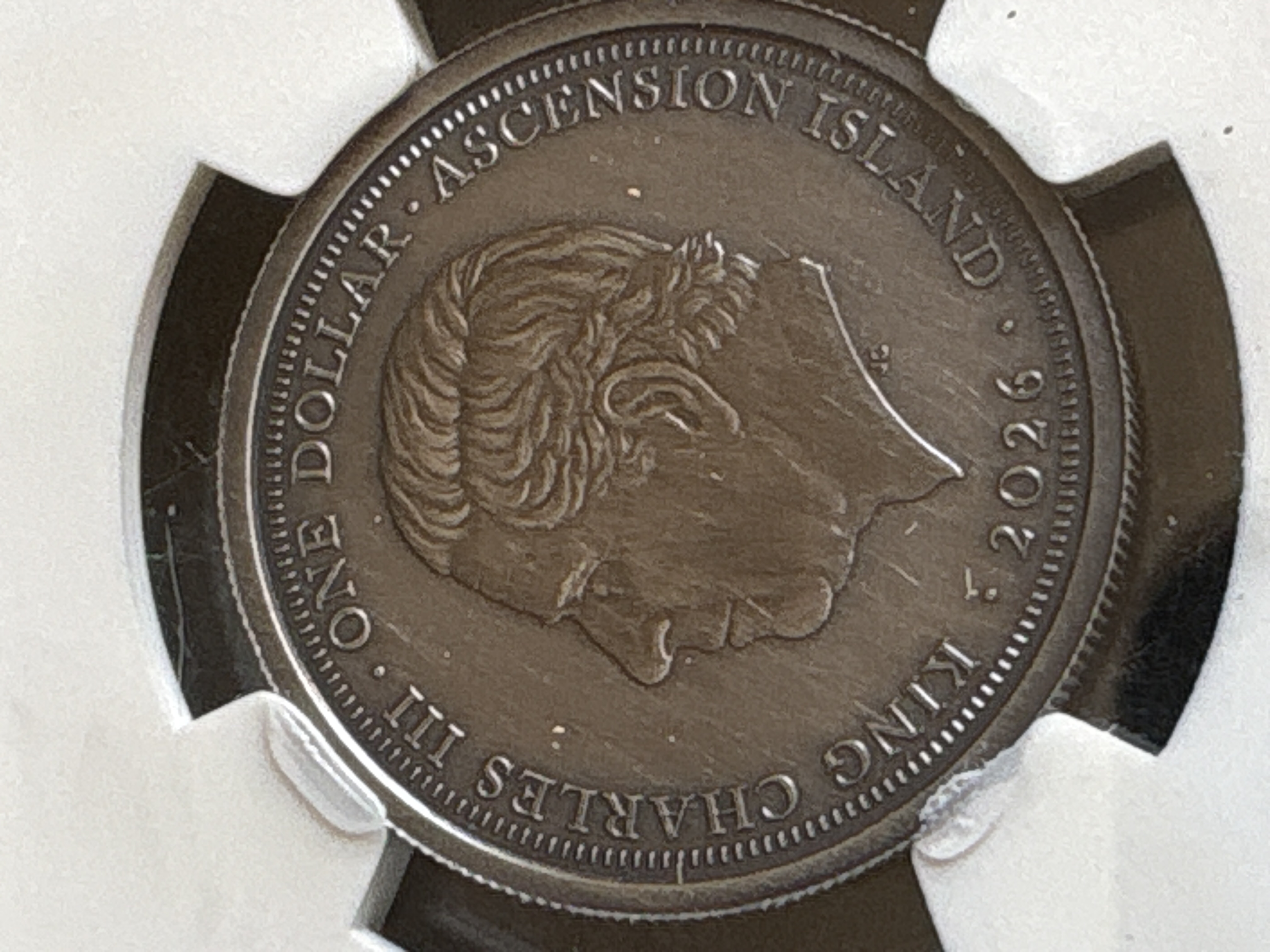 This 2026 Ascension Island one-dollar (S$1) coin is a 1/2 oz commemorative issue from the Lunar Series. . The obverse displays the King Charles III portrait. The reverse features the Year of the Horse design. The coin has a reeded edge and is professionally graded and encapsulated by NGC with Ultra Breaks branding. This item represents a pre-issue or future-dated commemorative piece.