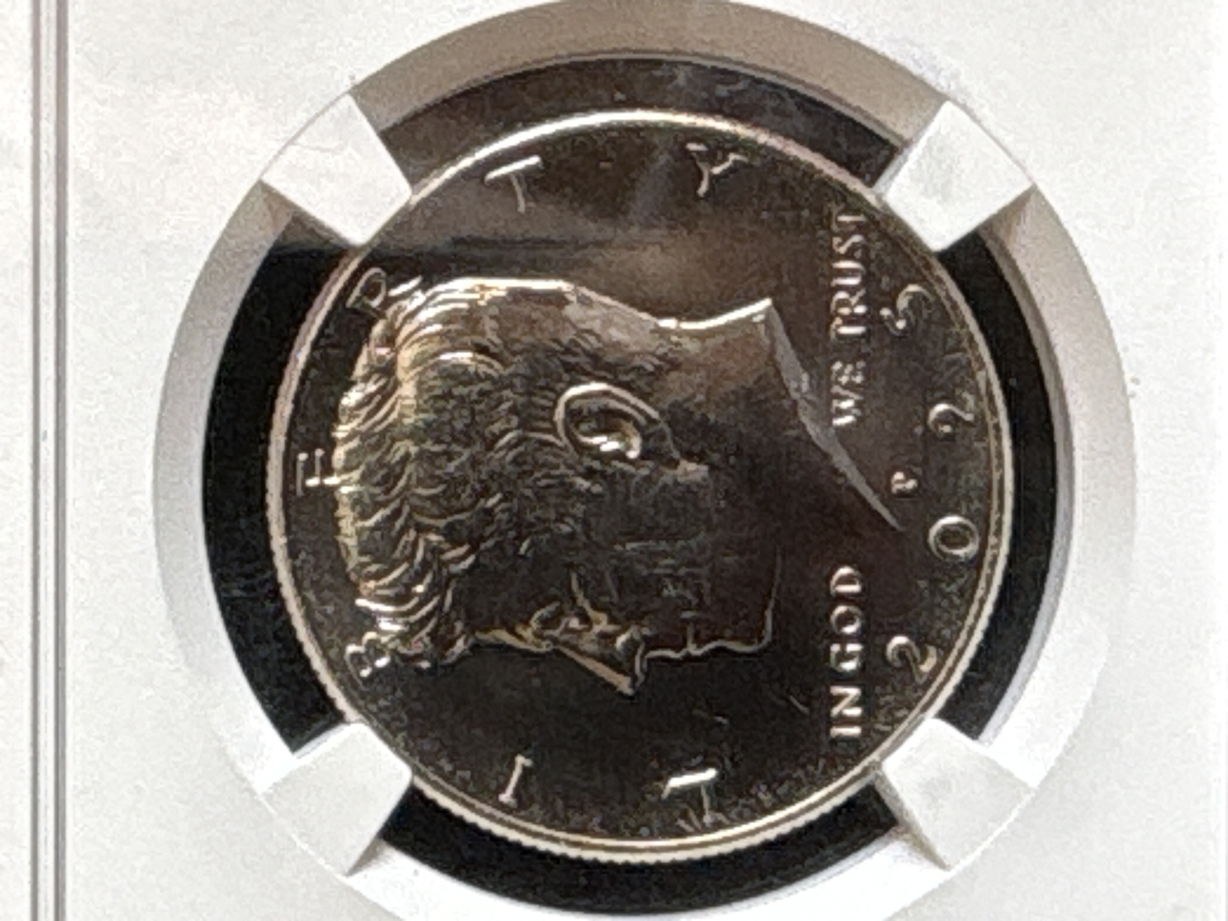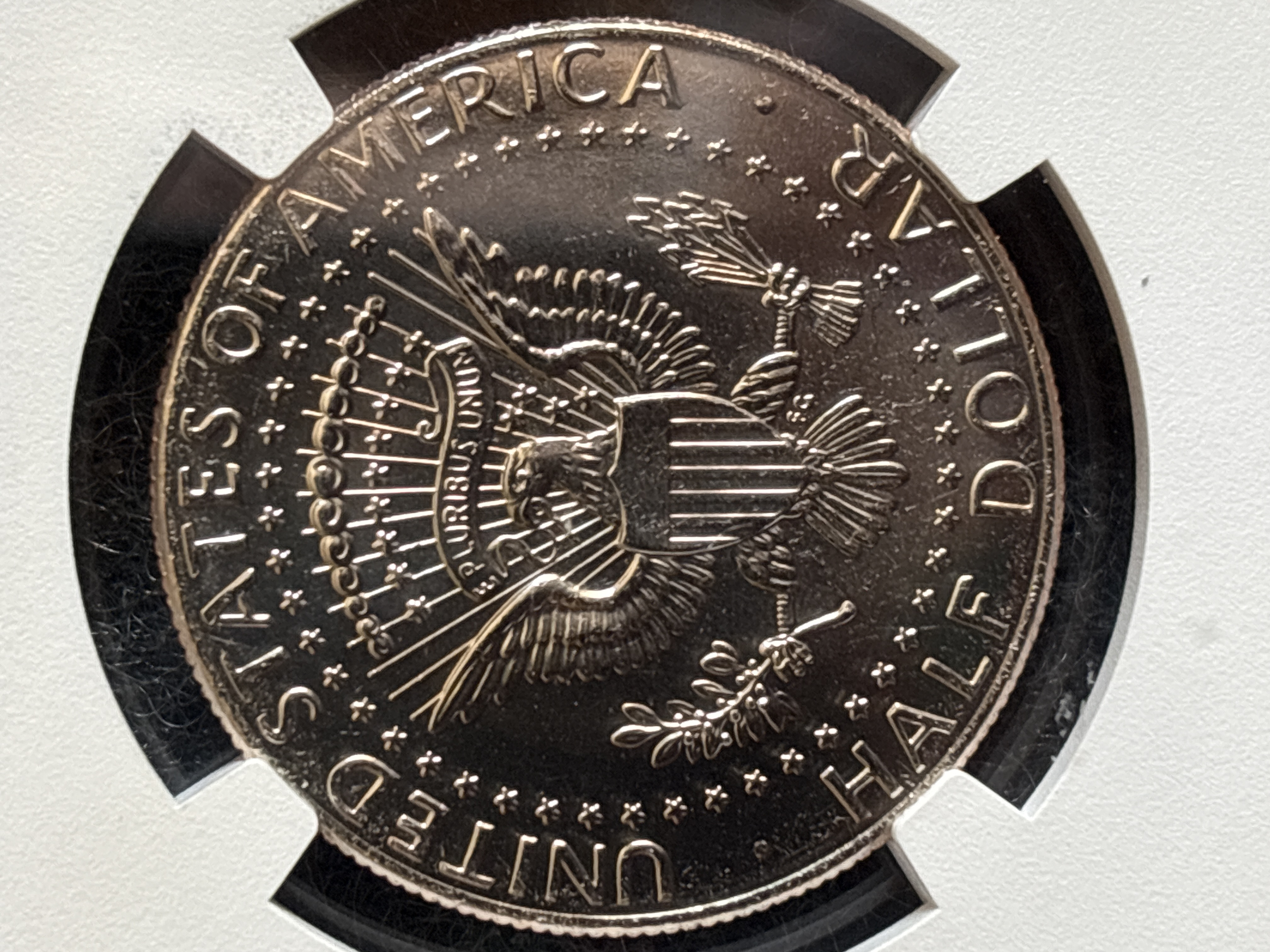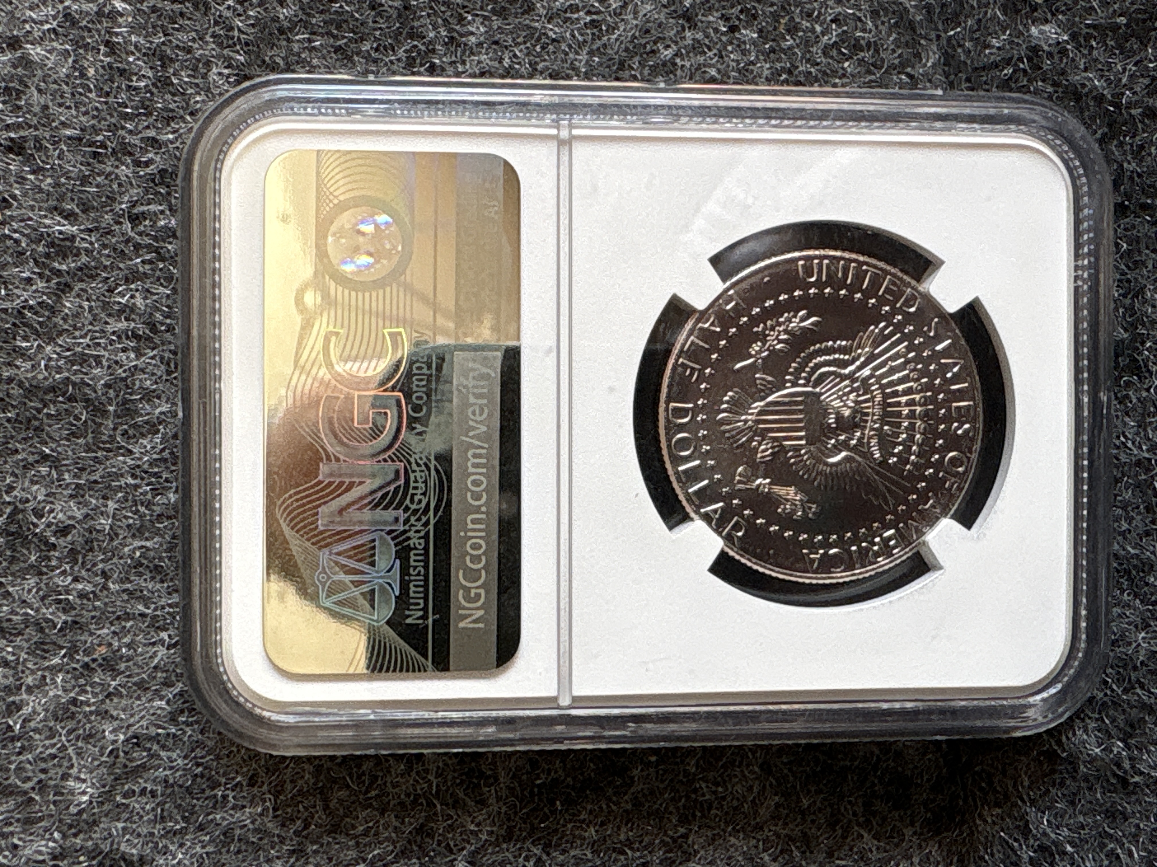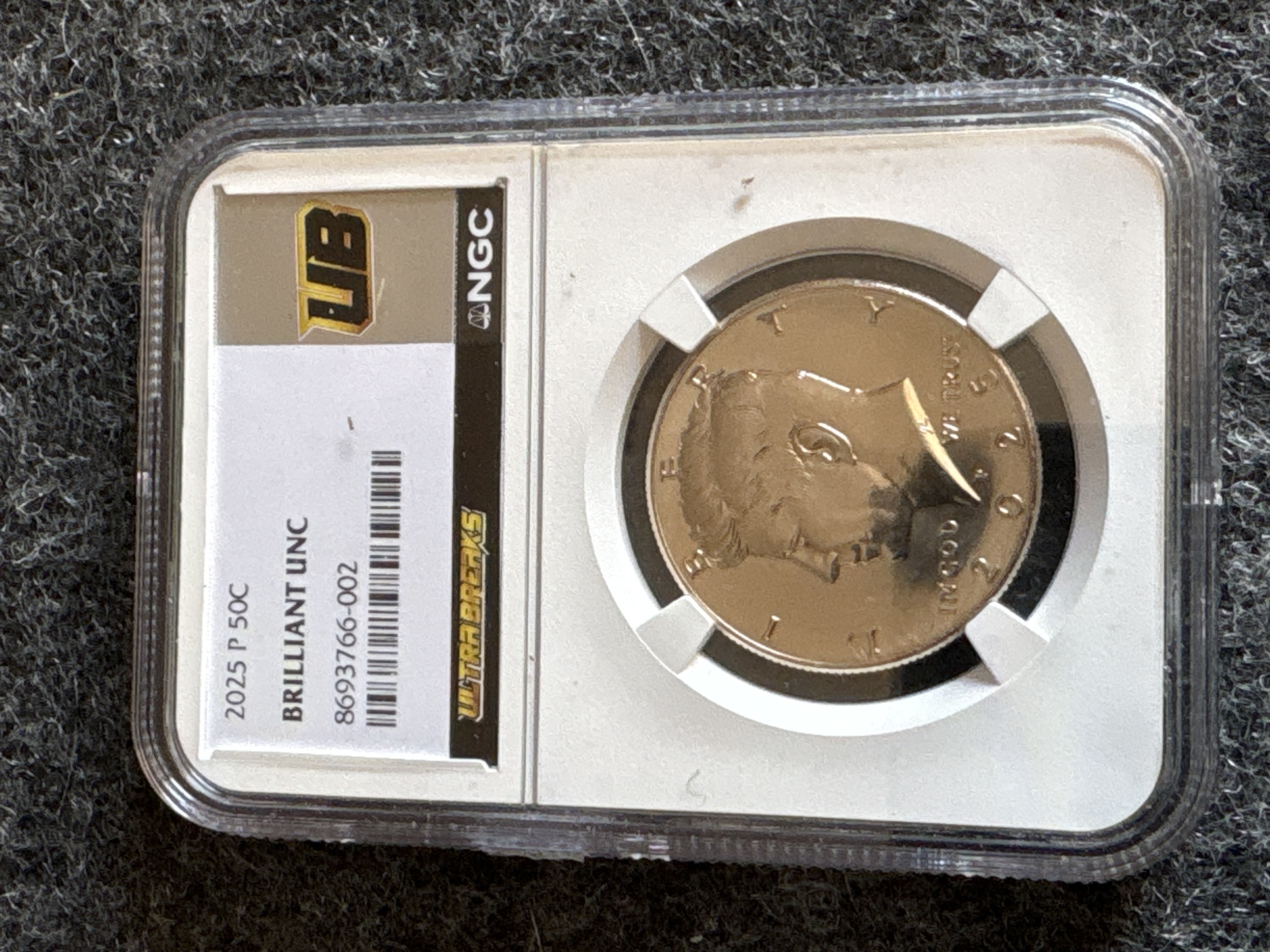 US 2025-P Kennedy half dollar struck in copper-nickel clad at the Philadelphia Mint. This specimen is professionally graded and encapsulated by NGC in an UltraBreaks branded holder with certification number 8693766-002. The coin features the Kennedy obverse and the Presidential Seal reverse. It is designated as Brilliant Uncirculated on the grading insert. The coin features a reeded edge and the holder includes a holographic verification label on the reverse. The Kennedy half dollar series was first issued in 1964 to commemorate President John F. Kennedy.