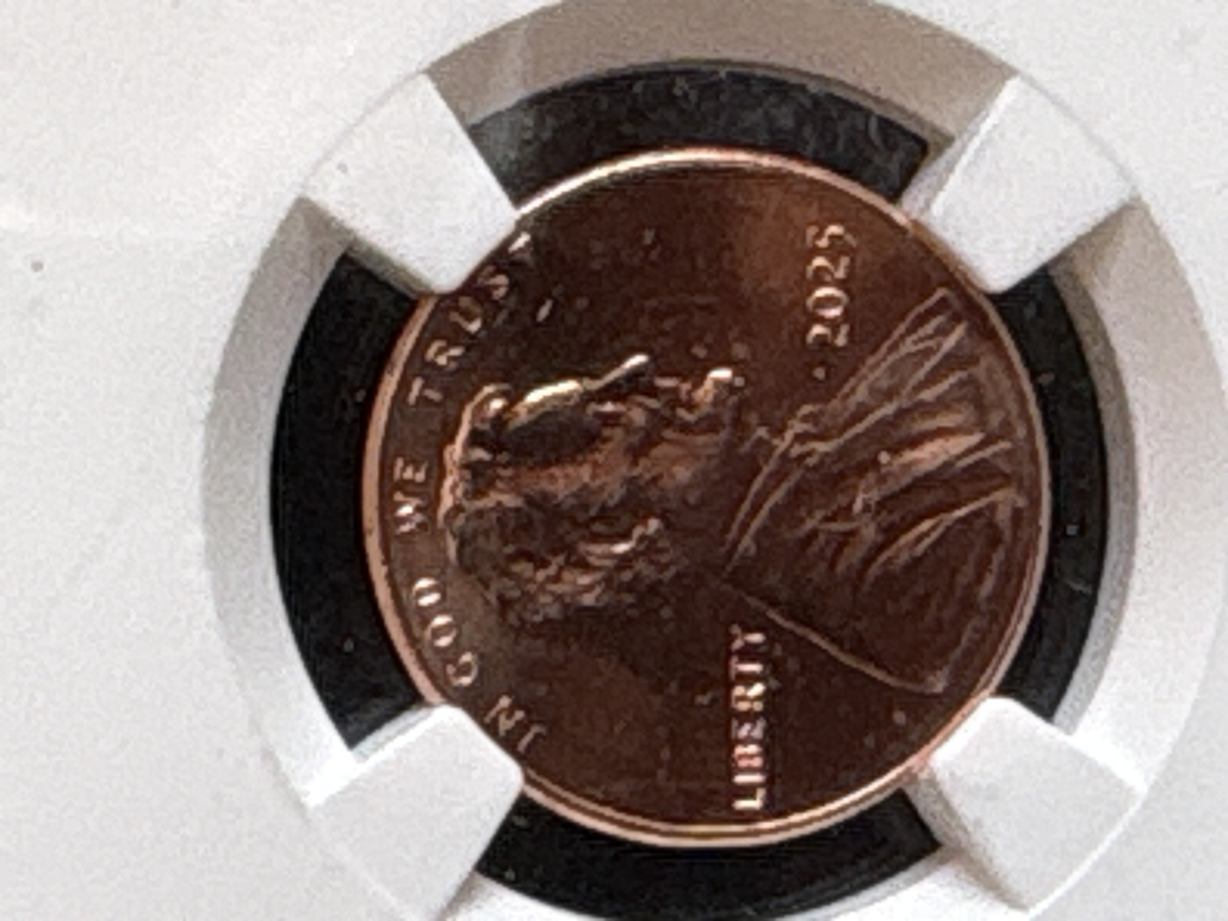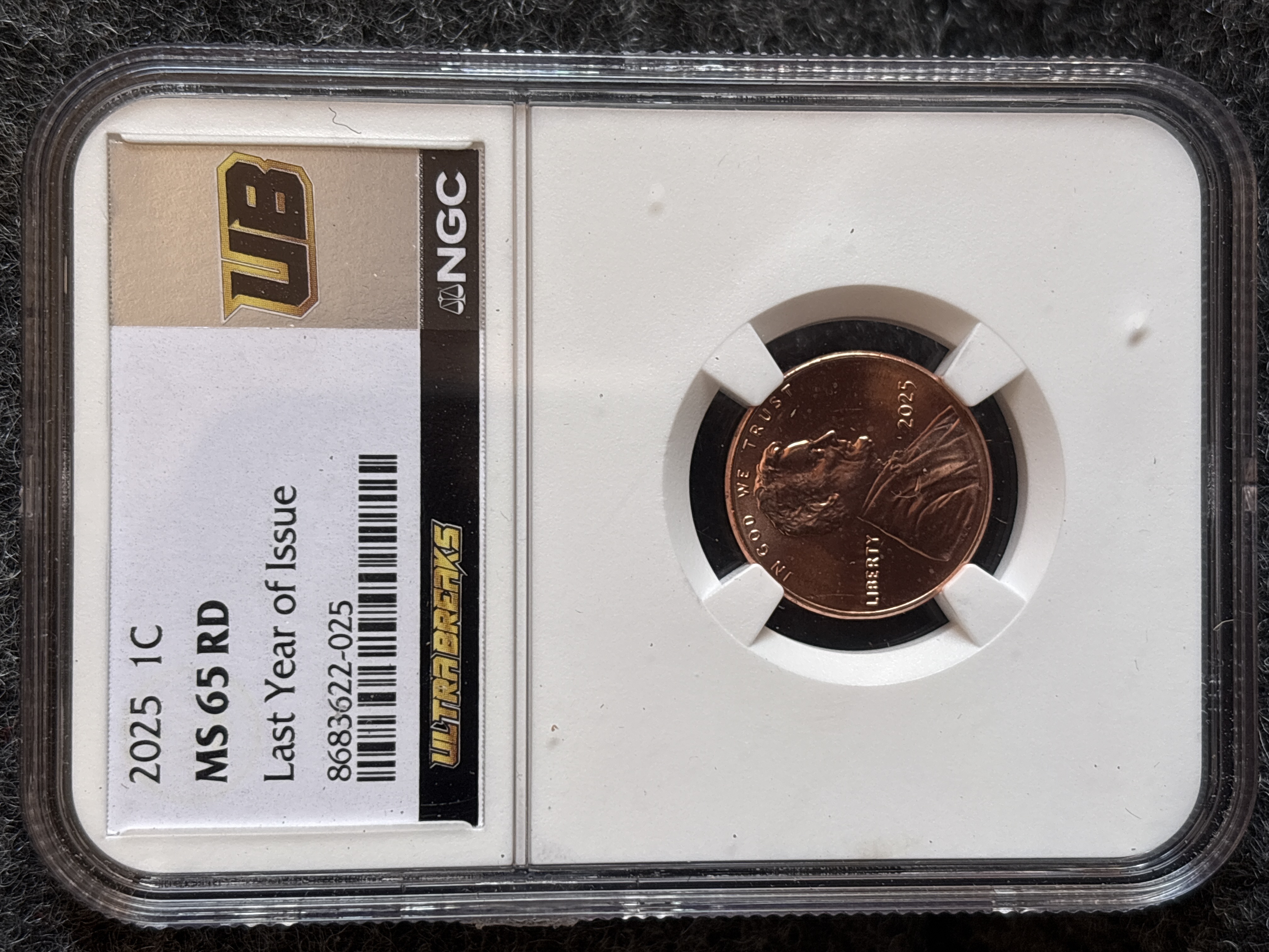 This 2025 US one cent coin was produced at the Philadelphia Mint, as evidenced by the absence of a mint mark. The specimen is composed of copper-plated zinc and features the Lincoln obverse and Union Shield reverse. It is professionally encased in an NGC grading slab featuring the Ultra Breaks branding and a Last Year of Issue designation. The certification number is 8683622-025. The coin has a plain edge. This issue is marketed as the final year of production for the Lincoln cent series.