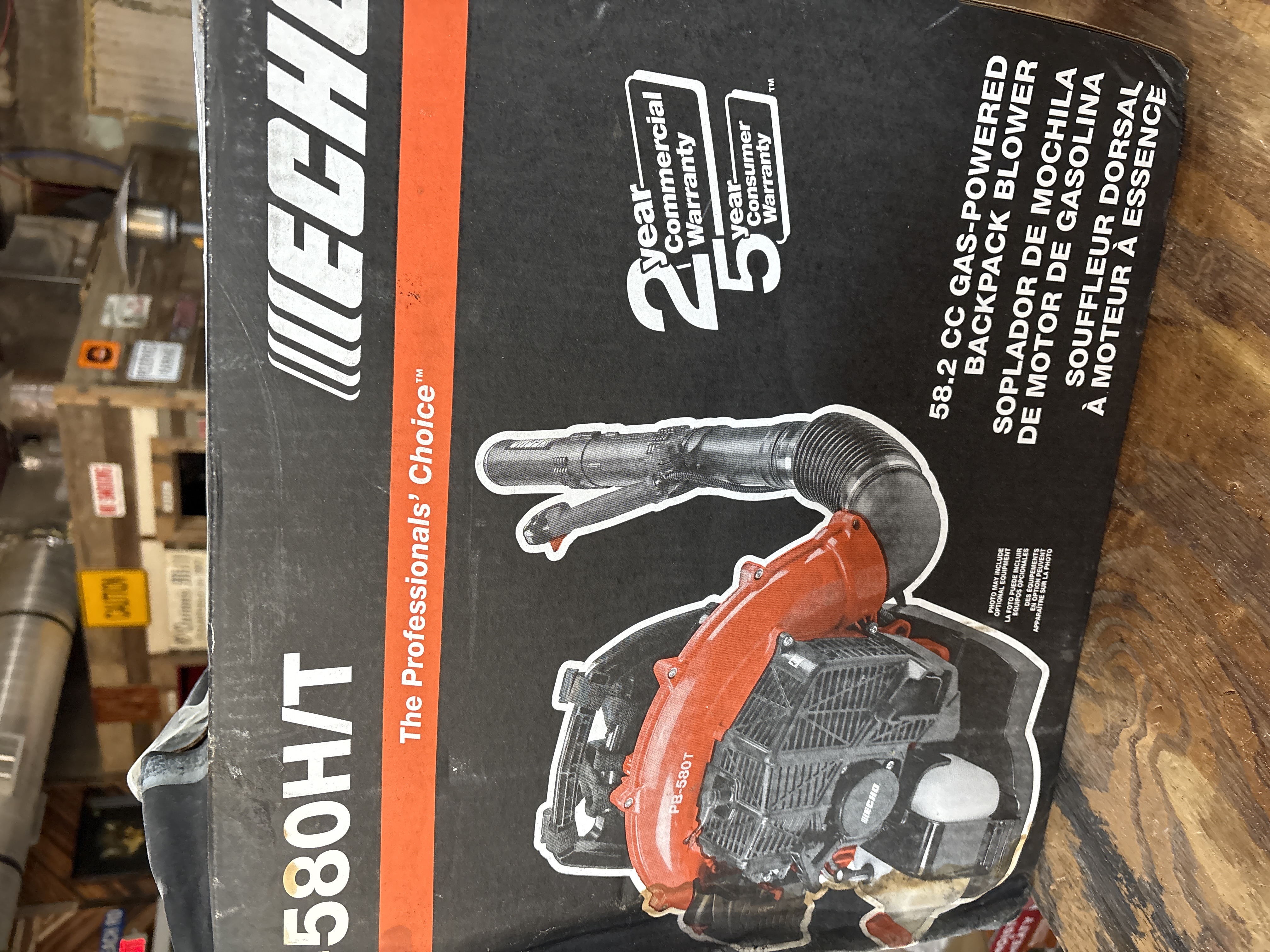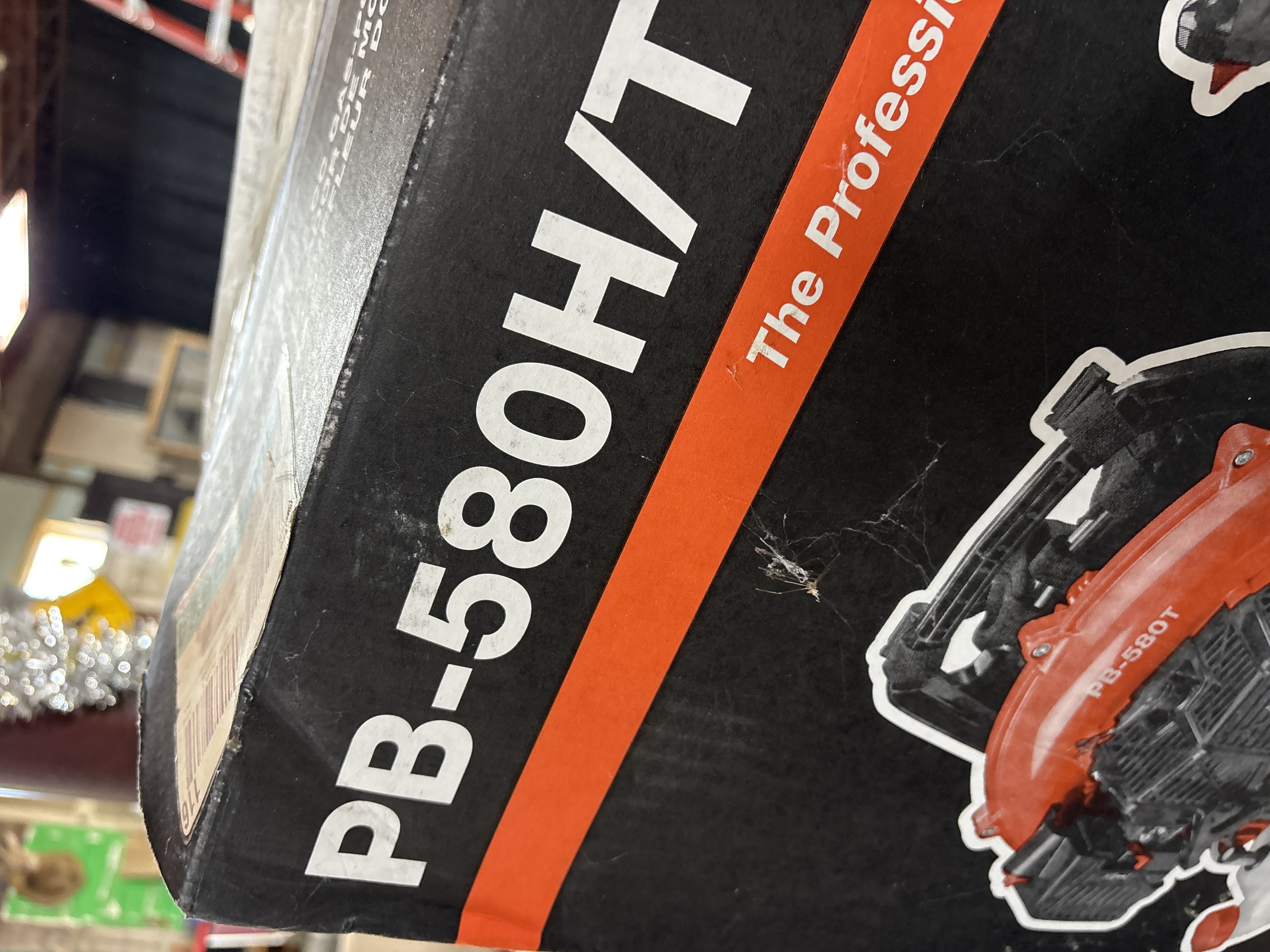 One Echo PB-580H/T 58.2 cc Gas-Powered Backpack Blower Not tested. Box is open, blower looks new, like it has never been used