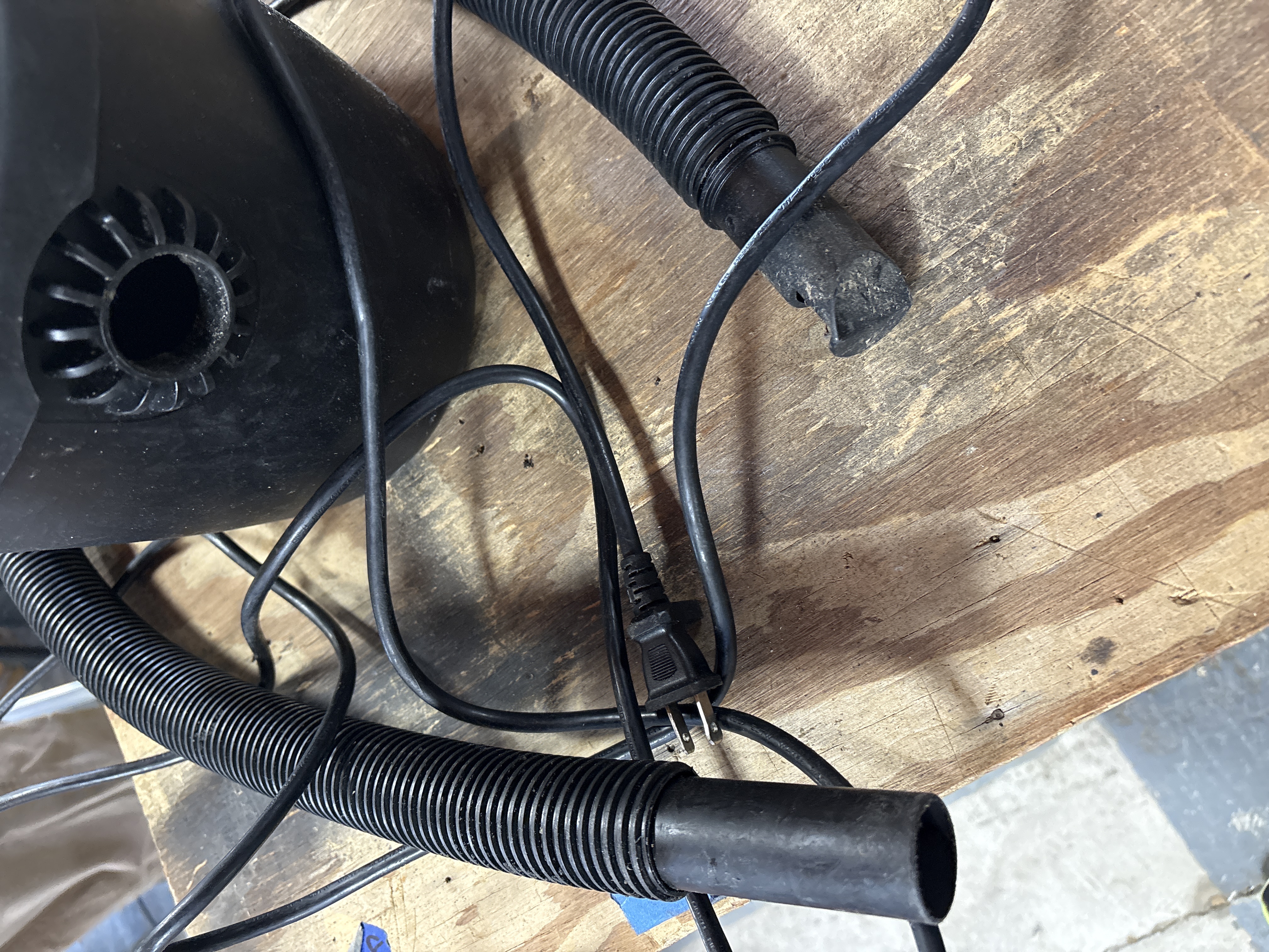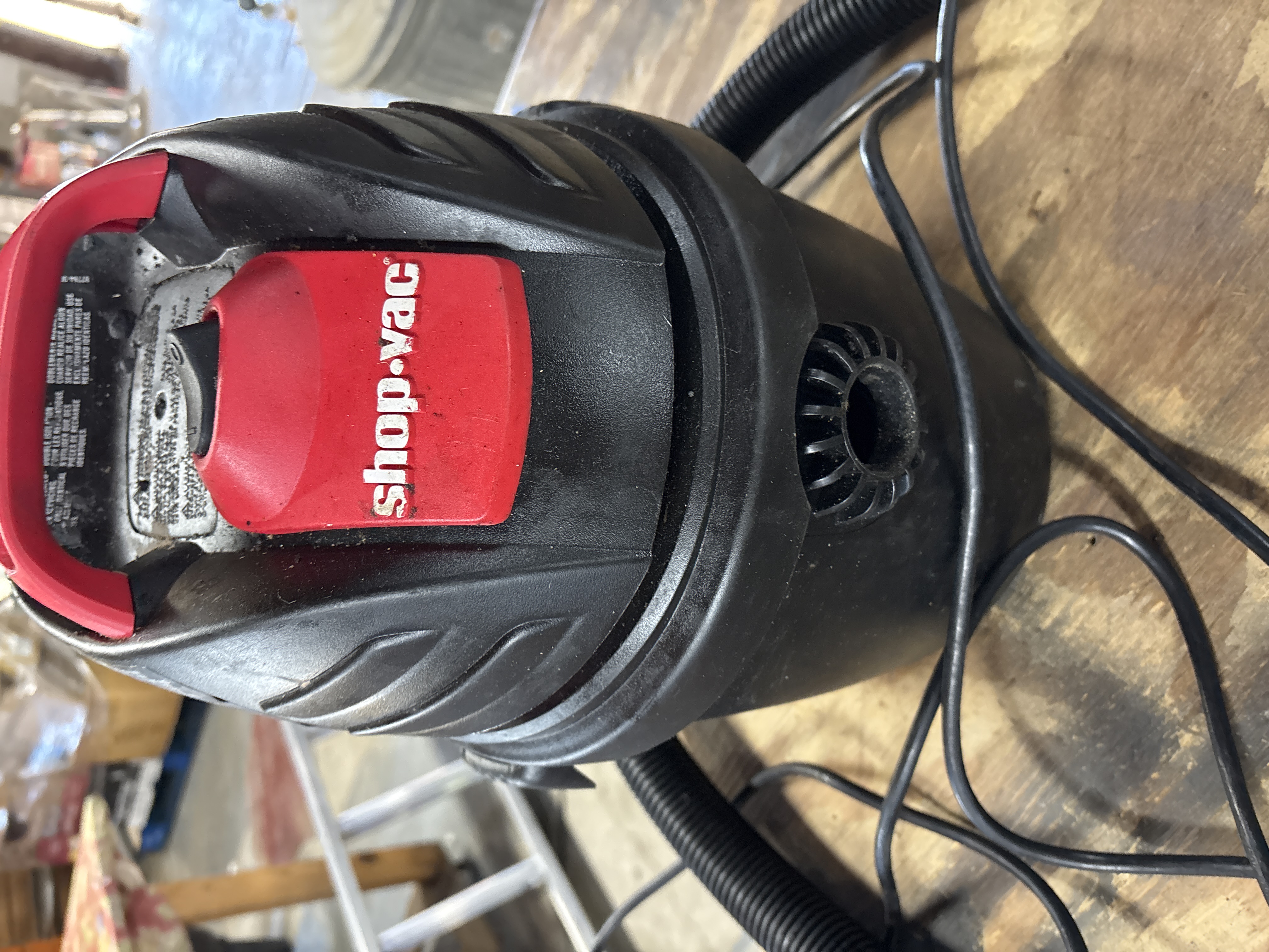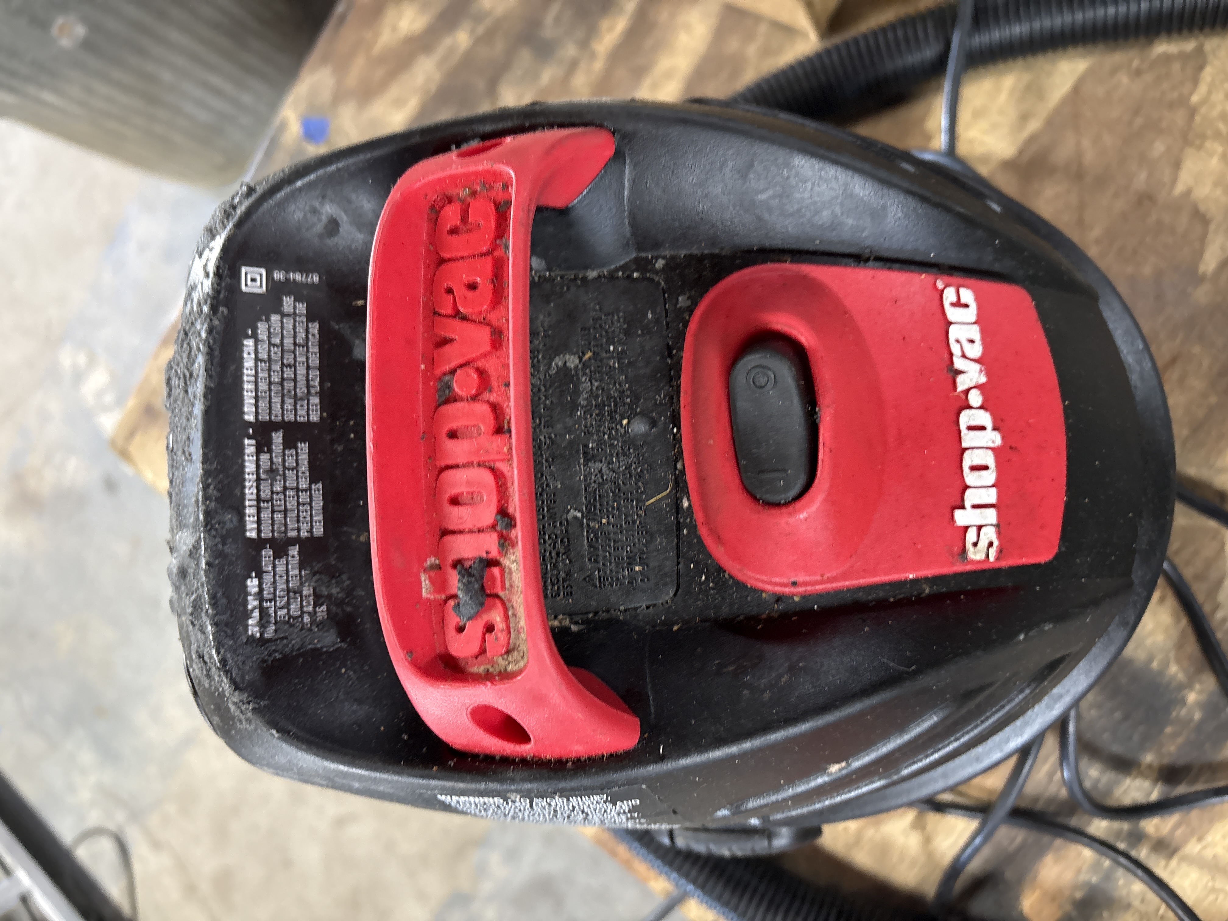 Shop-Vac portable wet and dry utility vacuum cleaner featuring a 2.5 gallon tank capacity and a 2.5 peak horsepower motor. The unit is constructed with a black and red plastic housing and includes an integrated top carry handle. It is equipped with a top-mounted rocker power switch and a rear exhaust port designed for blower functionality. The vacuum includes a flexible black plastic hose and an attached two-prong power cord. The Shop-Vac brand name is prominently featured on the red top panel and molded into the carry handle. A warning label on the housing includes the identification number 87784-38 and a double-insulated safety symbol.