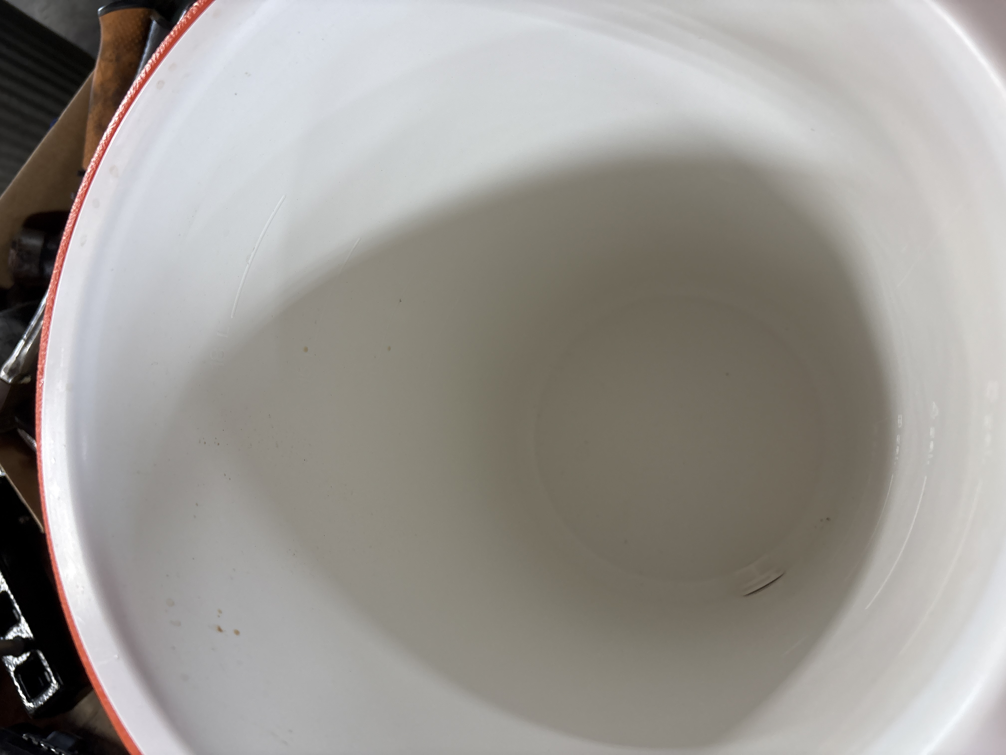 An Igloo 5-gallon beverage cooler, model 4901361, featuring a cylindrical orange plastic body and a white pressure-fit seat-top lid. The exterior is embossed with IGLOO 5-GAL DRINKING WATER and includes a retail label from Igloo Products Corp. of Katy, Texas, with a 2019 copyright date. The unit is designed with two white swing handles and a front-mounted push-button spigot. The interior is finished in white plastic. The label specifies a capacity of 20 quarts or 18.9 liters.