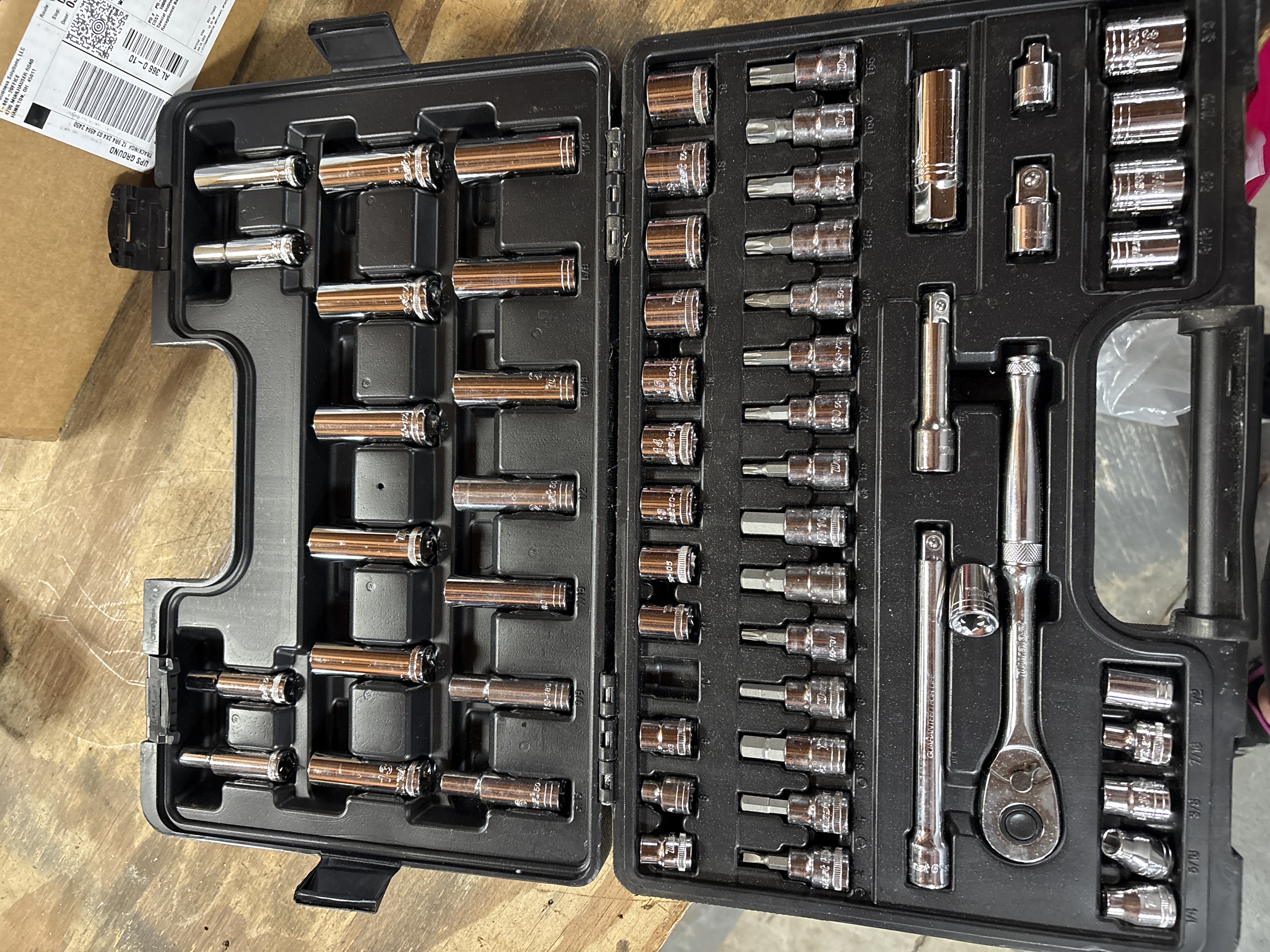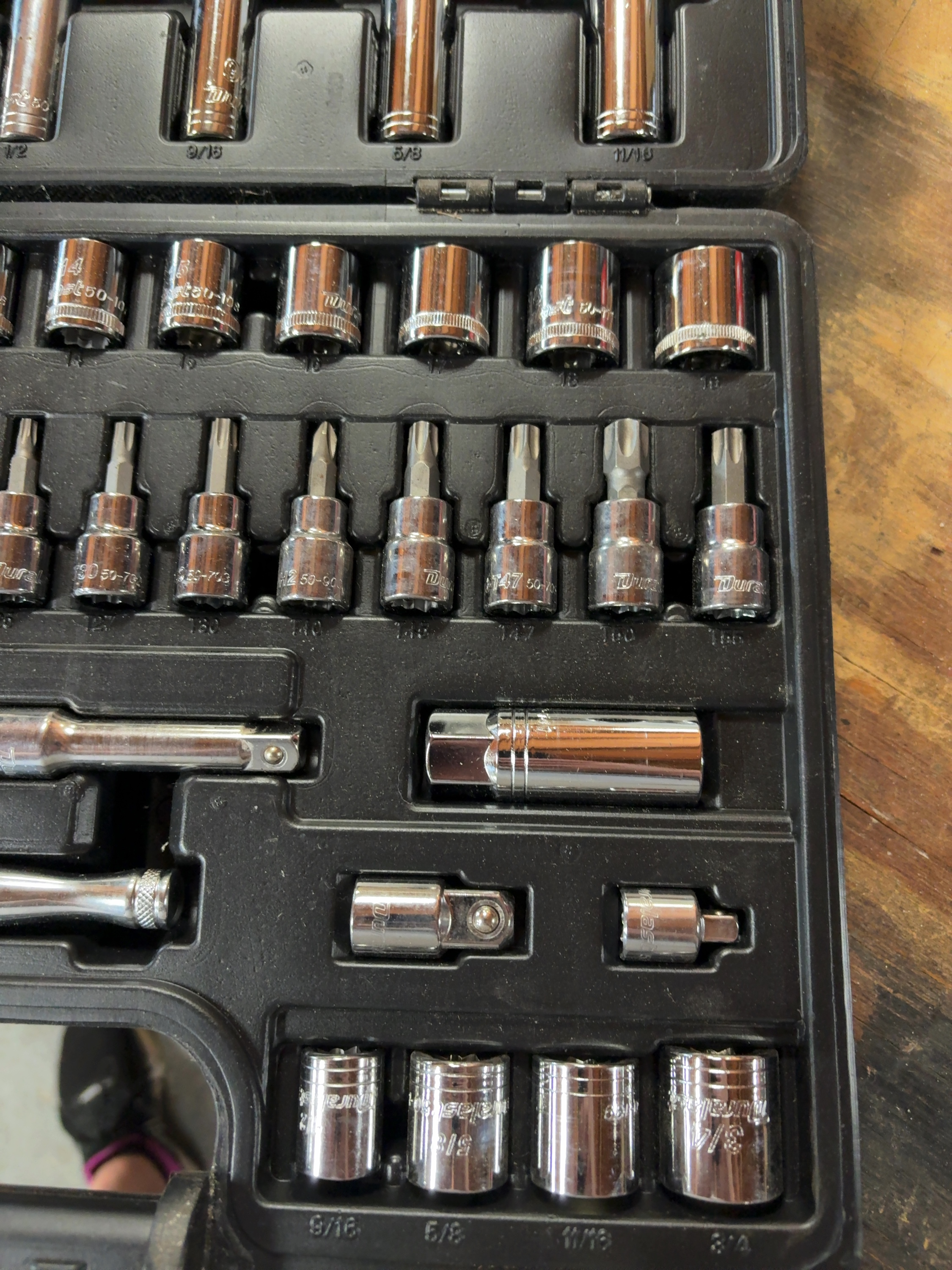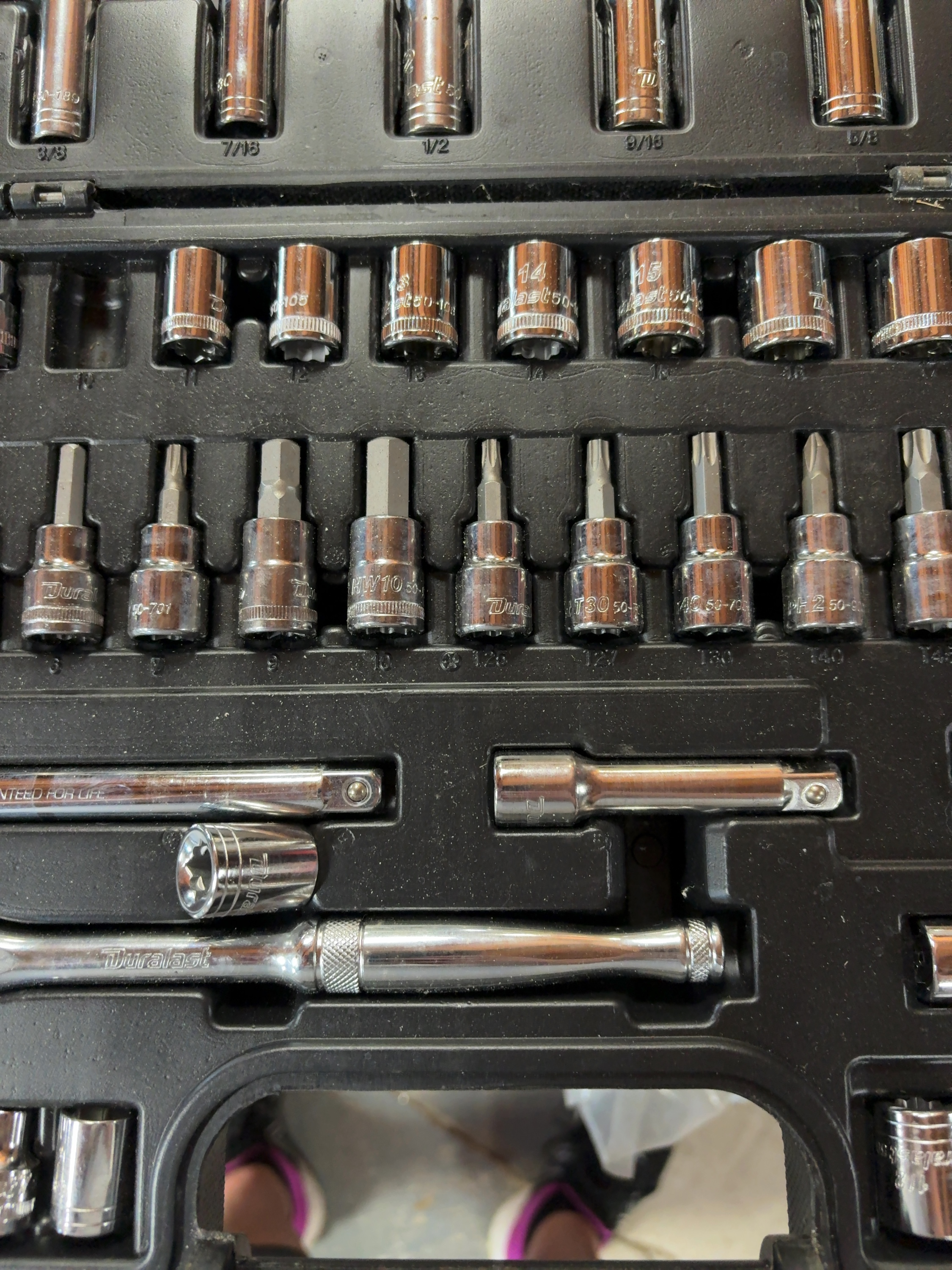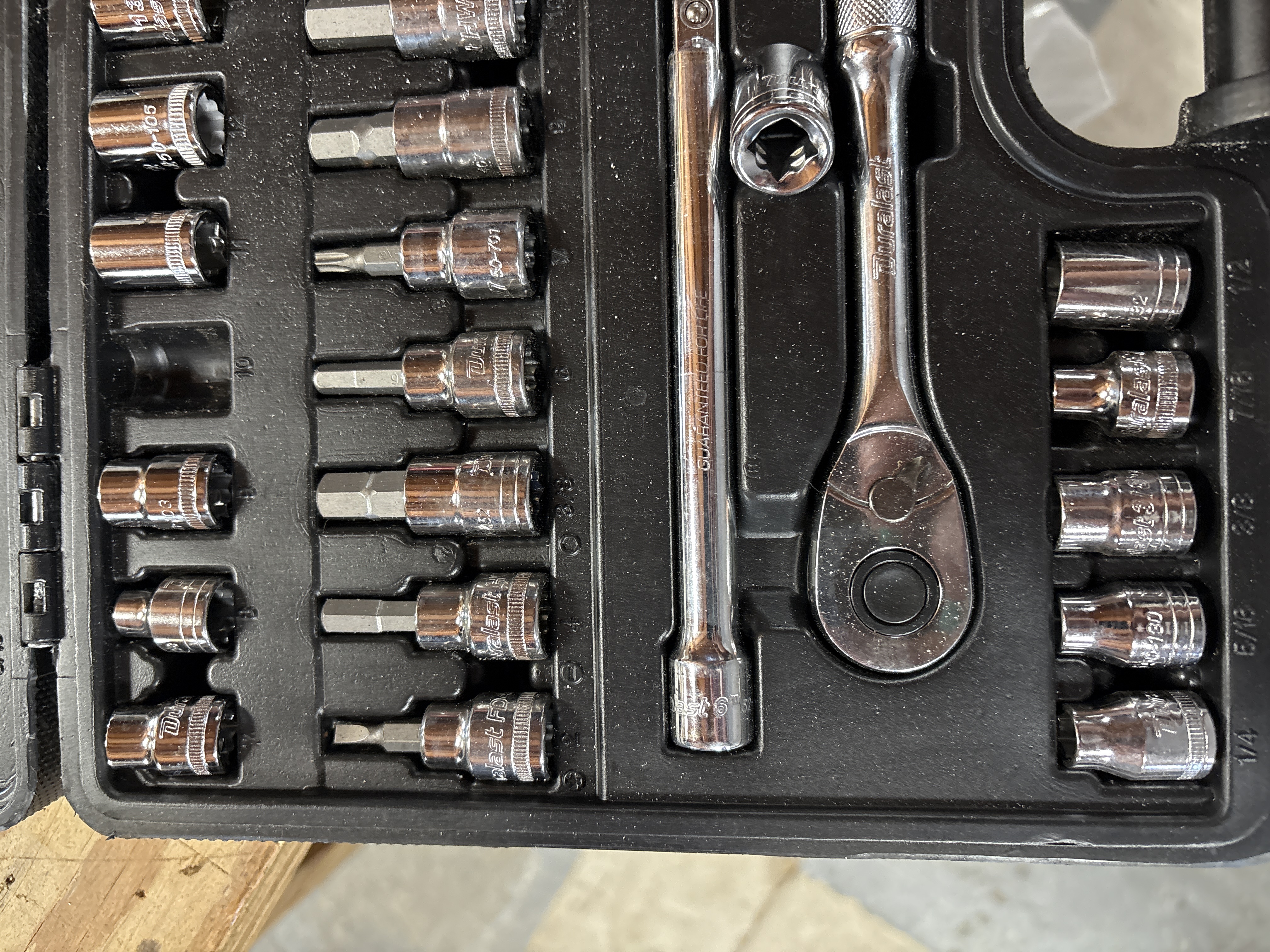 A Duralast brand mechanic tool set featuring a 3/8-inch drive ratchet and various accessories. The tools are constructed of chrome-plated steel and are housed in a black molded-plastic carrying case. The exterior of the case and the ratchet handle are marked with the Duralast name. The set includes a 3/8-inch drive ratchet, two extension bars, a universal joint, and a spark plug socket. The collection contains an assortment of standard and deep-well sockets in both SAE and Metric sizes, including fractional sizes such as 9/16 and 3/4 and metric sizes such as 10 and 15. Also included is a series of driver bit sockets featuring Torx, hex, and Phillips-head types, with visible bit codes including T30, T40, and PH 2. One extension bar bears the stamped inscription GUARANTEED FOR LIFE. Individual components are stamped with the Duralast brand and their respective sizes.