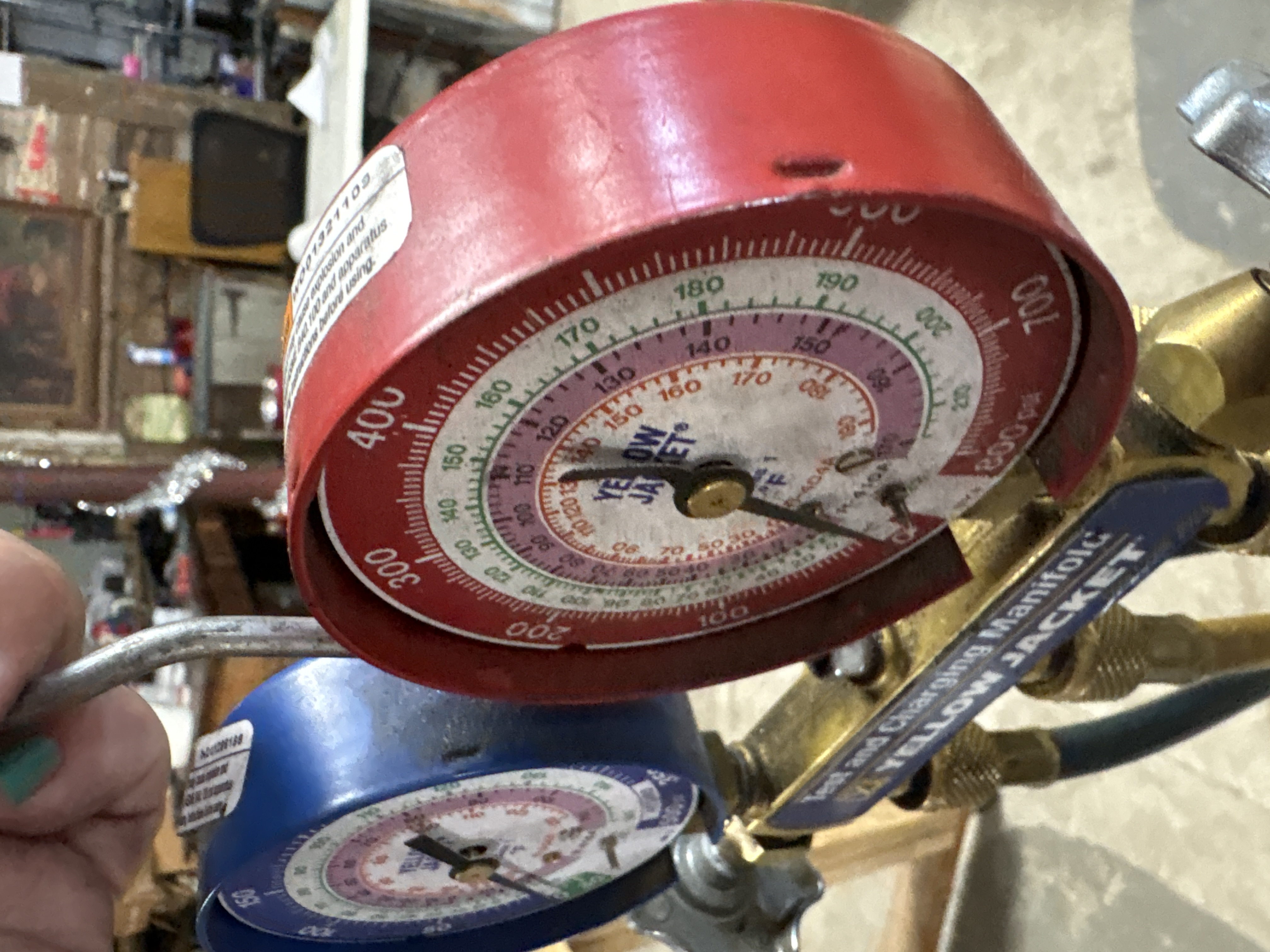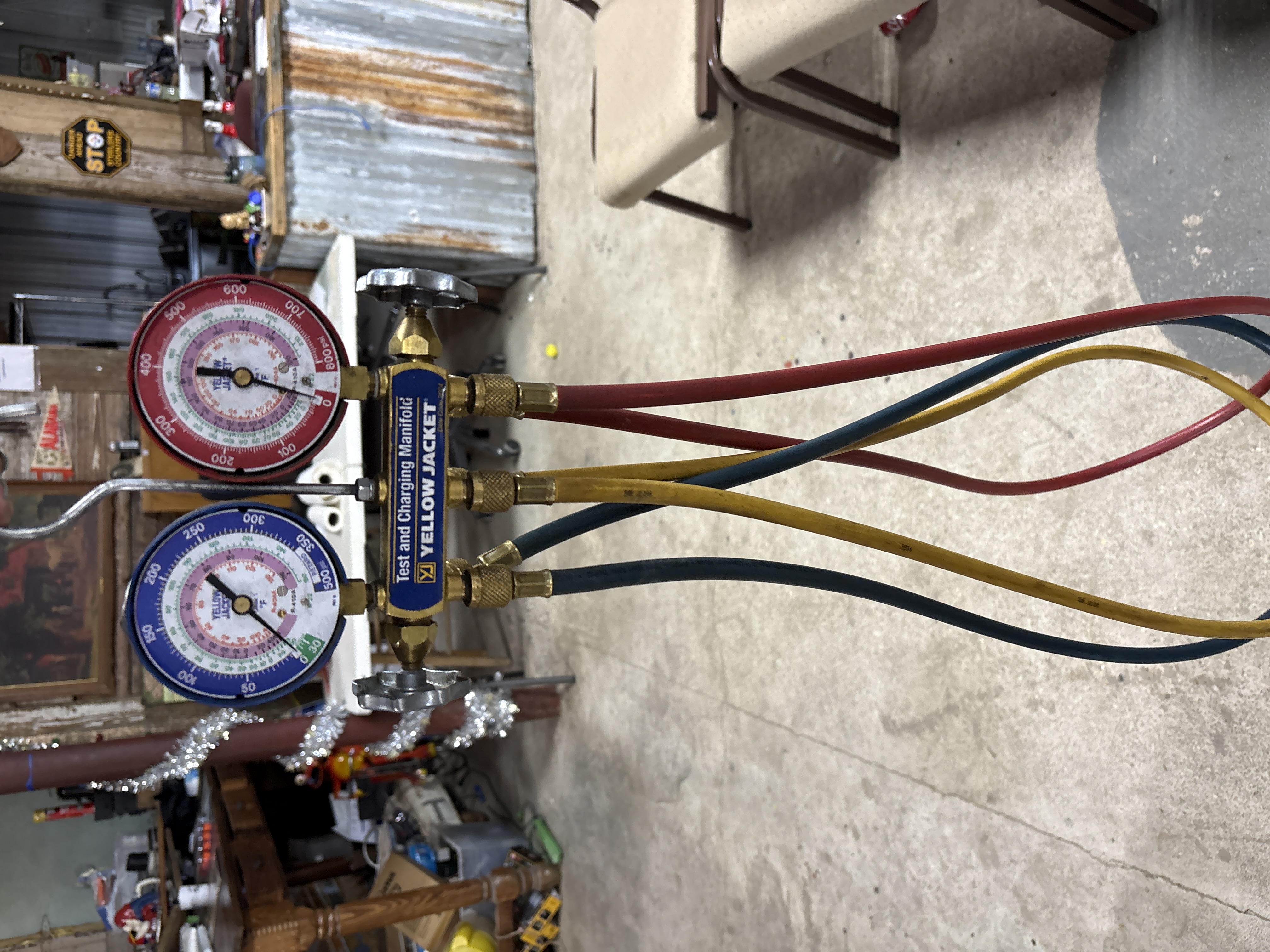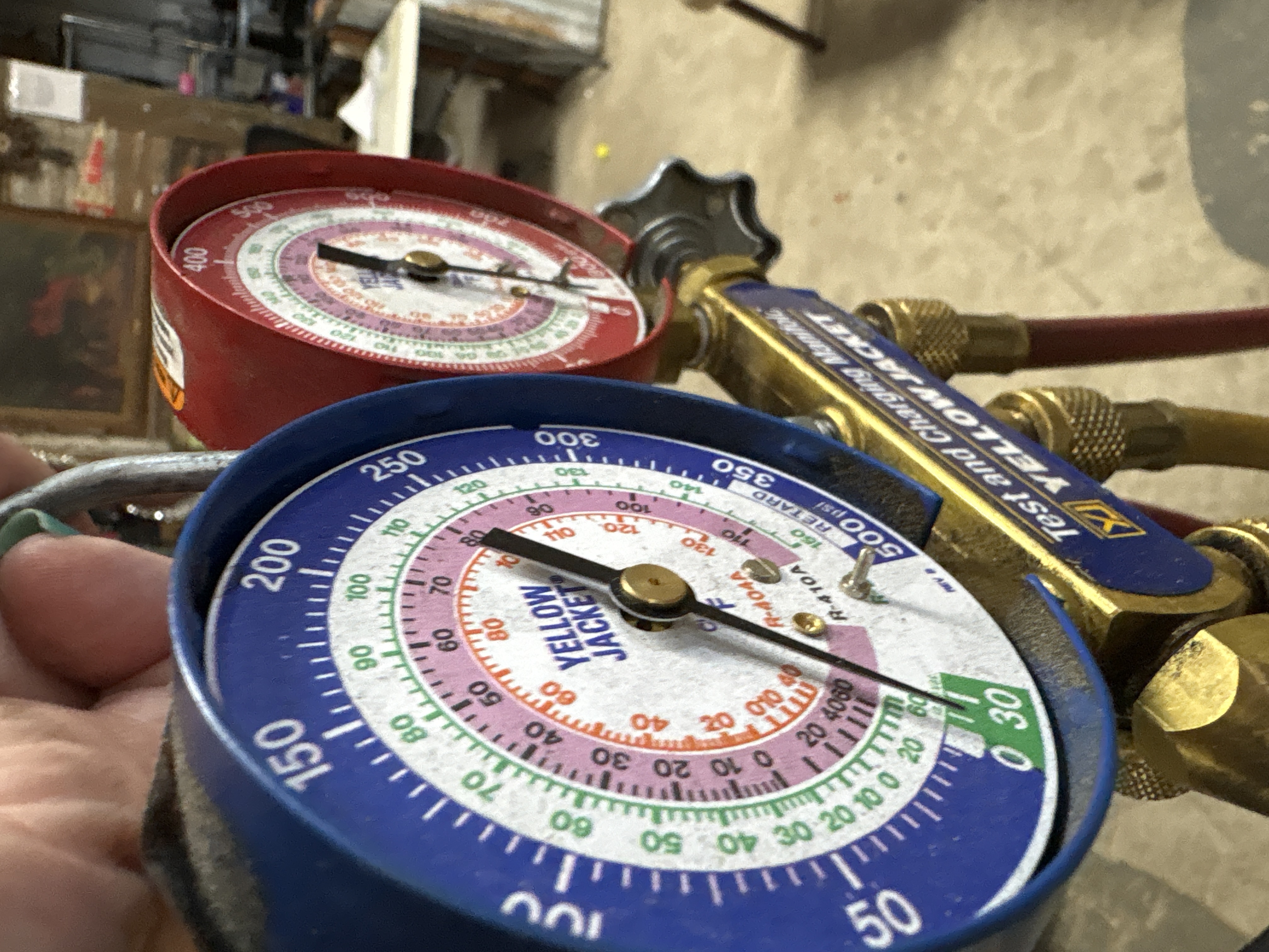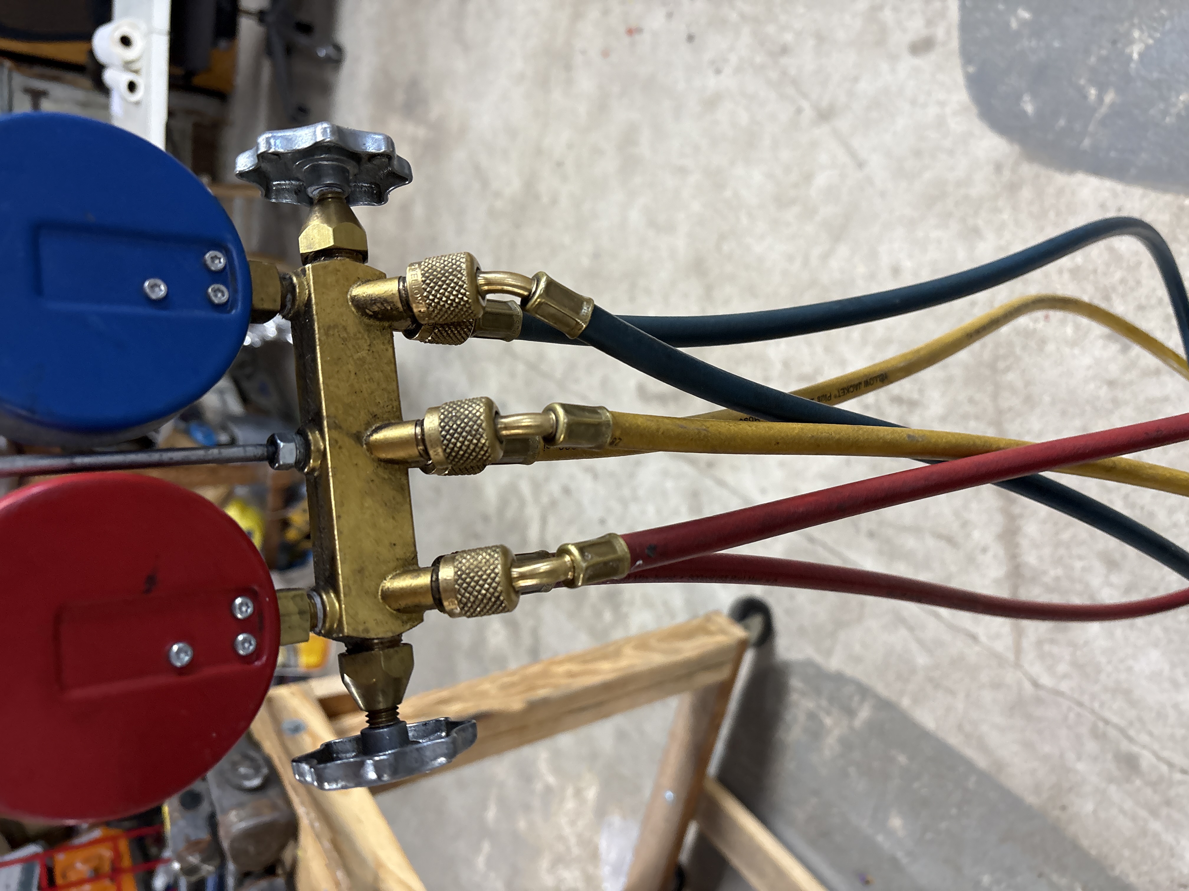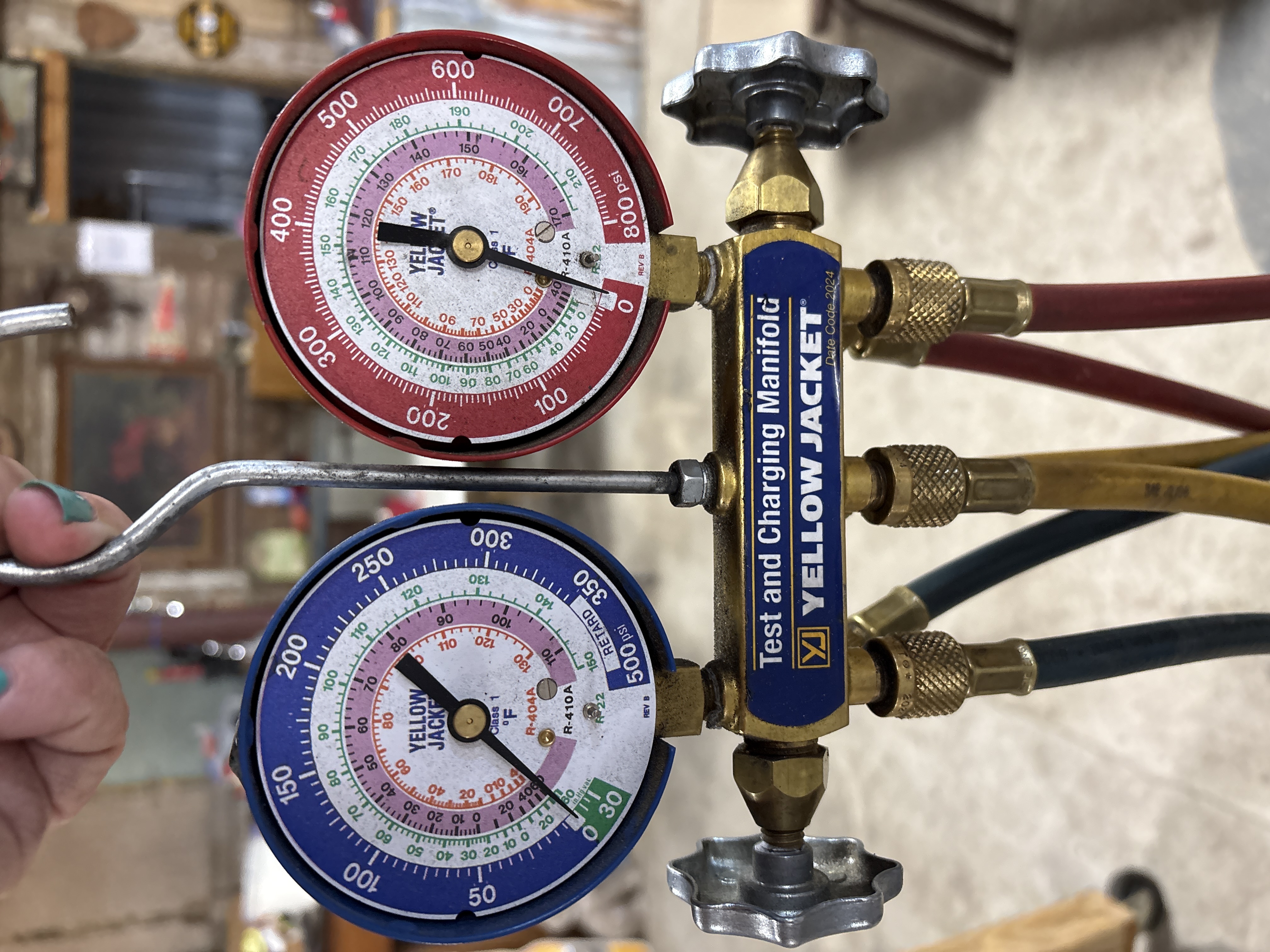 A professional-grade HVAC refrigerant test and charging manifold set manufactured by Yellow Jacket (Ritchie Engineering Co., Inc.). The instrument consists of a solid brass manifold block equipped with two star-shaped cast metal control valves and three port connections. The set features two mechanical gauges mounted in painted metal housings. The red high-side gauge measures from 0 to 800 psi and includes temperature scales in degrees Fahrenheit for R-404A and R-410A refrigerants. The blue low-side gauge measures from 30 inHg vacuum to 500 psi, including a retard section, and features temperature scales for R-404A and R-410A refrigerants. A blue and gold label on the manifold block is marked Test and Charging Manifold, Yellow Jacket, and Date Code 2024. The gauge faces are printed with the Yellow Jacket brand name. The set is accompanied by three colored hoses in red, yellow, and blue, featuring knurled brass fittings and printed with the Yellow Jacket Plus mark. A steel hanging hook is attached to the top of the manifold.