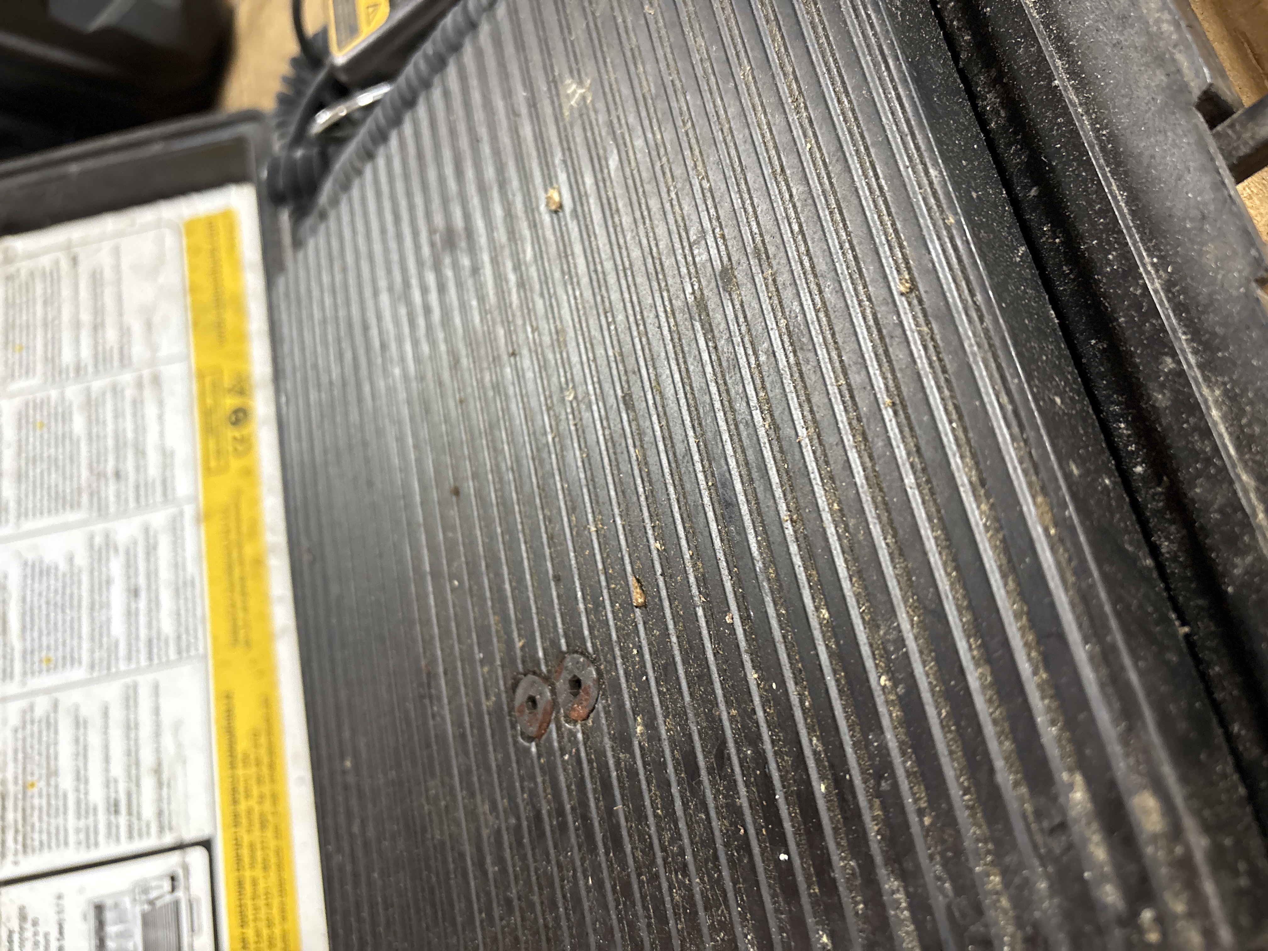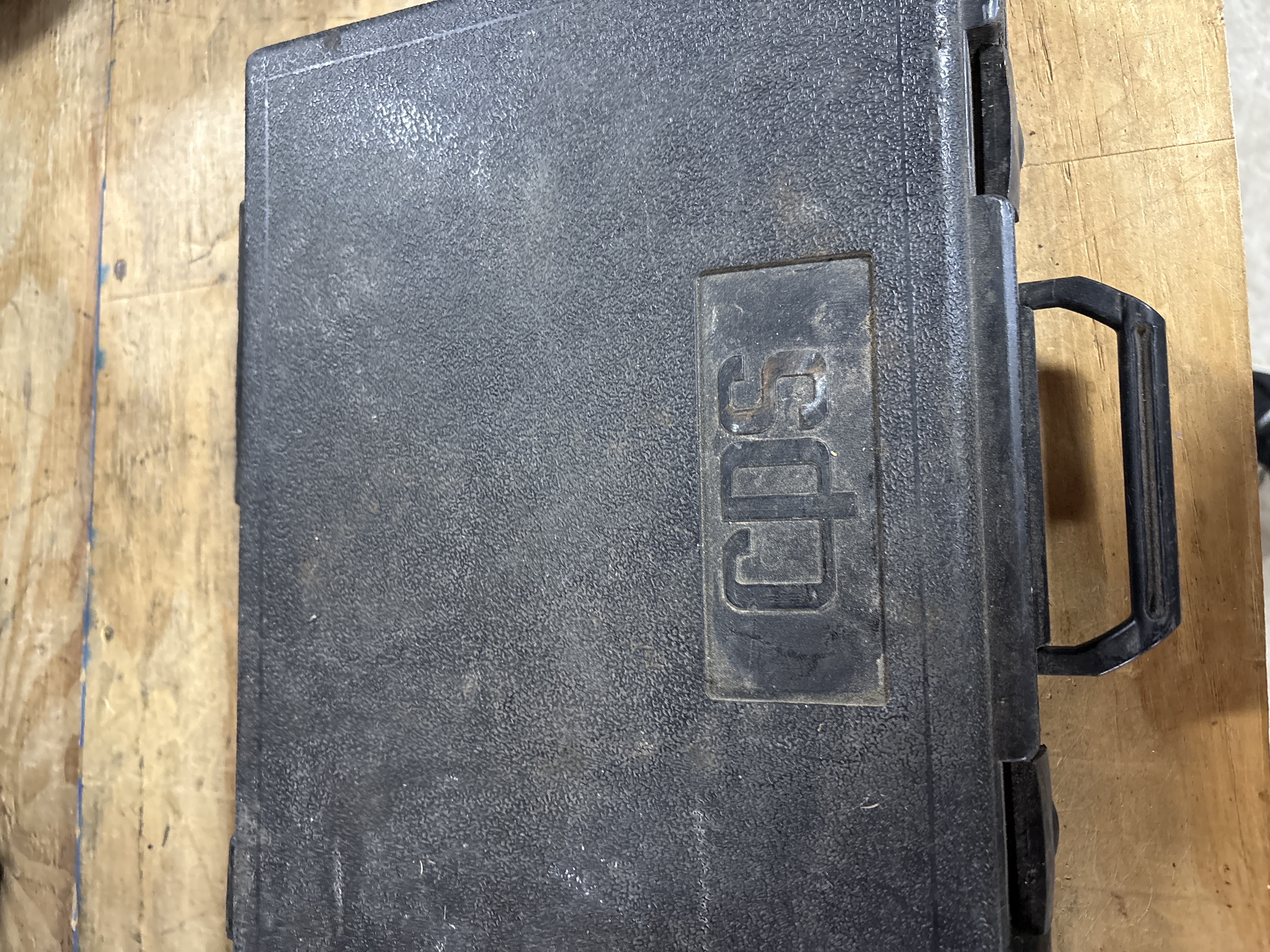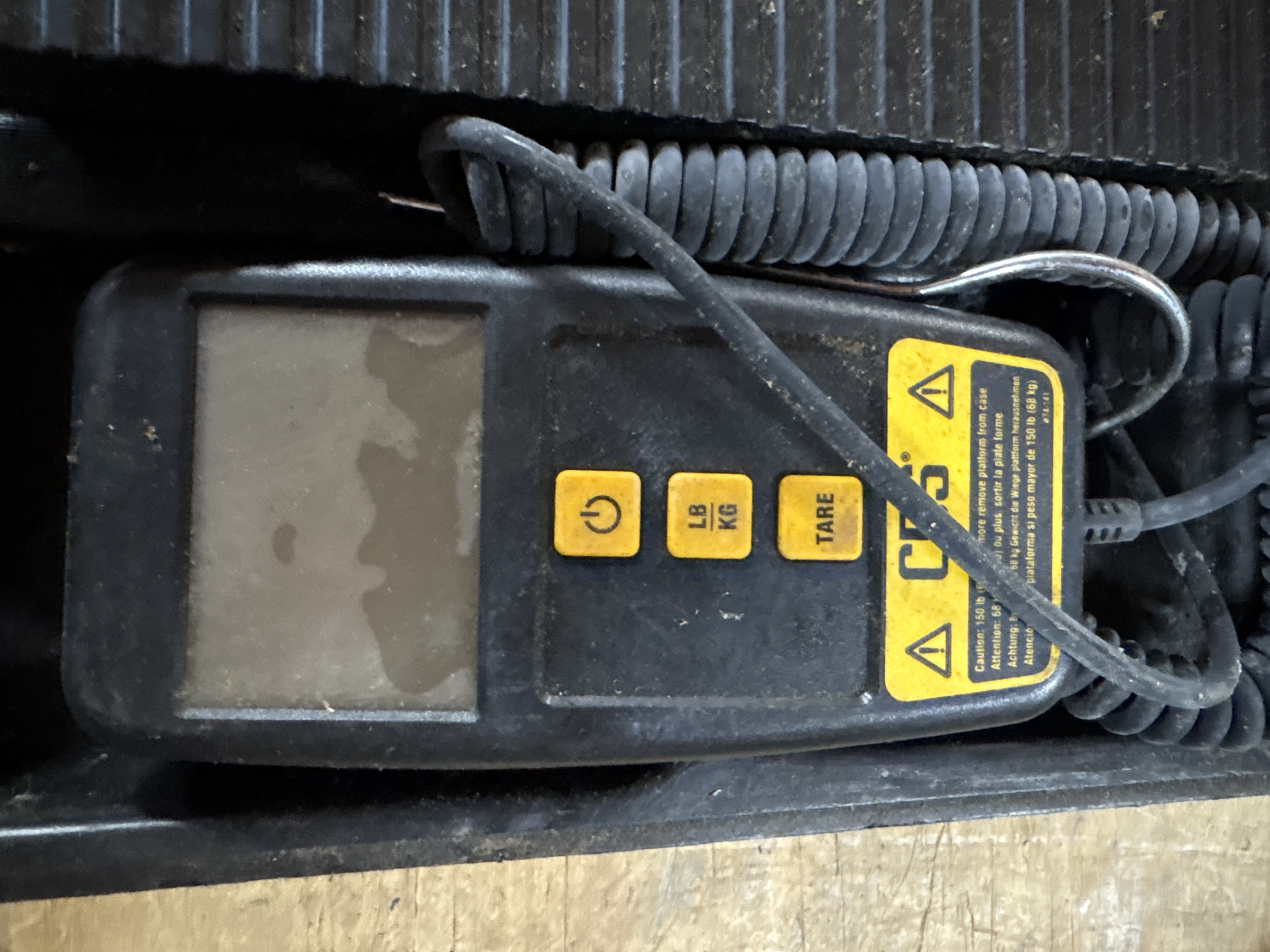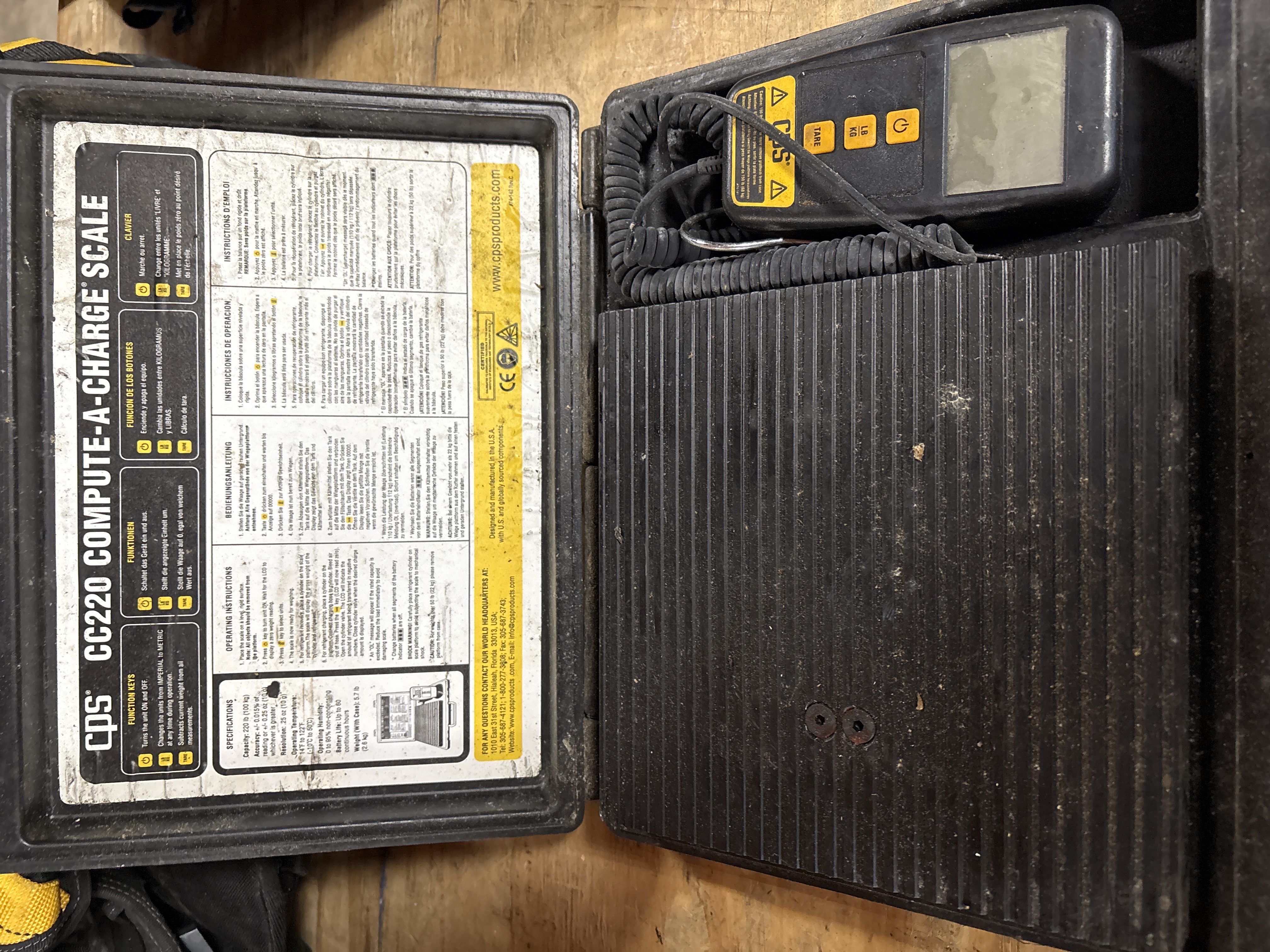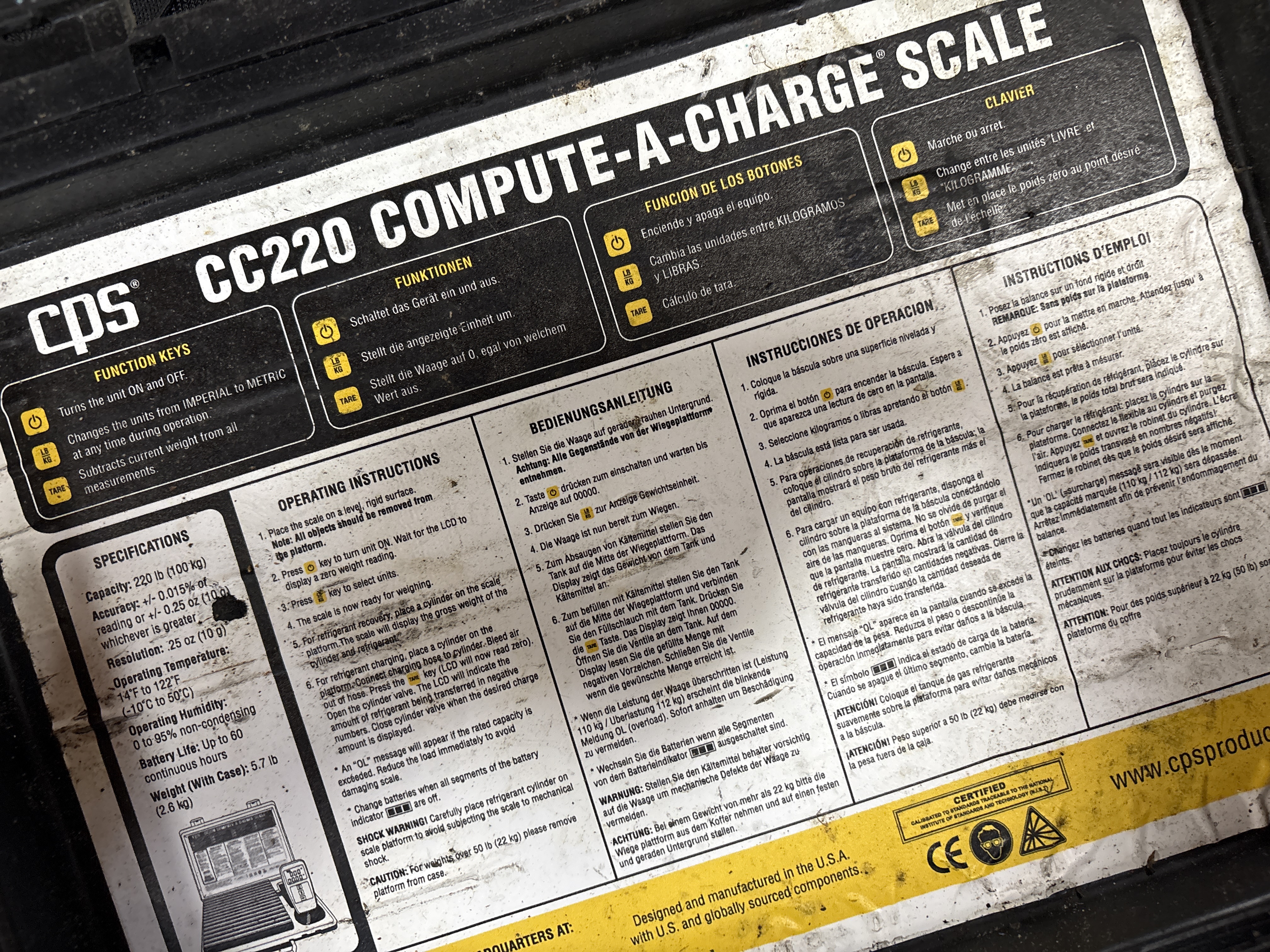 A CPS Products model CC220 Compute-A-Charge electronic refrigerant charging scale. This industrial-grade instrument is designed for weighing refrigerant cylinders during HVAC/R charging and recovery operations. The unit features a low-profile black ribbed weighing platform connected to a handheld digital remote control via a coiled cord. The remote interface includes a power button, unit selection for pounds or kilograms, and a tare function. The assembly is contained within its original black molded plastic hard-shell carrying case featuring the CPS logo. The interior lid contains a comprehensive label with operating instructions and technical specifications in English, German, Spanish, and French. Markings indicate the unit was manufactured in the U.S.A. and factory certified to NIST standards. The scale has a capacity of 220 pounds (100 kilograms) with a resolution of 0.25 ounces (10 grams).