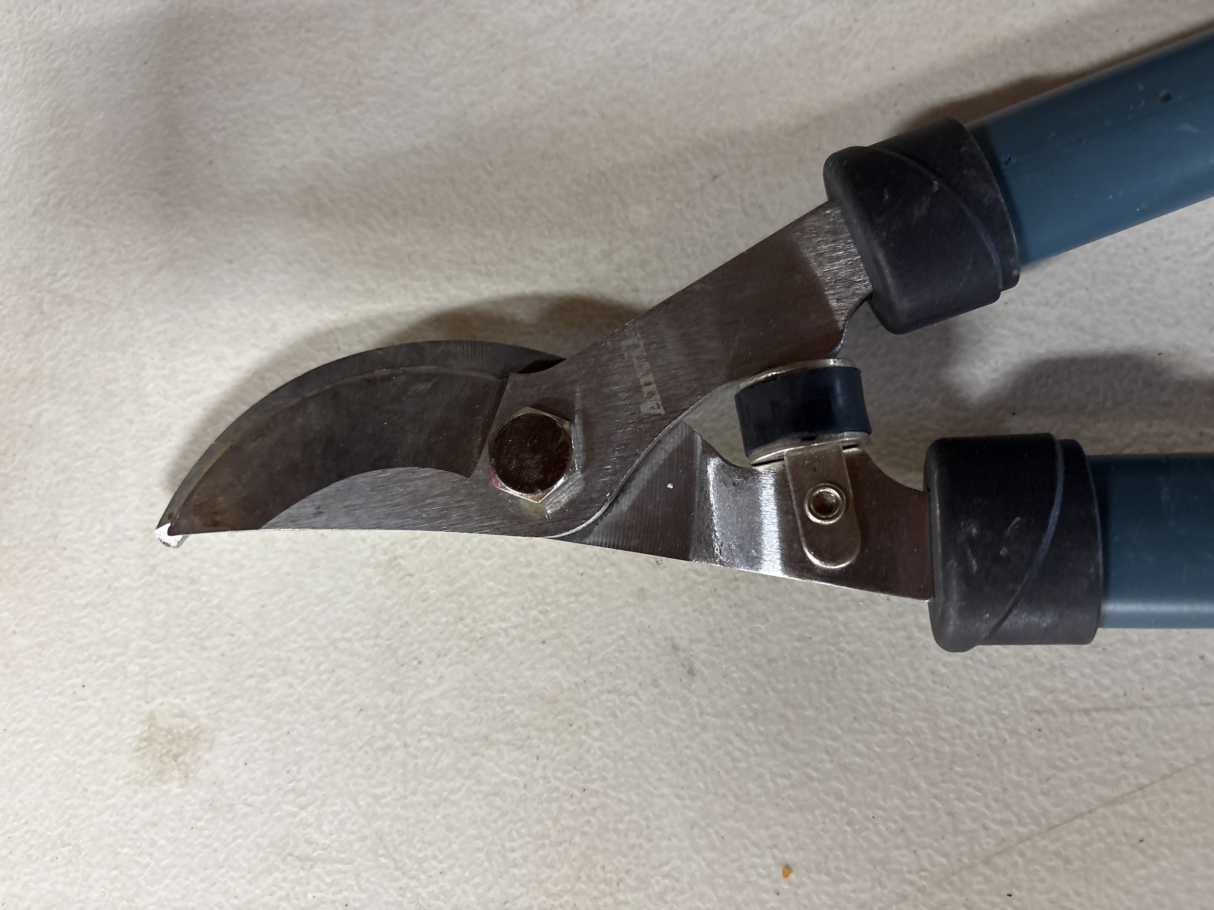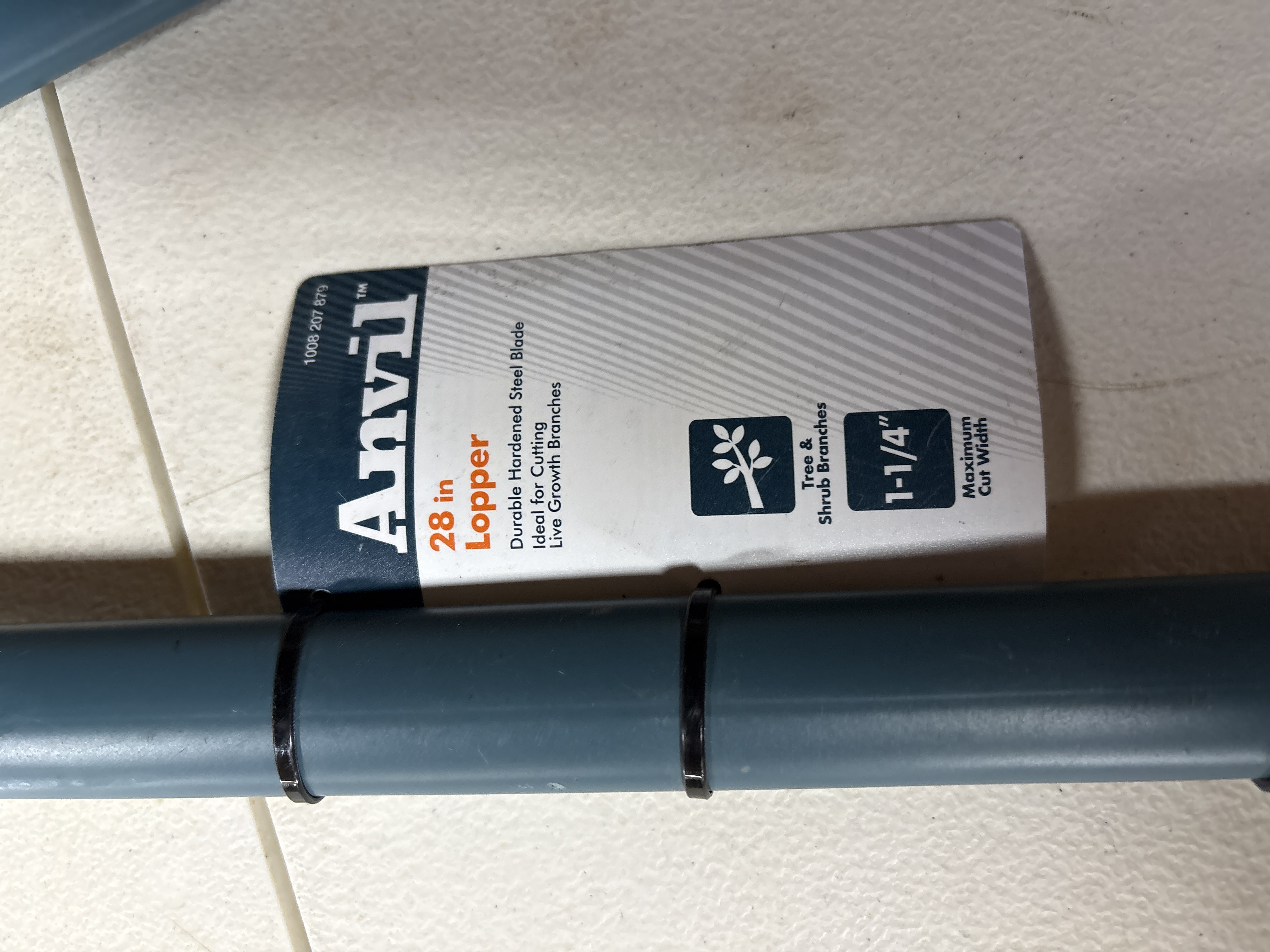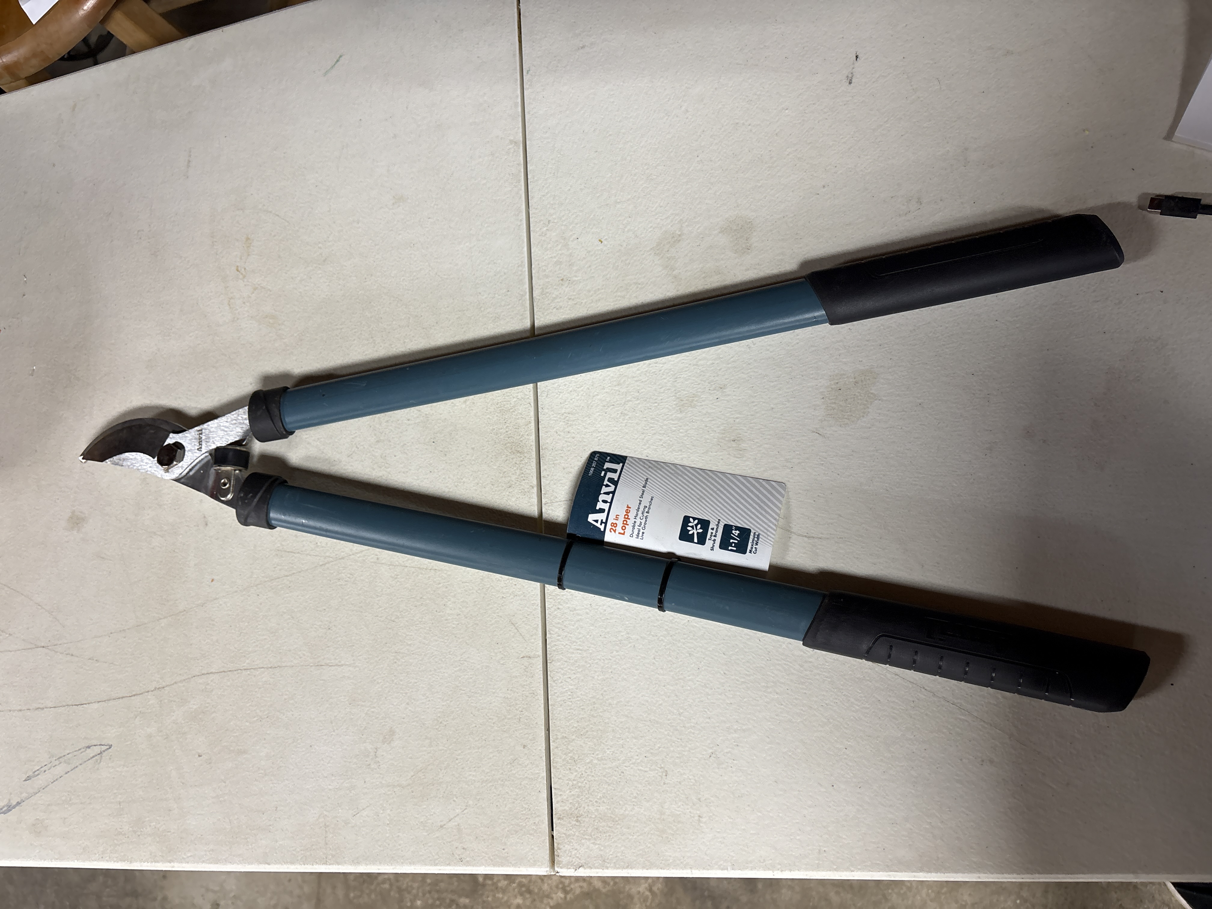 This is a contemporary bypass lopper manufactured by Anvil. The tool is designed for pruning live growth and features hardened steel blades. The handles are constructed from tubular metal with a teal finish and are fitted with ergonomic black molded grips. The cutting mechanism includes a steel pivot bolt and nut assembly with integrated rubber shock-absorbing bumpers. The upper blade tang is stamped with the Anvil logo. The original retail tag is attached, identifying the model as a 28 inch lopper with a 1-1/4 inch maximum cut width and SKU 1008 207 879.