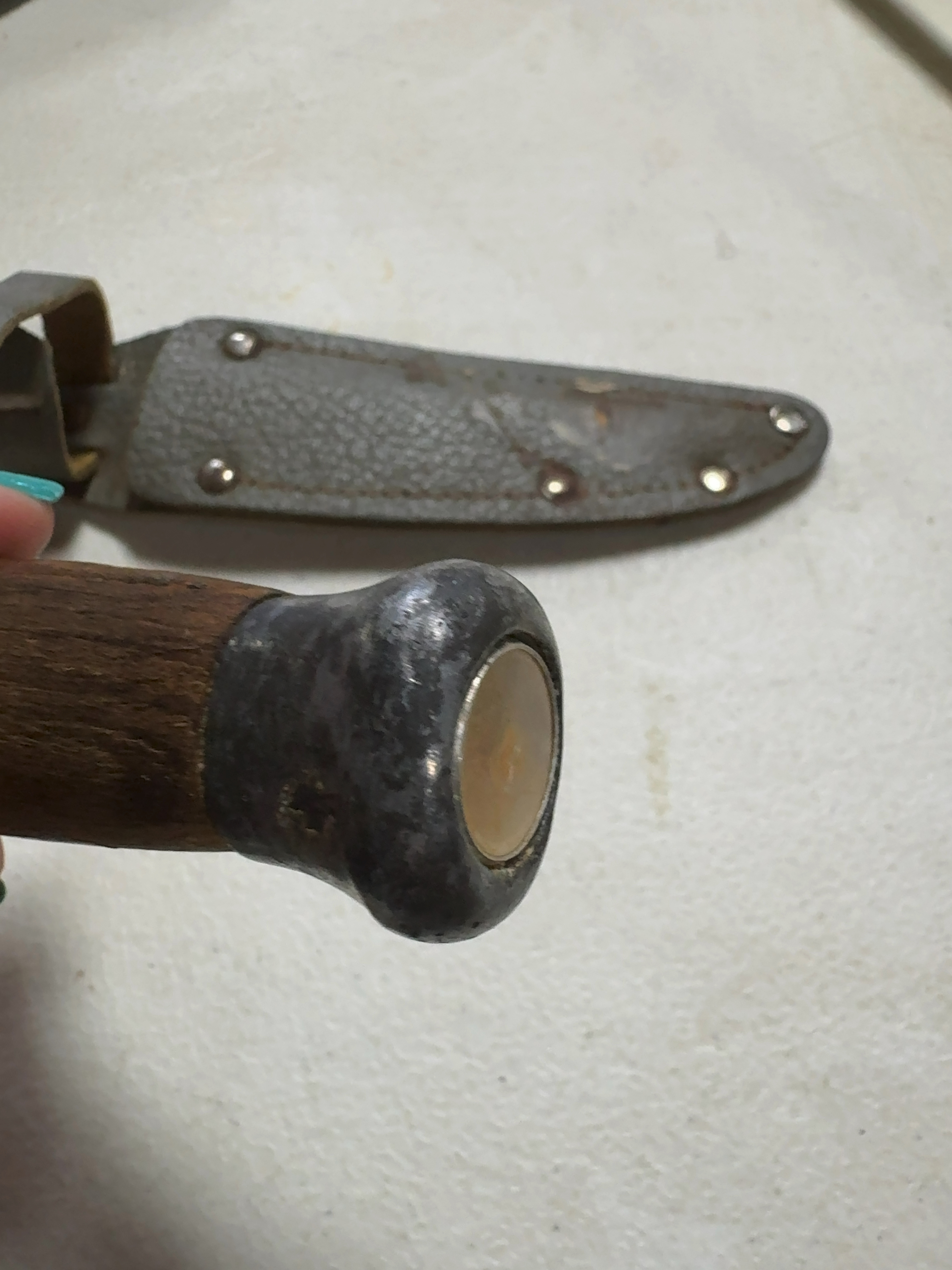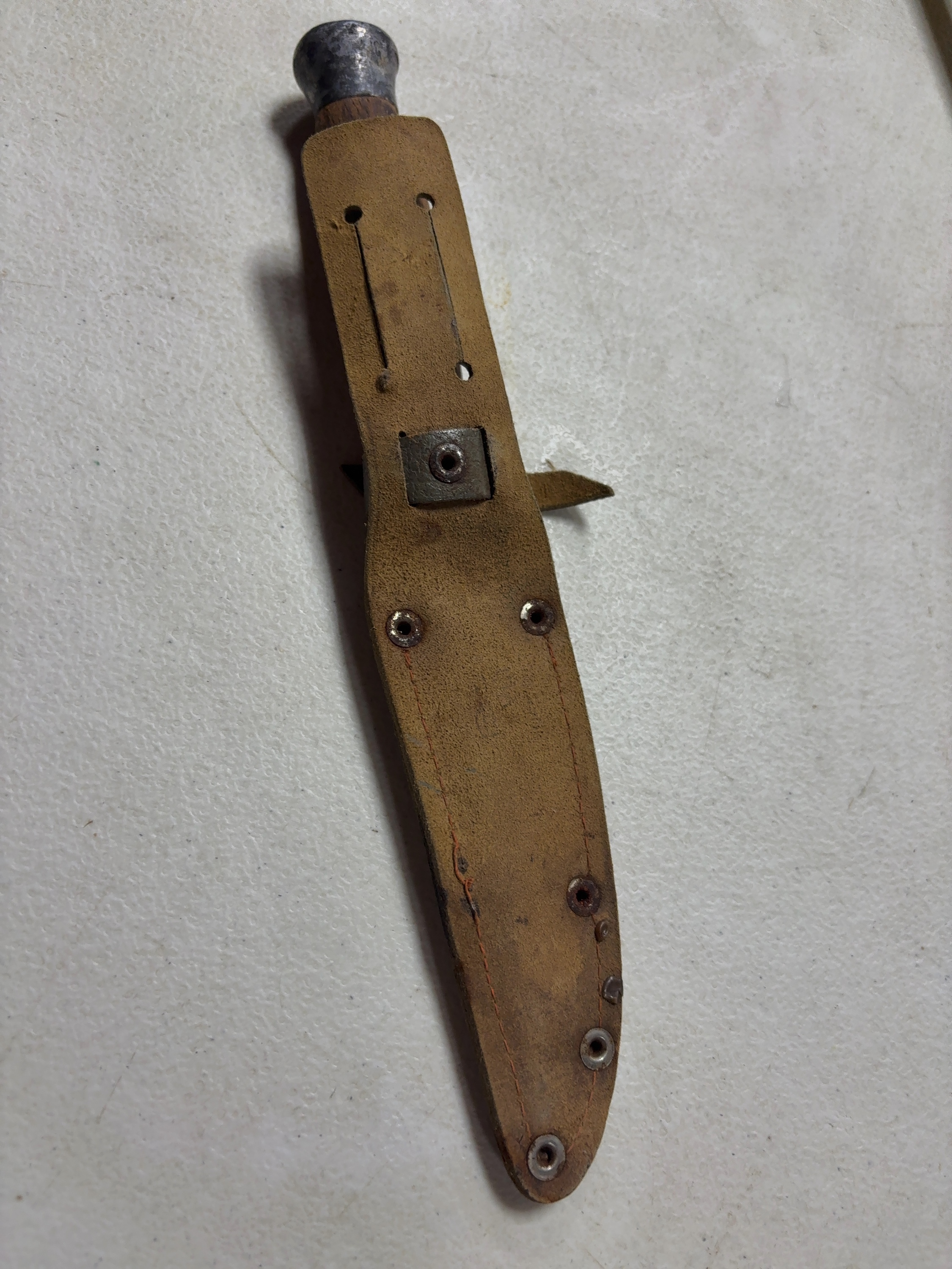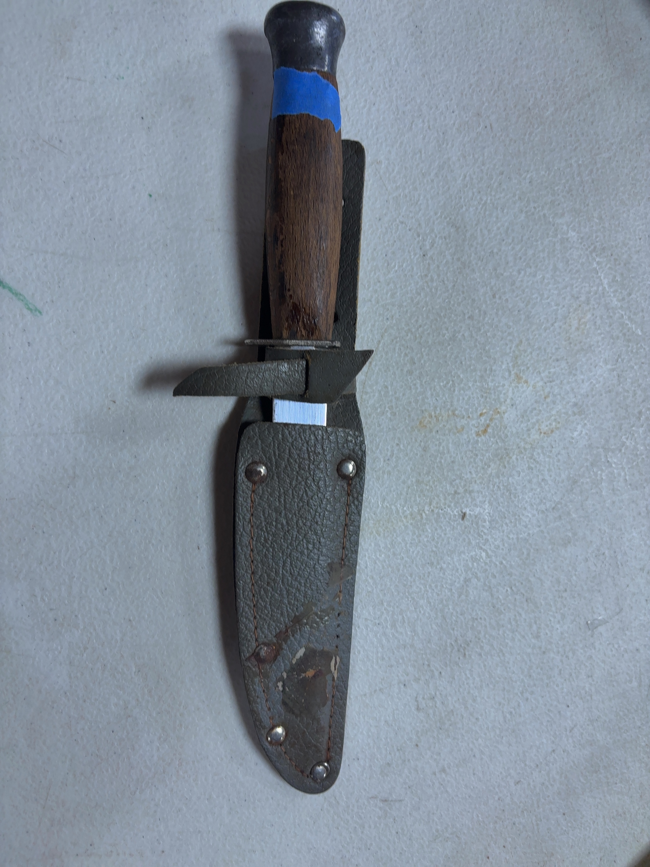 This is a Finnish puukko style fixed-blade utility knife produced in Kauhava, Finland. The maker is identified by a circular insert located on the pommel end which is marked ANTTI SOINI. The knife features a single-edged steel blade with a fuller on one side. The handle is constructed of turned wood with a dark brown finish. It is fitted with an oval metal crossguard and a bulbous metal pommel. A piece of blue tape is currently adhered to the upper portion of the handle. The knife is accompanied by a grayish-green textured leather sheath with metal rivets and a belt loop.