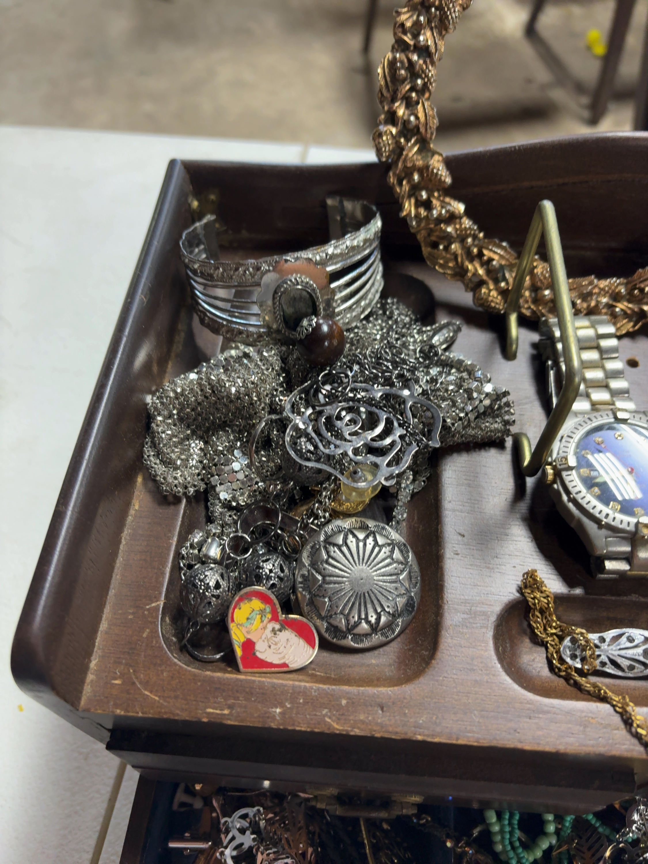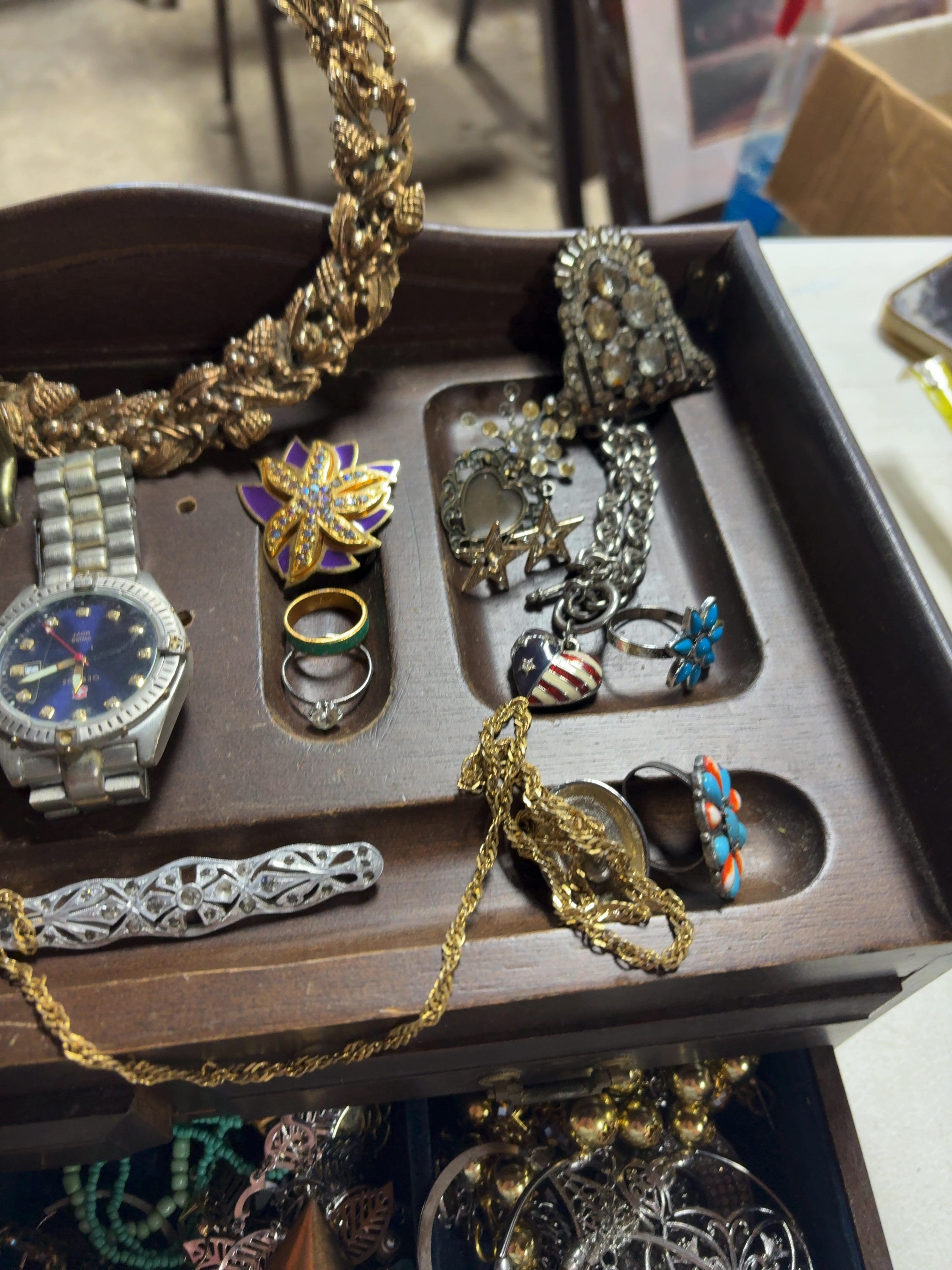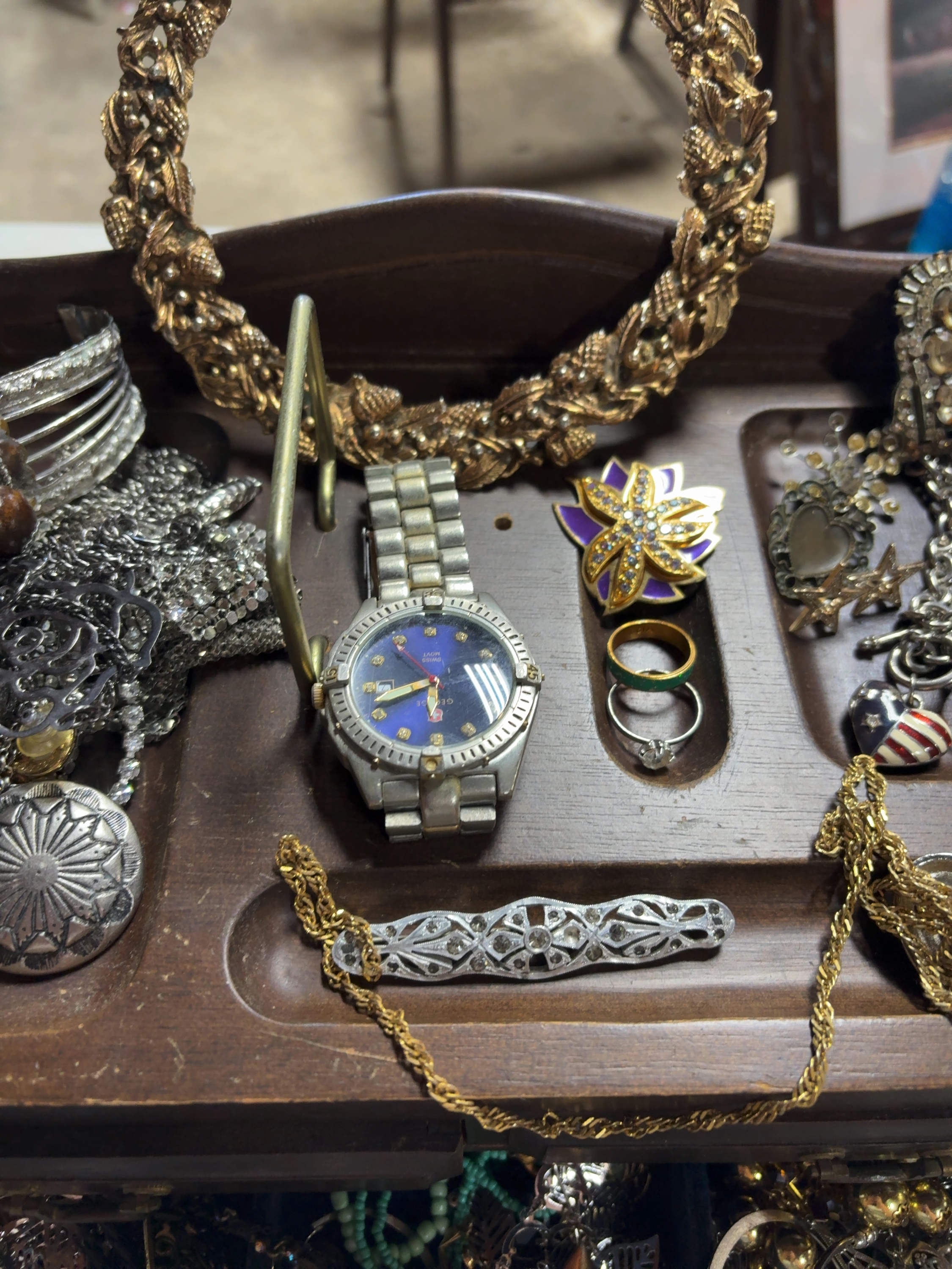 An assortment of costume jewelry and accessories presented in a multi-tiered wooden jewelry box. The collection includes pieces in silver-tone, yellow gold-tone, and white metal. Notable items include a silver-tone wristwatch with a blue sunburst dial, marked GEORGE and SWISS MOVT, featuring a metal link bracelet. The lot contains a large textured yellow gold-tone wreath-design collar necklace and a variety of other necklaces in mesh and beaded styles. Brooches and pins include an openwork filigree-style bar brooch set with clear round-cut stones, a purple and yellow floral enamel pin, and a heart-shaped American flag charm. The ring selection features a cluster ring with turquoise-colored cabochons, a white metal solitaire ring with a small clear stone, and various metal bands. Additional items include a silver-tone etched cuff bracelet and numerous loose components stored within blue velvet-lined drawers. No metal purity hallmarks or maker’s marks were observed on the jewelry pieces.