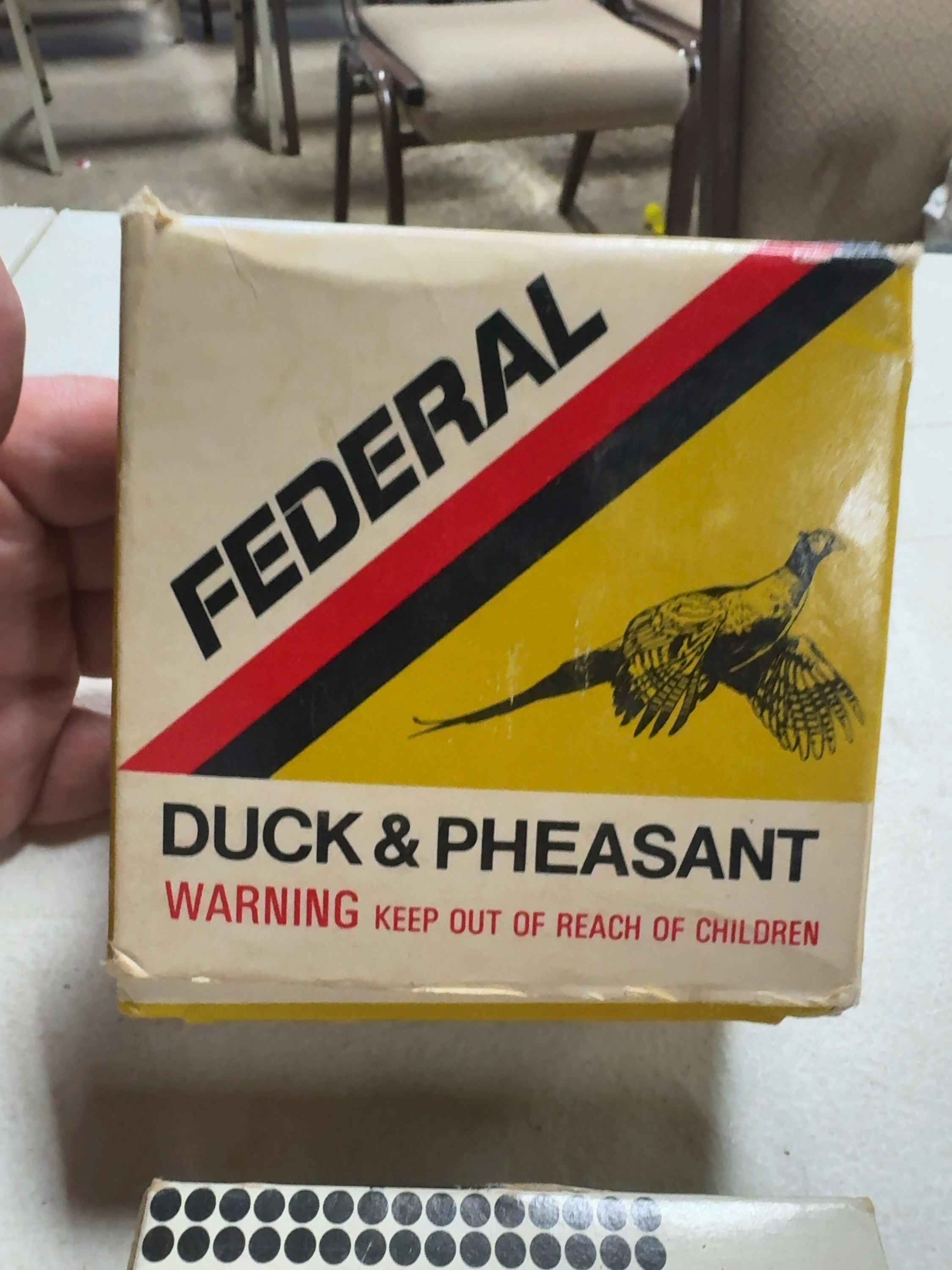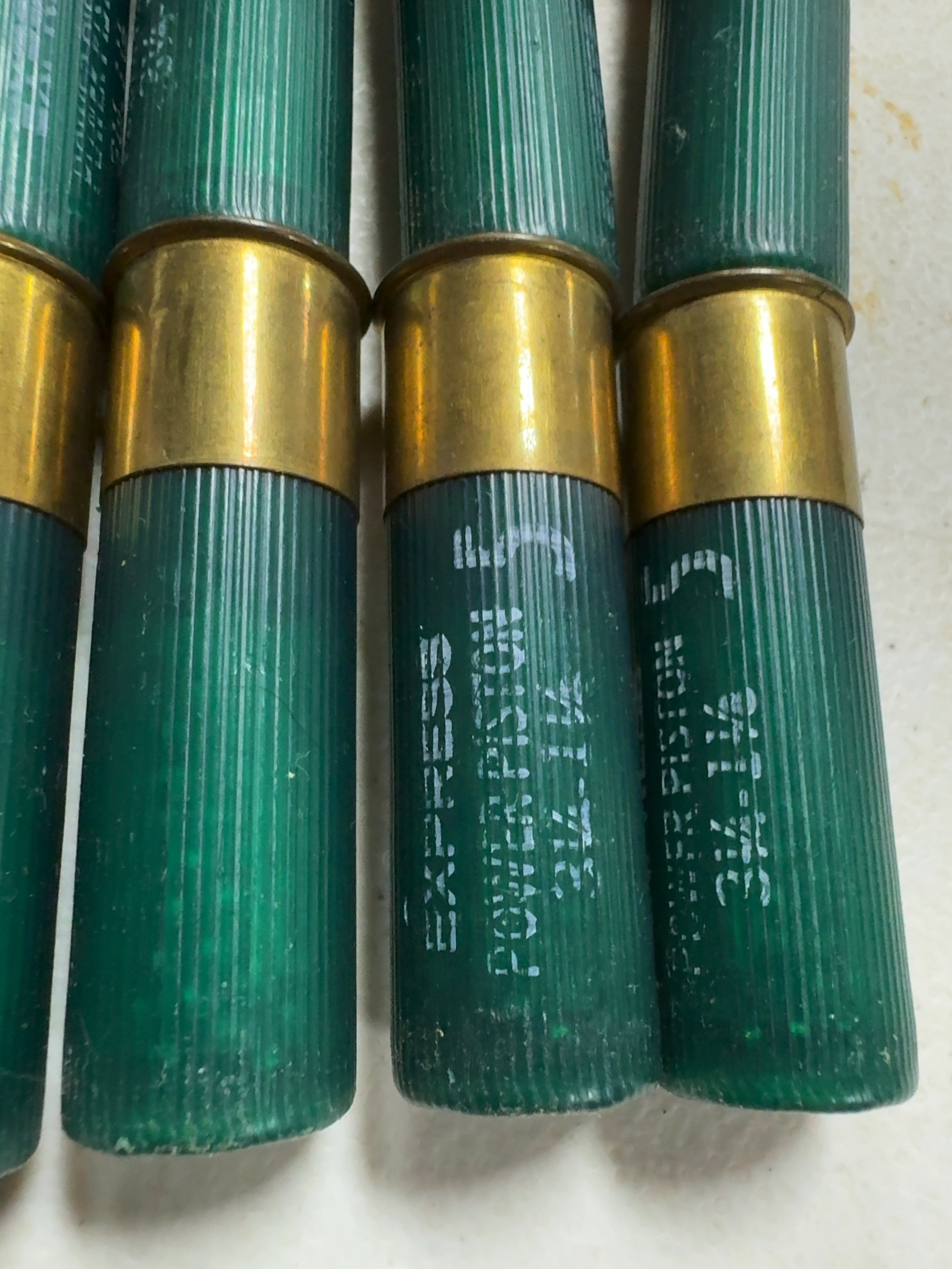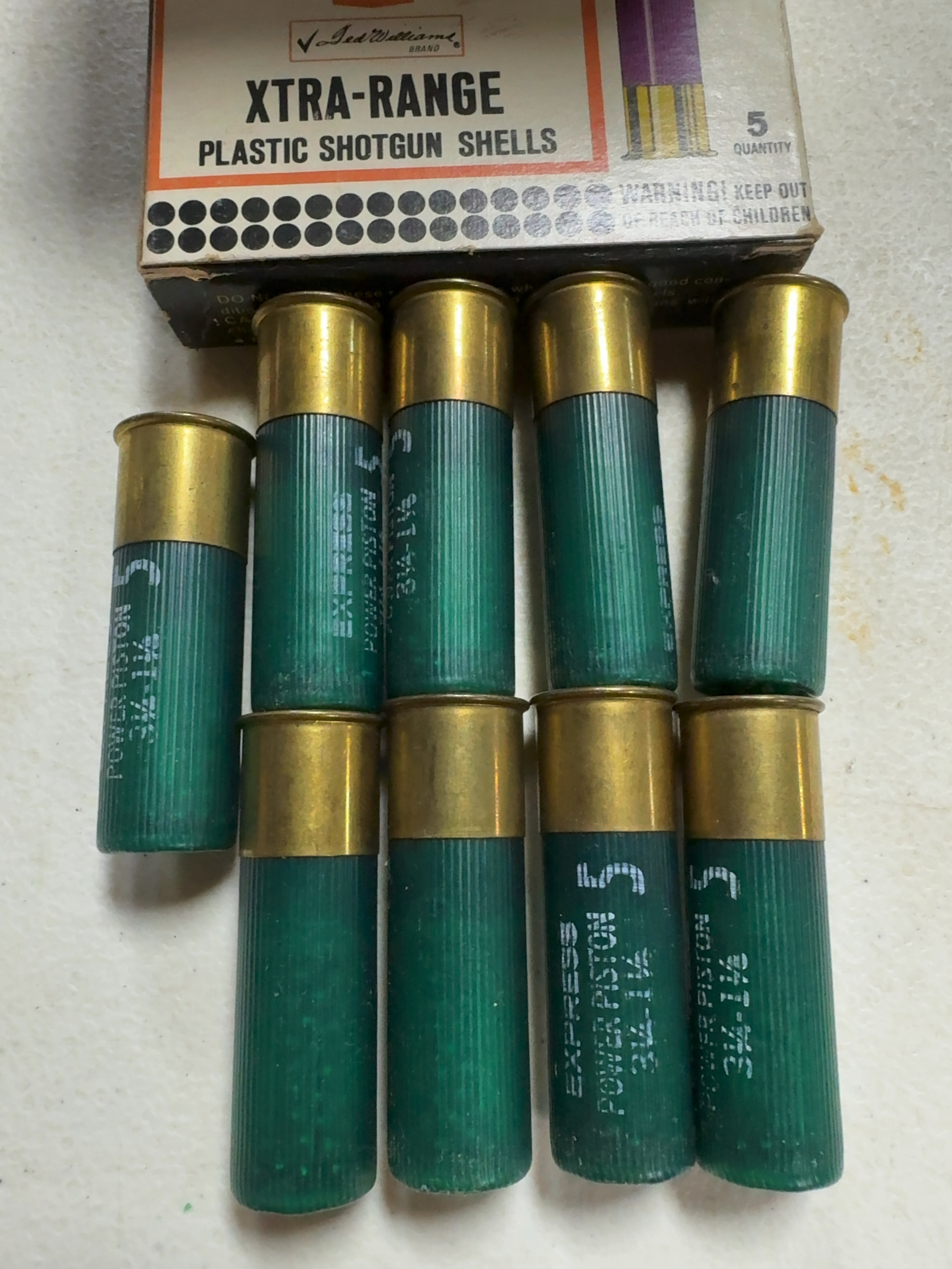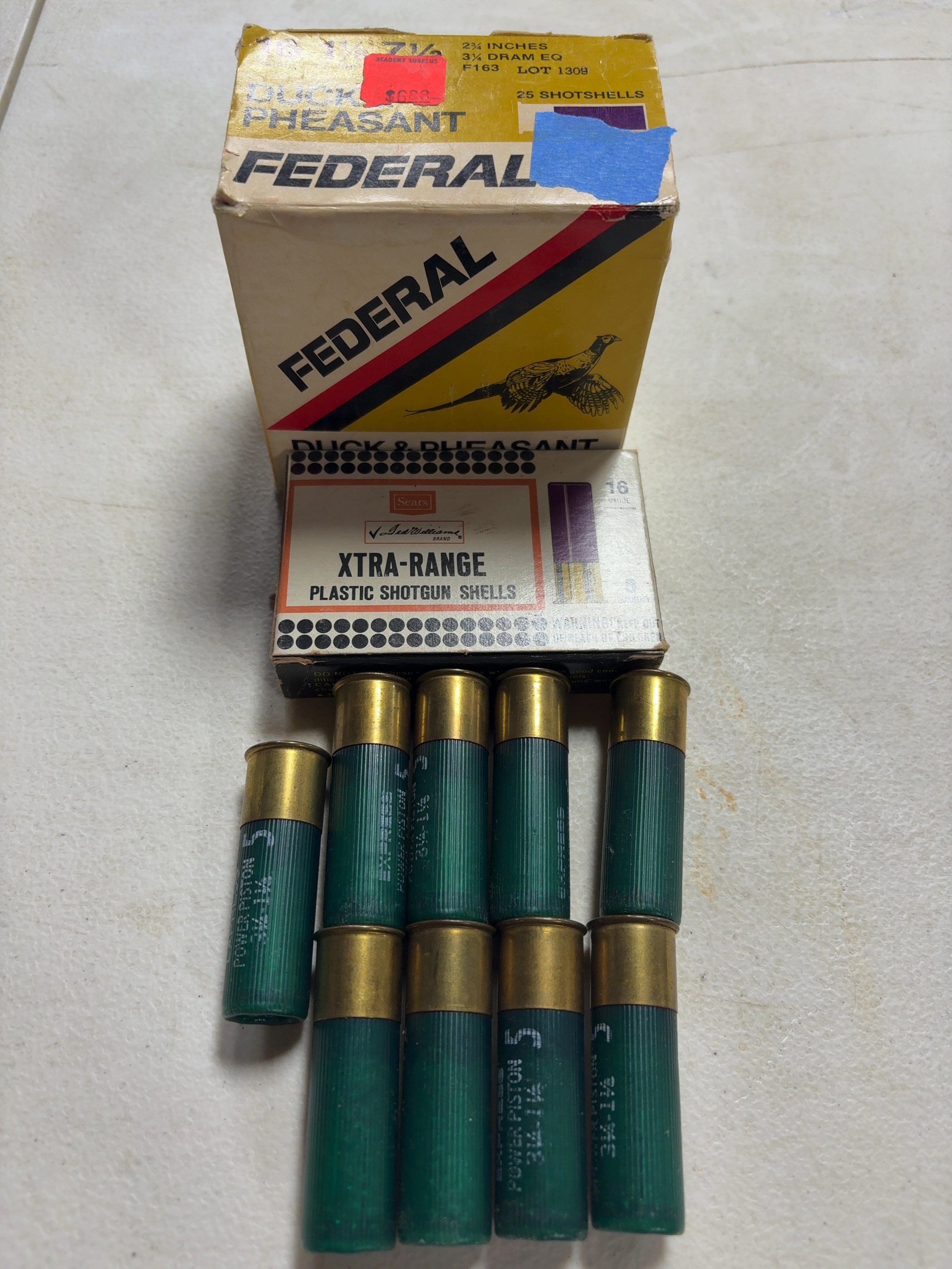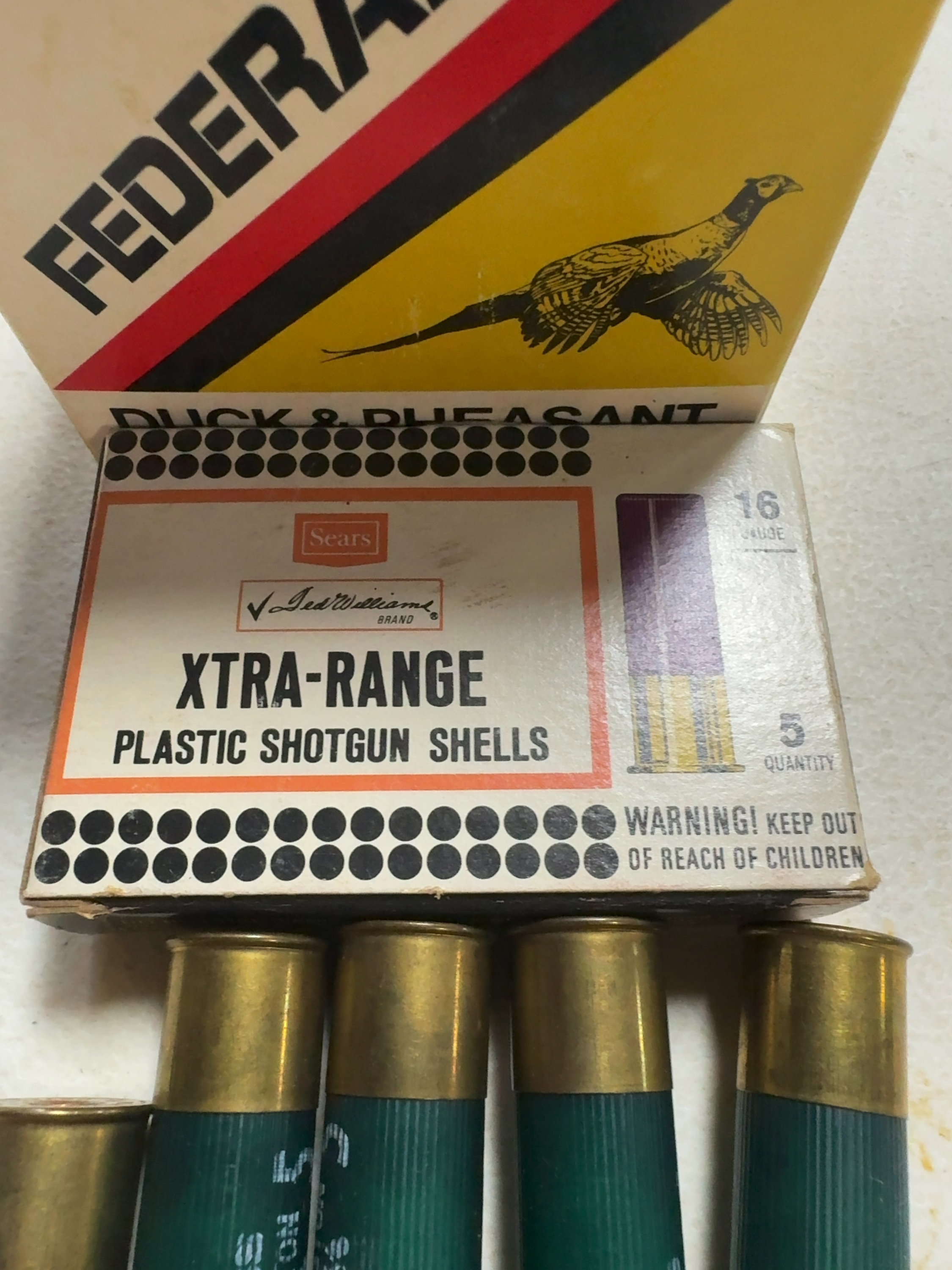 This lot consists of a collection of vintage shotgun ammunition and related packaging. The items include a Federal Duck and Pheasant 12-gauge ammunition box, model F163, Lot 1309, designed for 2 3/4-inch shells with a 3 1/4 dram equivalent and #7 1/2 shot size. Also included is a Sears Ted Williams Brand XTRA-RANGE 16-gauge 5-count plastic shotgun shell box. The collection features loose 12-gauge Remington brand shotgun shells with green ribbed plastic hulls. These shells are marked with EXPRESS, POWER PISTON, load data of 3 1/4 – 1 1/4, and shot size 5. The shells are constructed with plastic hulls and brass heads.