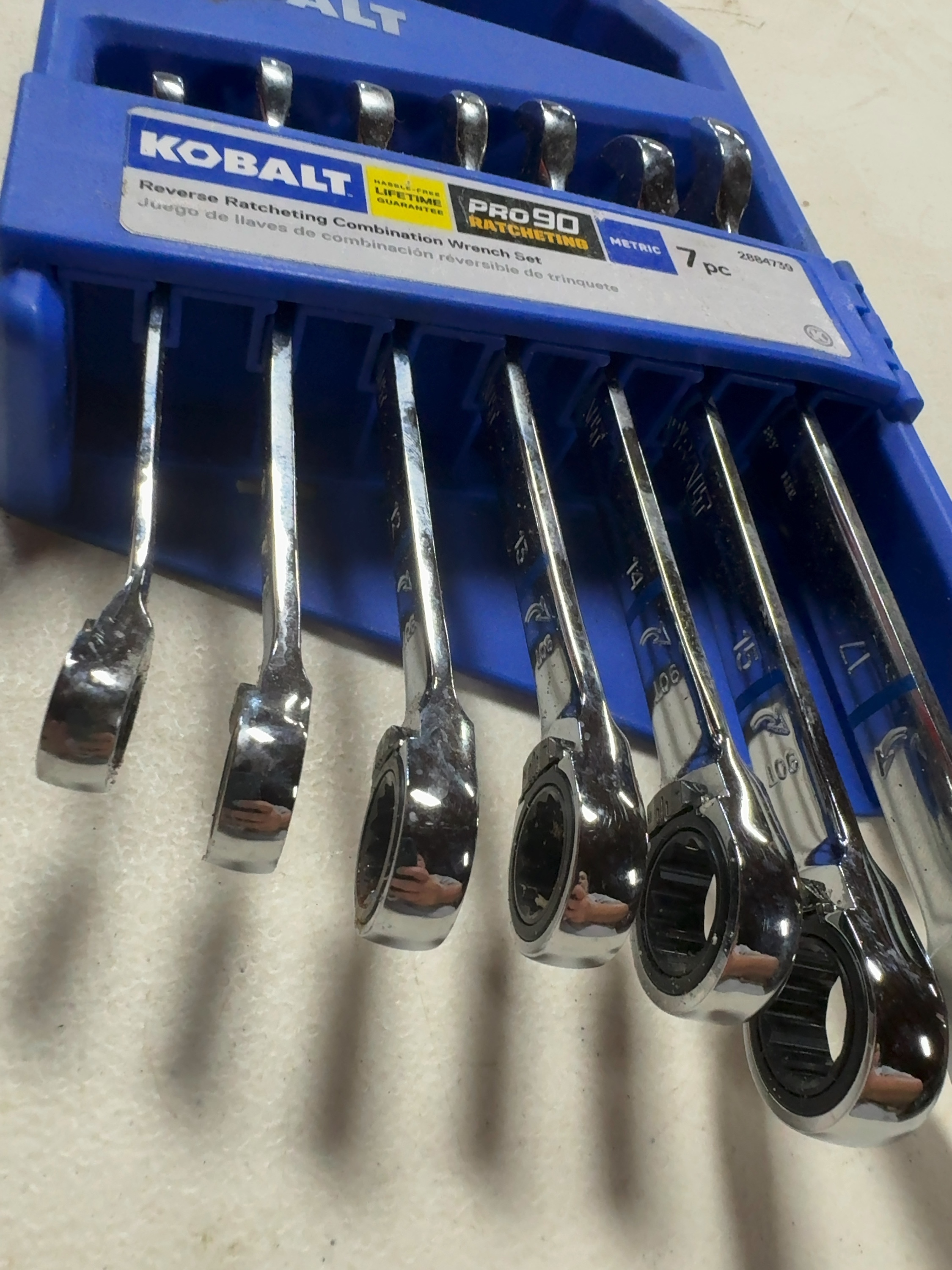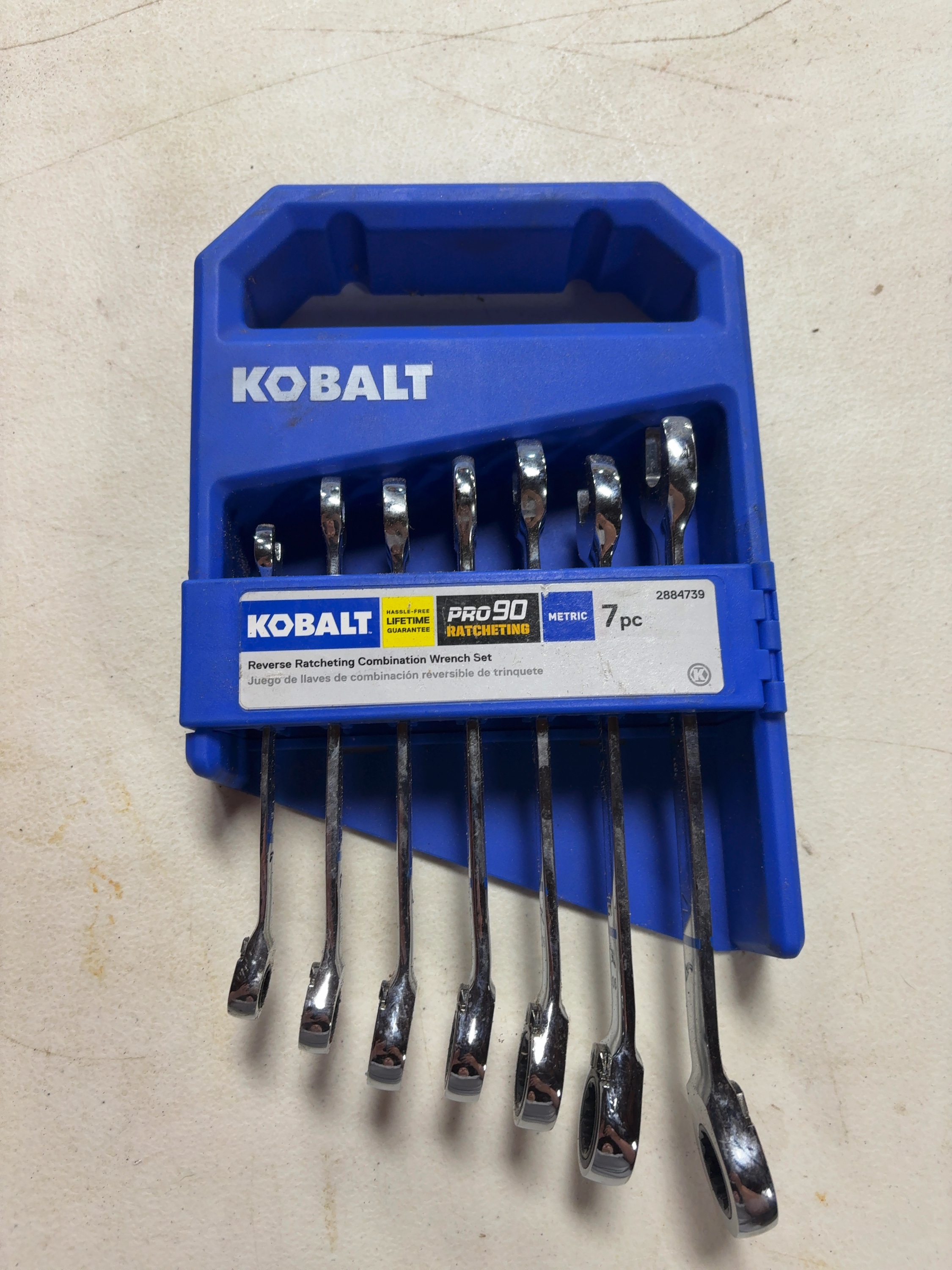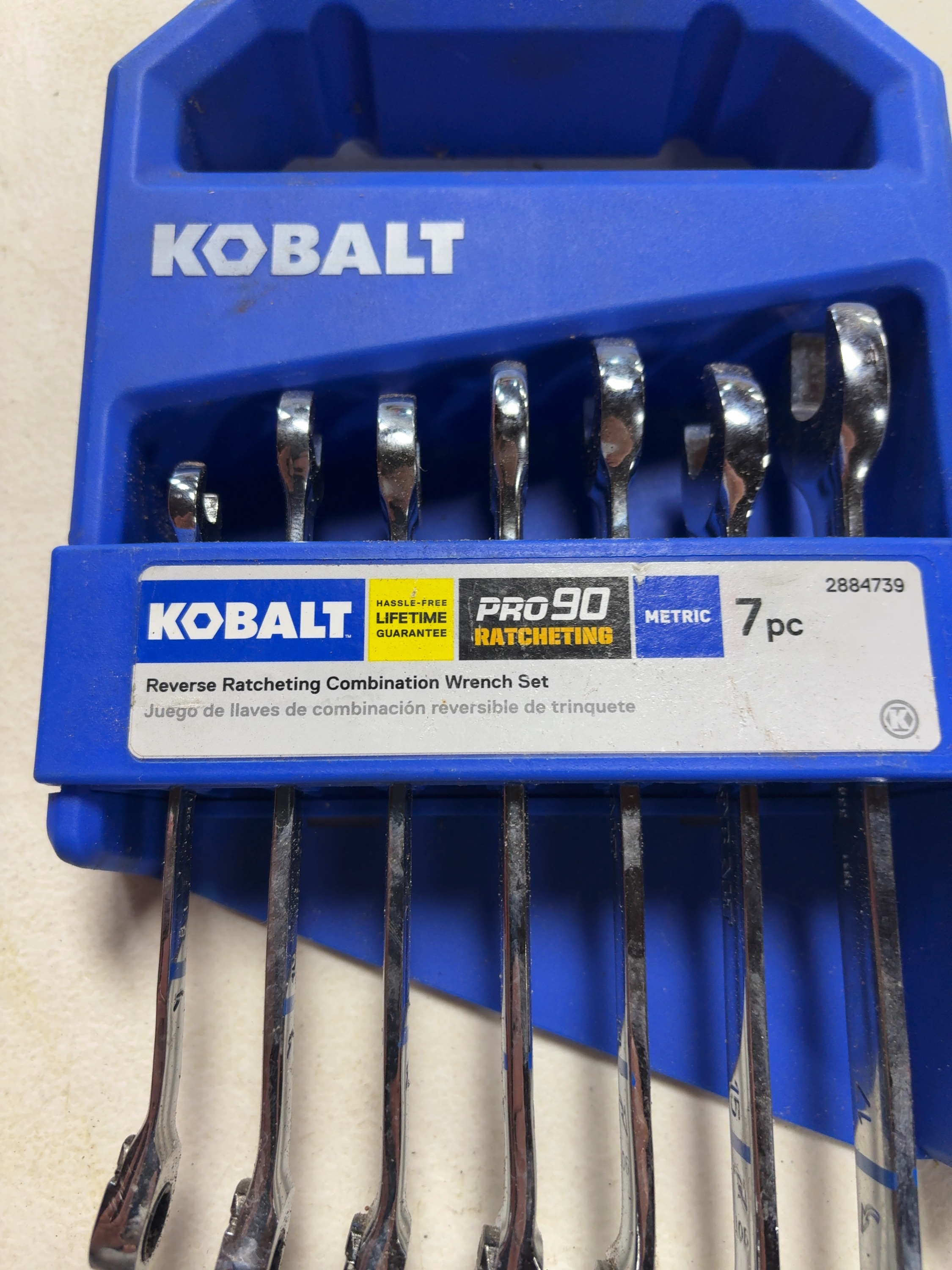A Kobalt Pro 90 7-piece metric reverse ratcheting combination wrench set. The tools are constructed from chrome-plated steel and are housed in a blue plastic storage and carrying rack. This set belongs to the Pro 90 line, characterized by a 90-tooth ratcheting mechanism. The blue plastic case is embossed with the Kobalt brand name. The original adhesive label is present and contains the model number 2884739, the Pro 90 branding, and the 7pc metric designation. The individual wrenches feature stamped markings on the handles indicating metric sizes, including 14mm, 15mm, and 17mm, as well as the mark 10G.