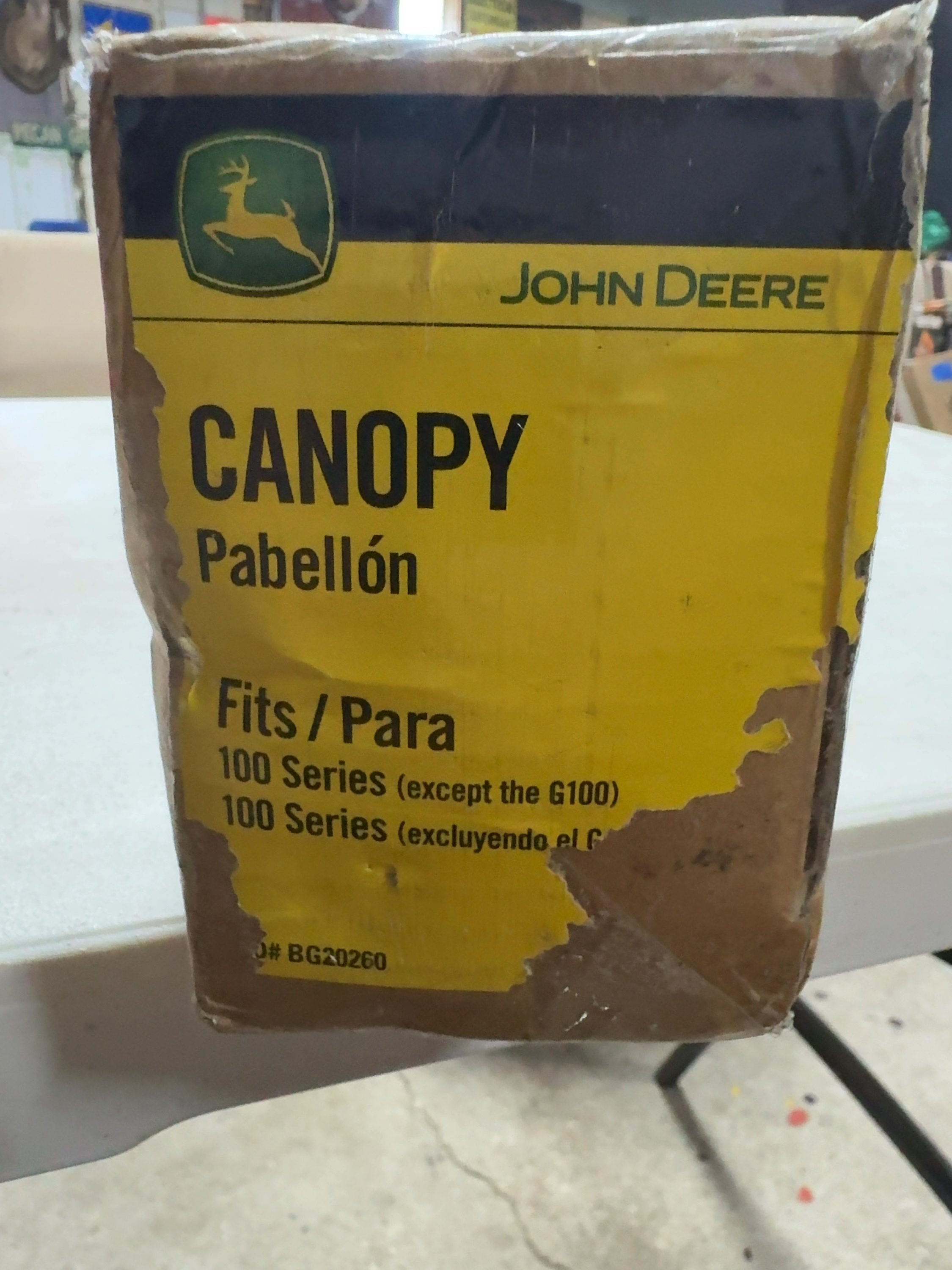 This John Deere Sun Canopy, part number BG20260 and SKU 205-558, is an attachment designed for John Deere 100 Series lawn tractors, specifically excluding the G100 model. The unit is constructed from woven nylon and is engineered to provide approximately 700 square inches of overhead sun protection. The design allows for tool-free installation by sliding the frame into the existing Cargo Mount System ports located on the rear of the tractor. The item is contained within its original manufacturer packaging. The exterior of the box displays the John Deere logo, model compatibility information, and technical specifications in English and Spanish.
