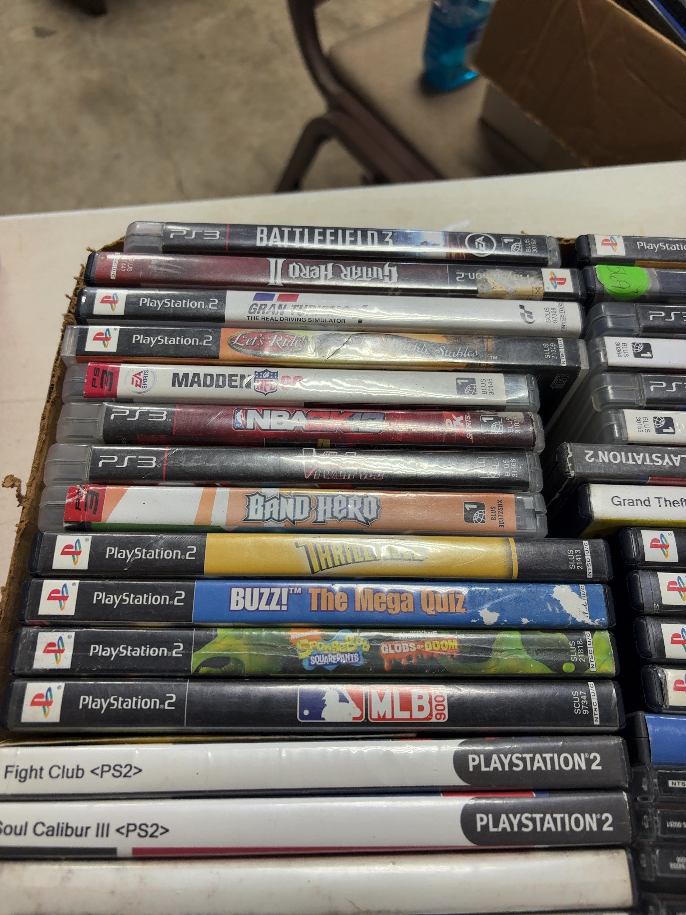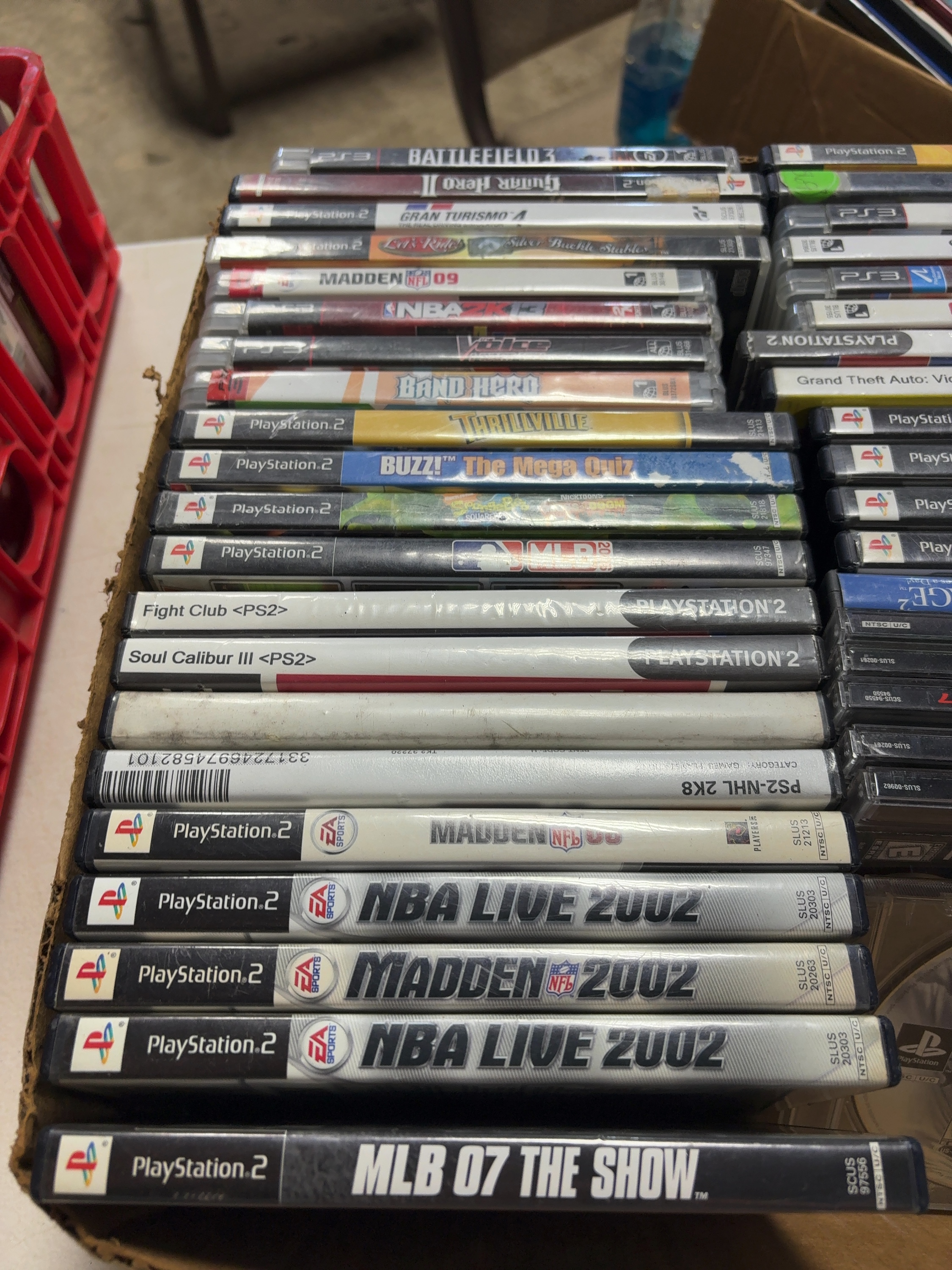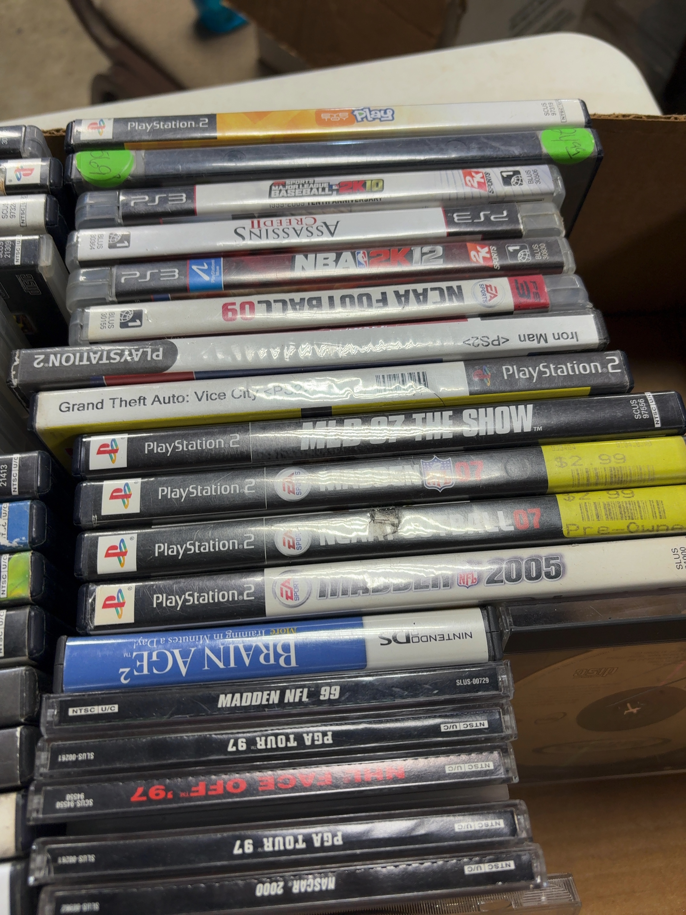 This lot comprises a collection of approximately 37 video game titles spanning several console generations, including the Sony PlayStation, PlayStation 2, PlayStation 3, and the Nintendo DS handheld system. The inventory is primarily composed of sports simulations from Electronic Arts (EA Sports), 2K Sports, and Sony Computer Entertainment, featuring franchises such as Madden NFL, NBA Live, MLB The Show, and NCAA Football. Action and variety titles are also present, including Grand Theft Auto: Vice City, SoulCalibur III, Assassin’s Creed II, Battlefield 3, and SpongeBob SquarePants: Globs of Doom. The media includes optical discs and one cartridge for the Nintendo DS system. Packaging varies across the lot, with some games in original translucent or opaque plastic cases, others in standard jewel cases, and some in generic sleeves. All items are marked for the NTSC-U/C North American region.