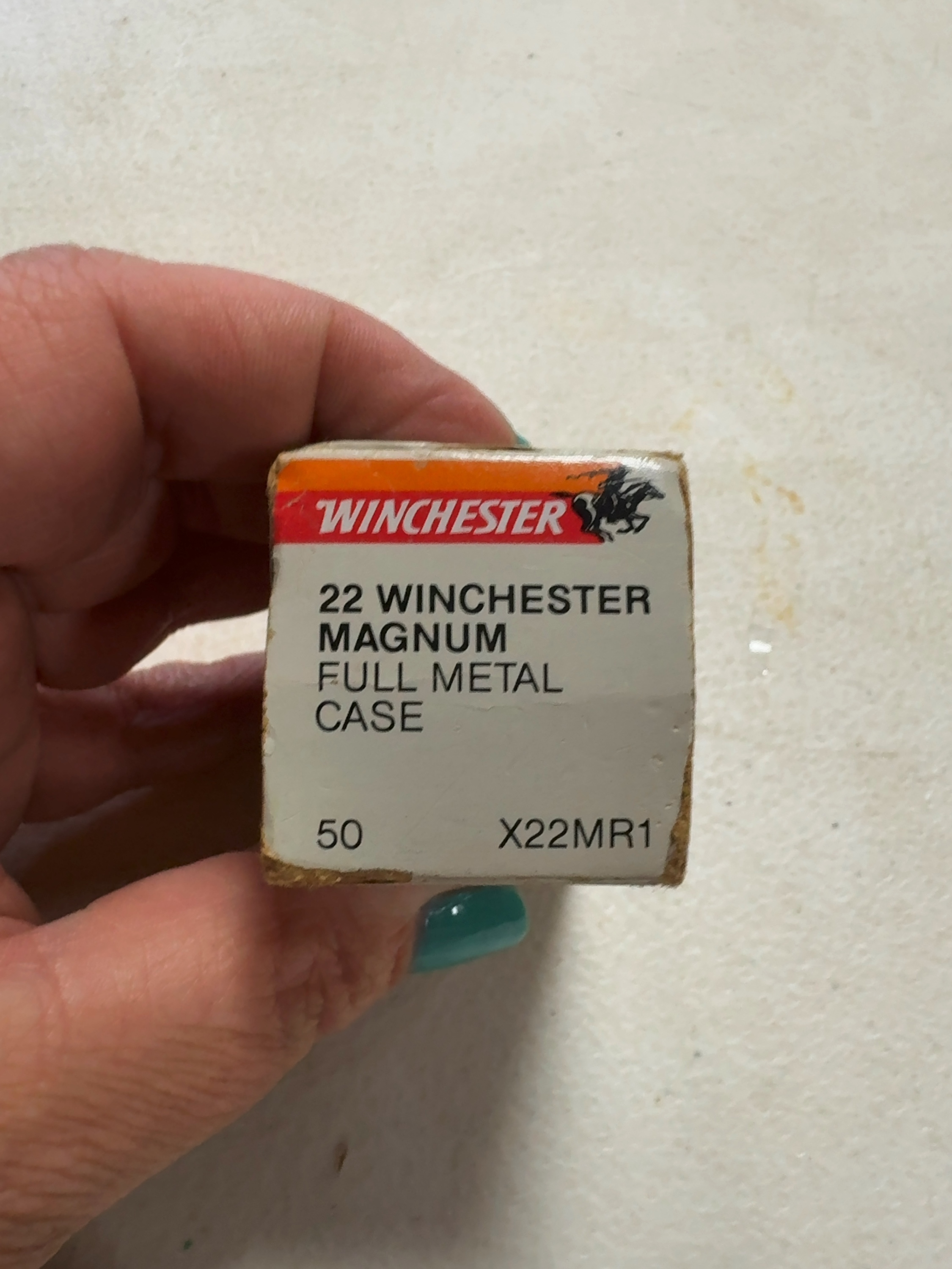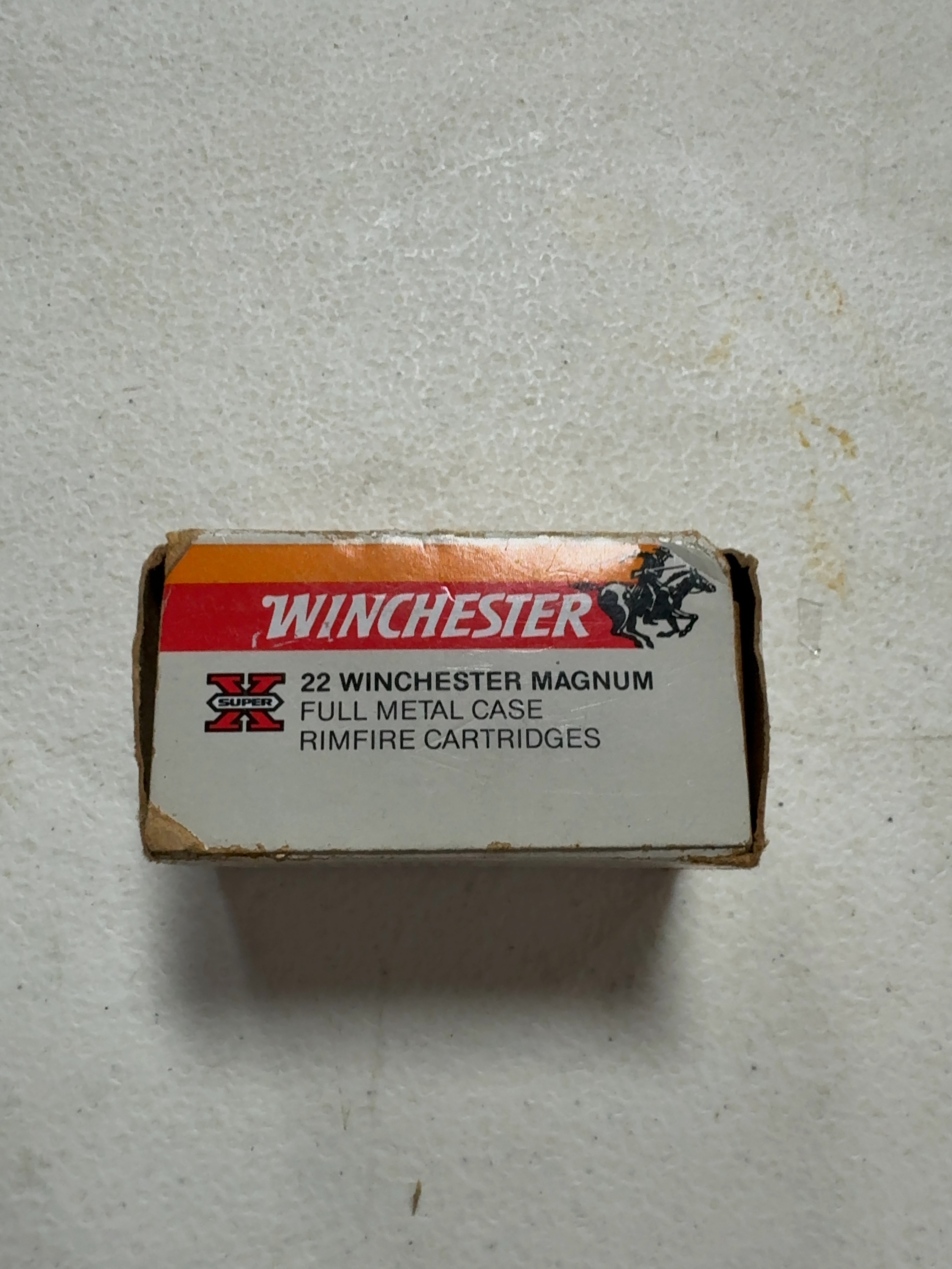 This lot consists of one box of Winchester Super-X .22 Winchester Magnum Rimfire (WMR) ammunition containing 50 cartridges. These rounds are loaded with 40 grain full metal case projectiles, suitable for target shooting and small game hunting. The cartridges are contained within a gray, white, and red cardboard box featuring the Winchester brand name and horse-and-rider logo. Verbatim markings on the box face include 22 WINCHESTER MAGNUM FULL METAL CASE RIMFIRE CARTRIDGES and the Super X logo. The end flap is marked with the quantity 50 and the product code X22MR1. The ammunition is factory-loaded and remains in its original packaging.