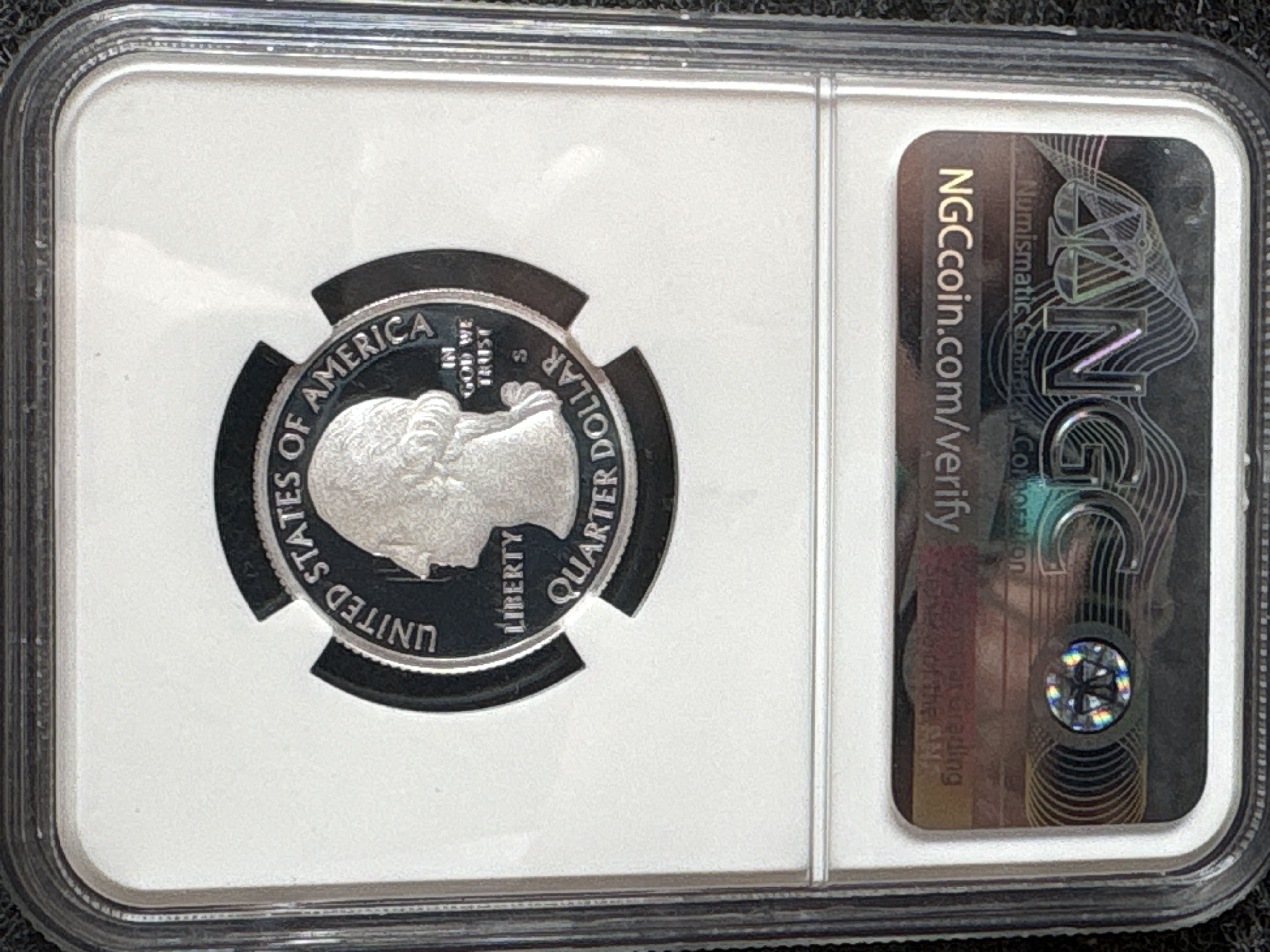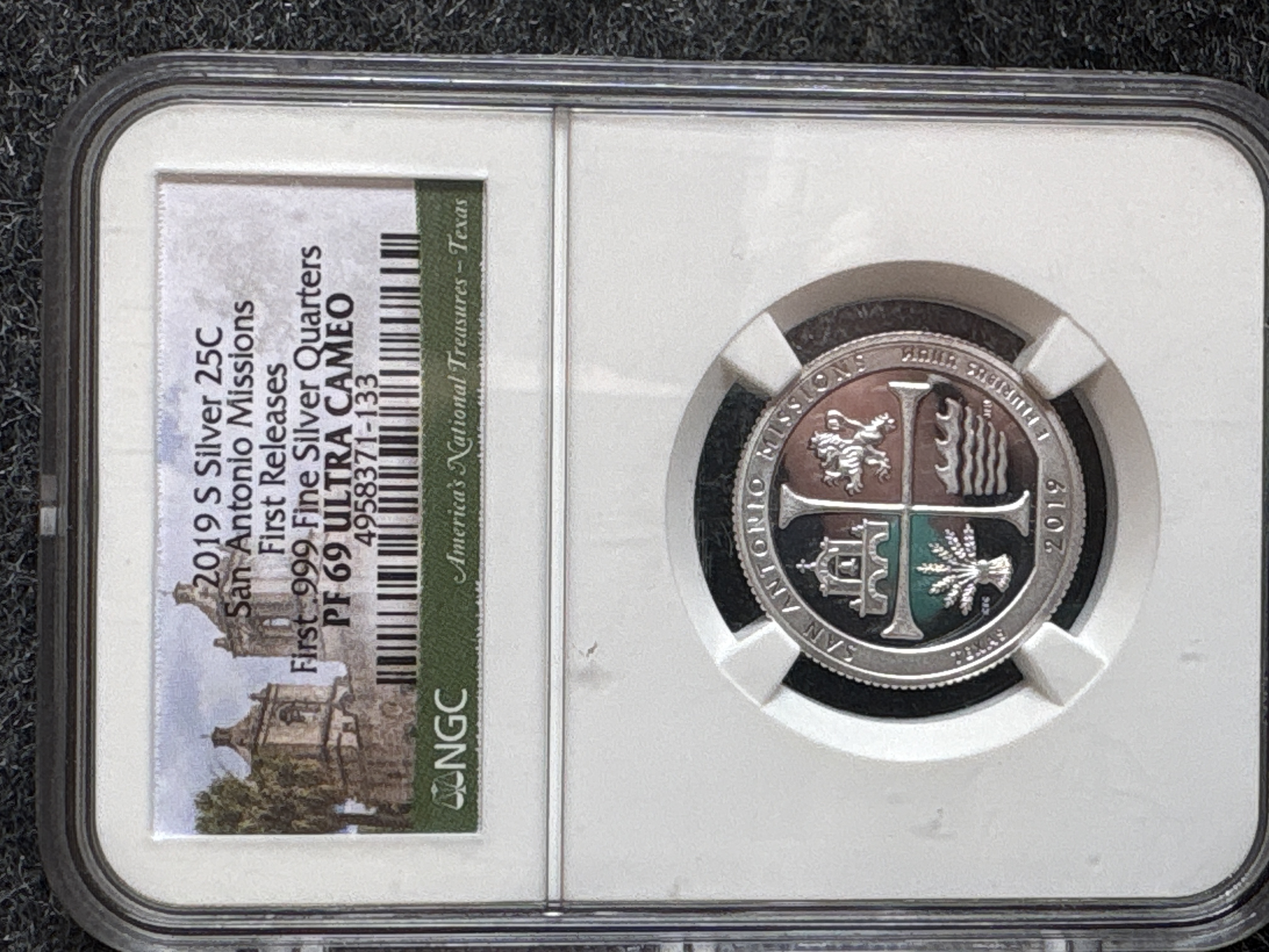 This US 2019-S silver quarter dollar is part of the America the Beautiful Quarters series, commemorating San Antonio Missions National Historical Park. Struck at the San Francisco Mint in .999 fine silver, the coin features a proof finish. The obverse features the Washington profile design and includes the S mint mark. The reverse features the San Antonio Missions design type. The coin is encapsulated in an NGC grading slab with the First Releases label designation and certification number 4958371-133. This issue represents the first year the United States Mint transitioned from .900 silver to .999 fine silver for proof quarter sets.