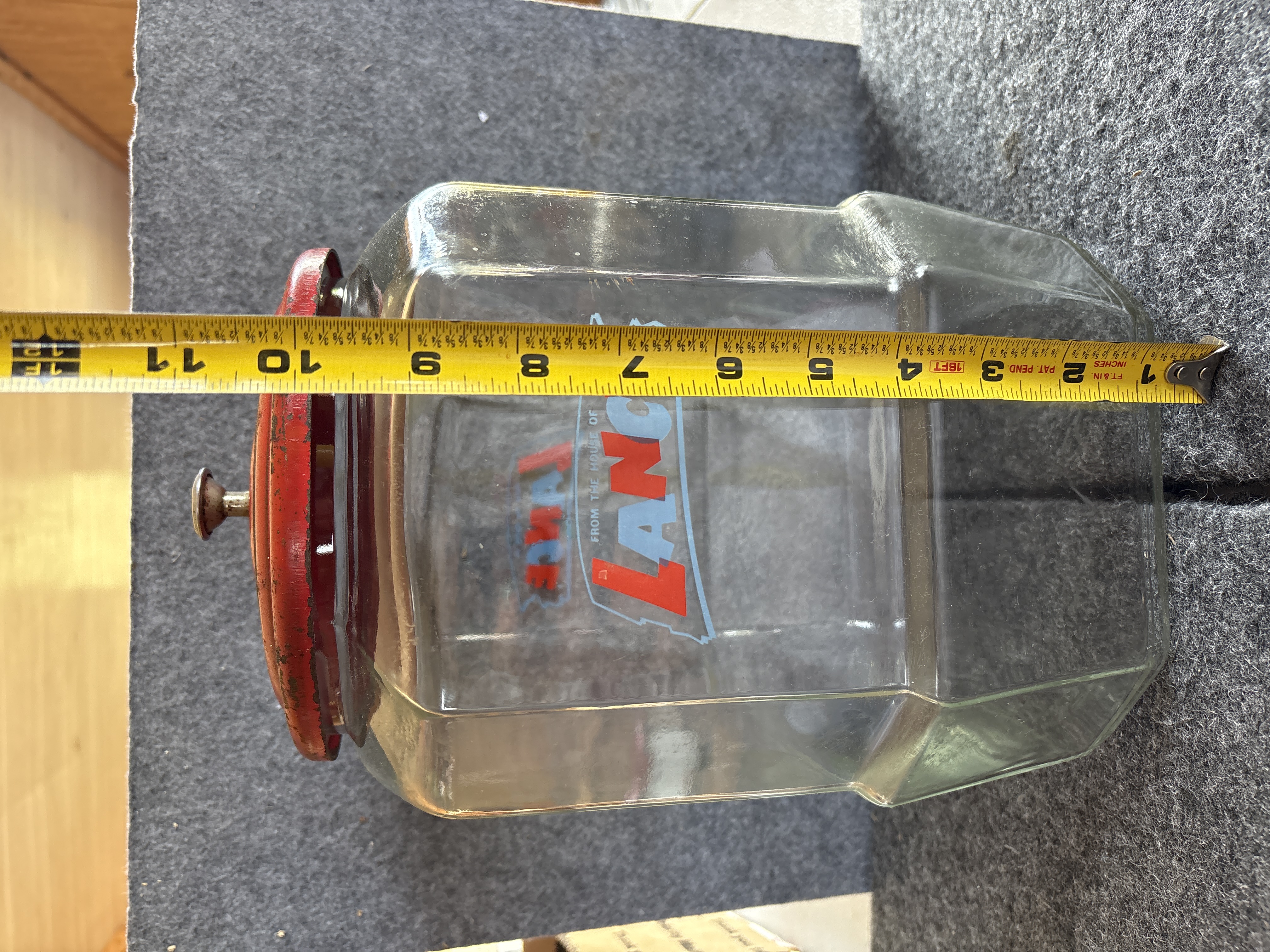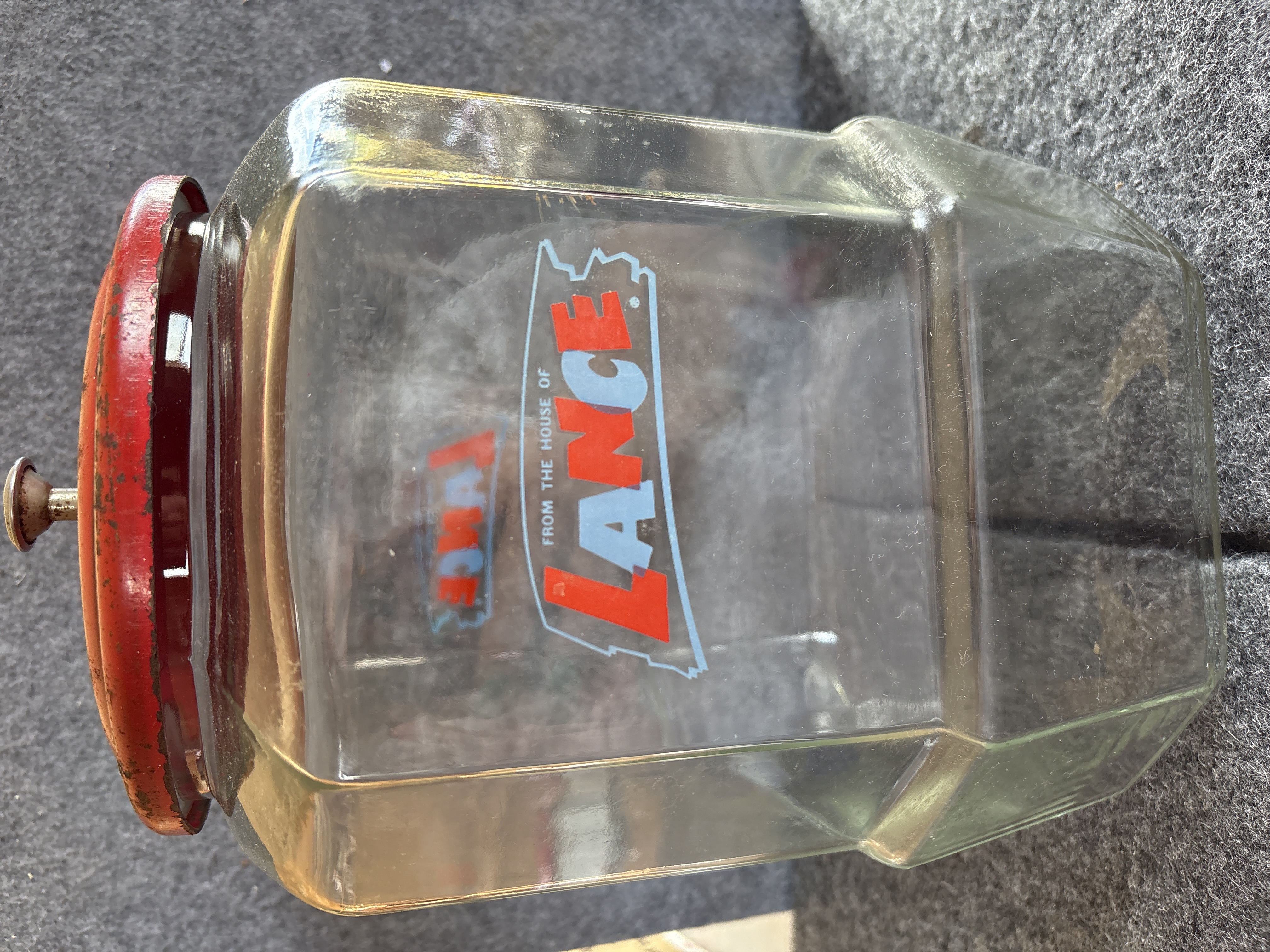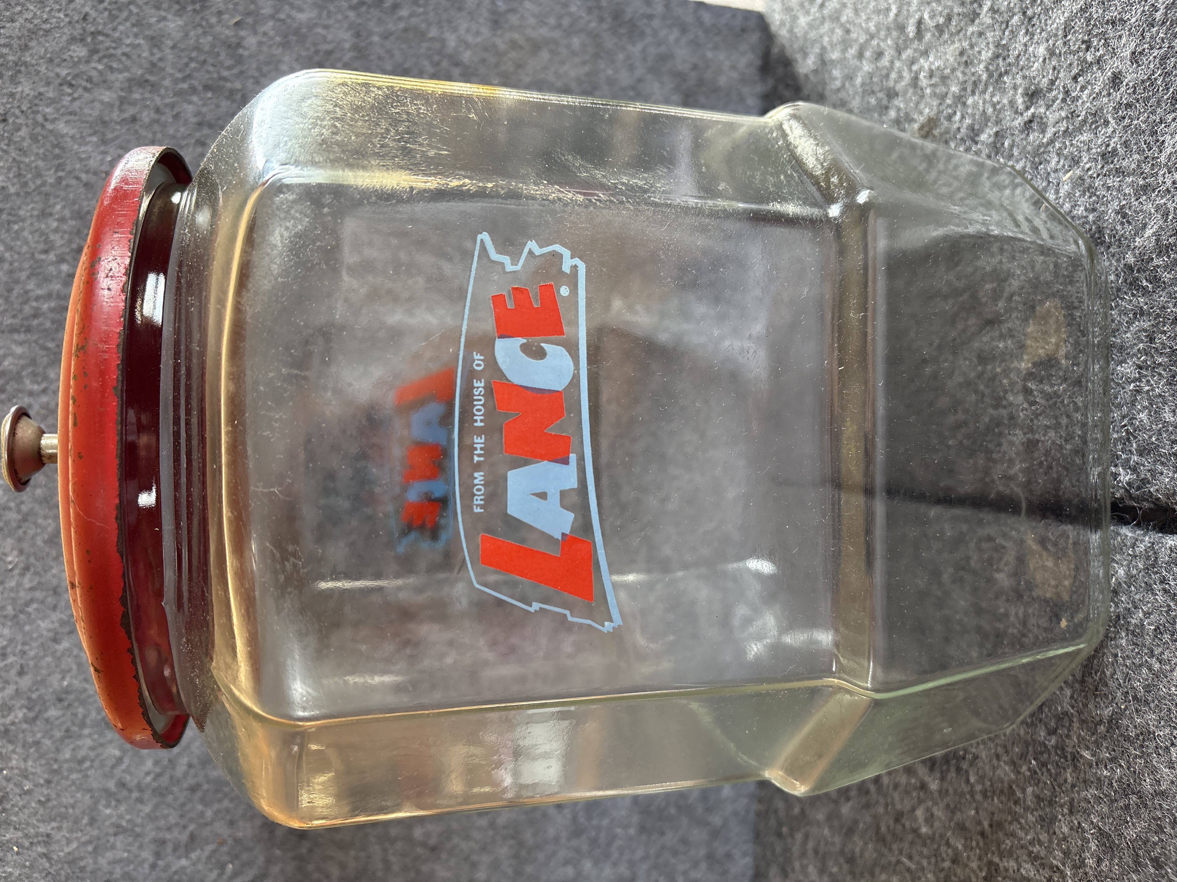 This vintage countertop display jar was produced for the Lance snack company. The jar features an eight-sided, faceted molded glass body designed for versatile store display, allowing it to sit upright or tilted on its side for easier access to contents. The front of the jar is screen-printed with a blue and red logo that reads From The House Of Lance. The underside of the glass base is embossed with the Lance name appearing twice in a circular pattern around the center. The jar includes its original stepped, circular metal lid finished in red paint with a central metal pull knob.
