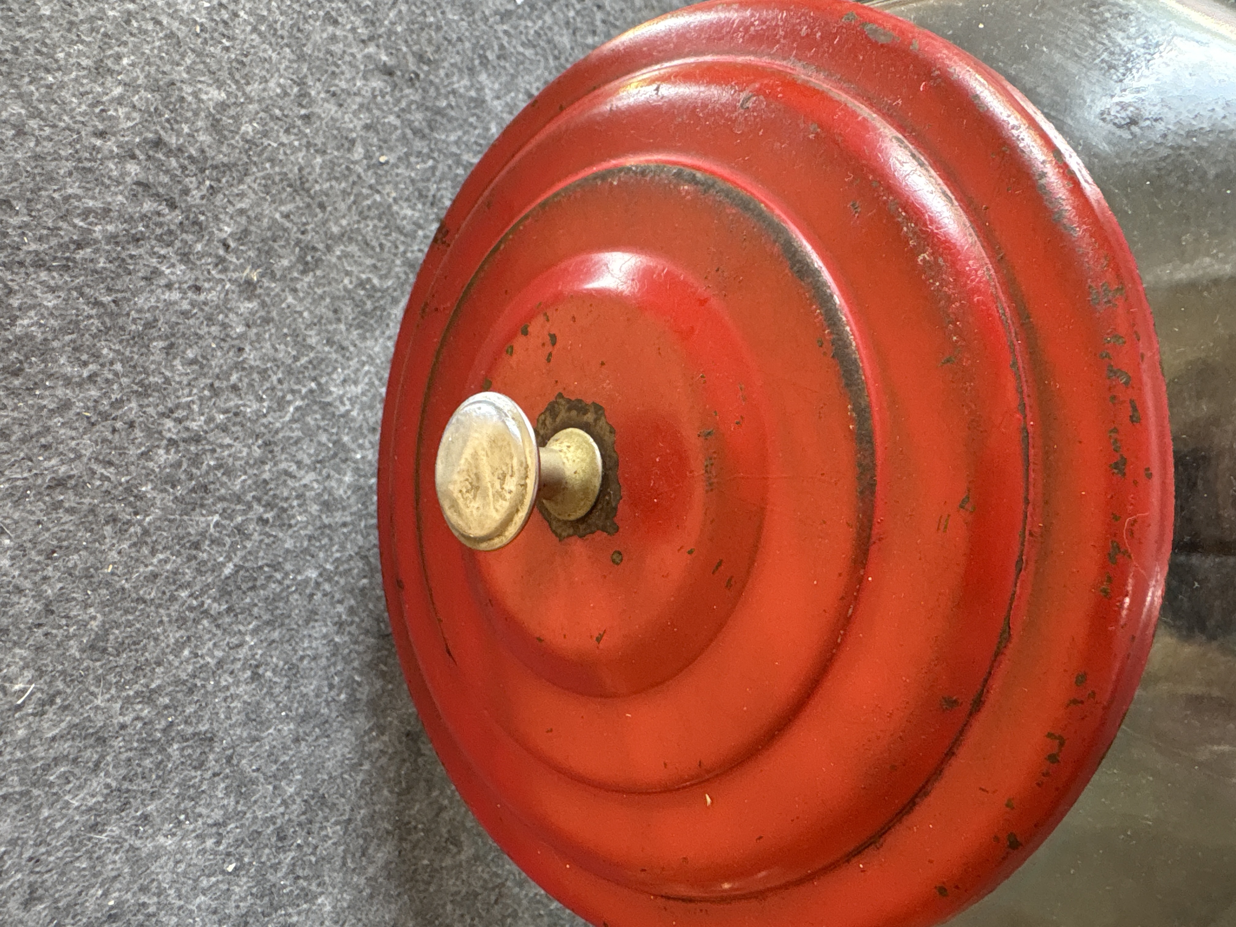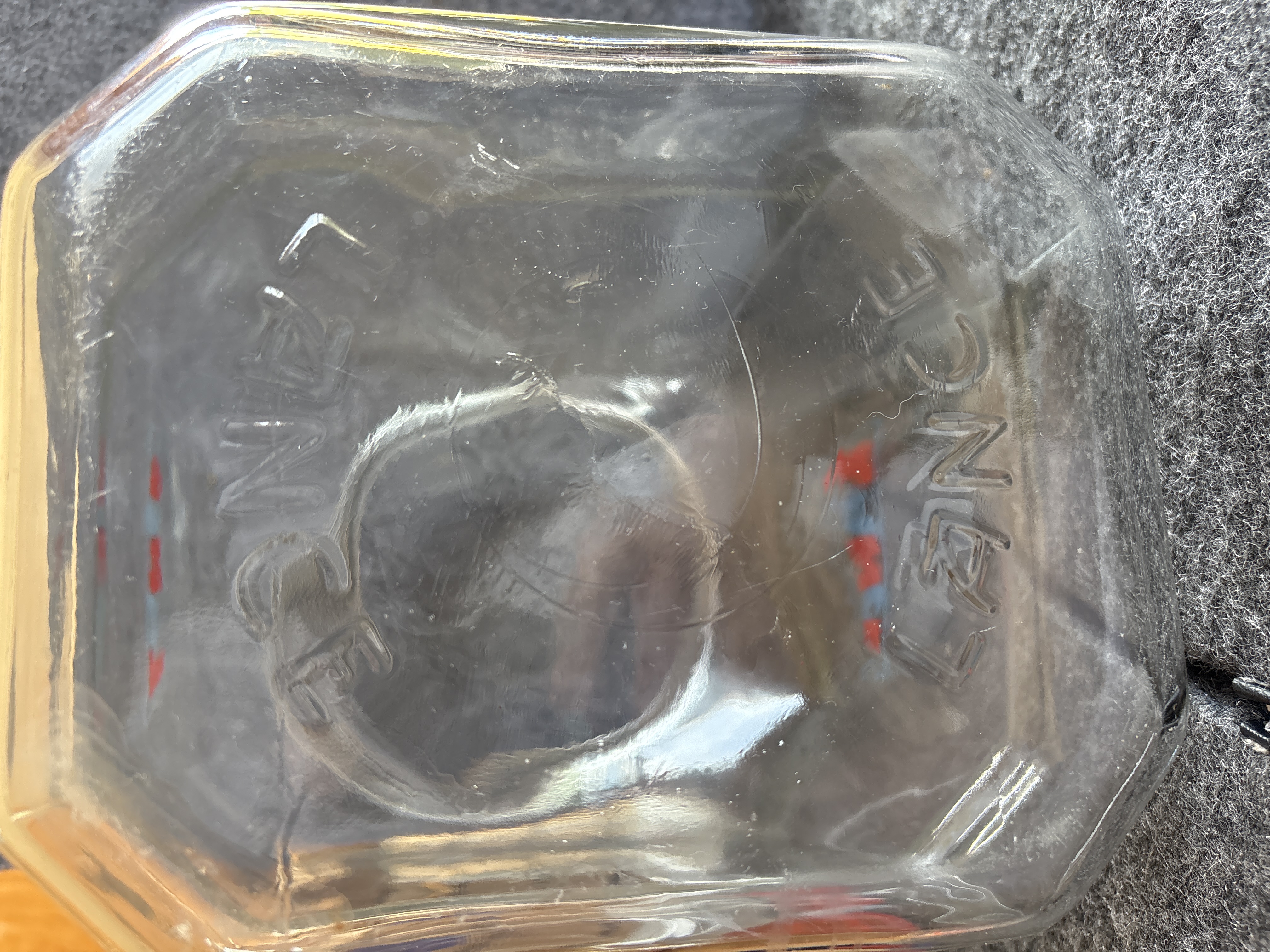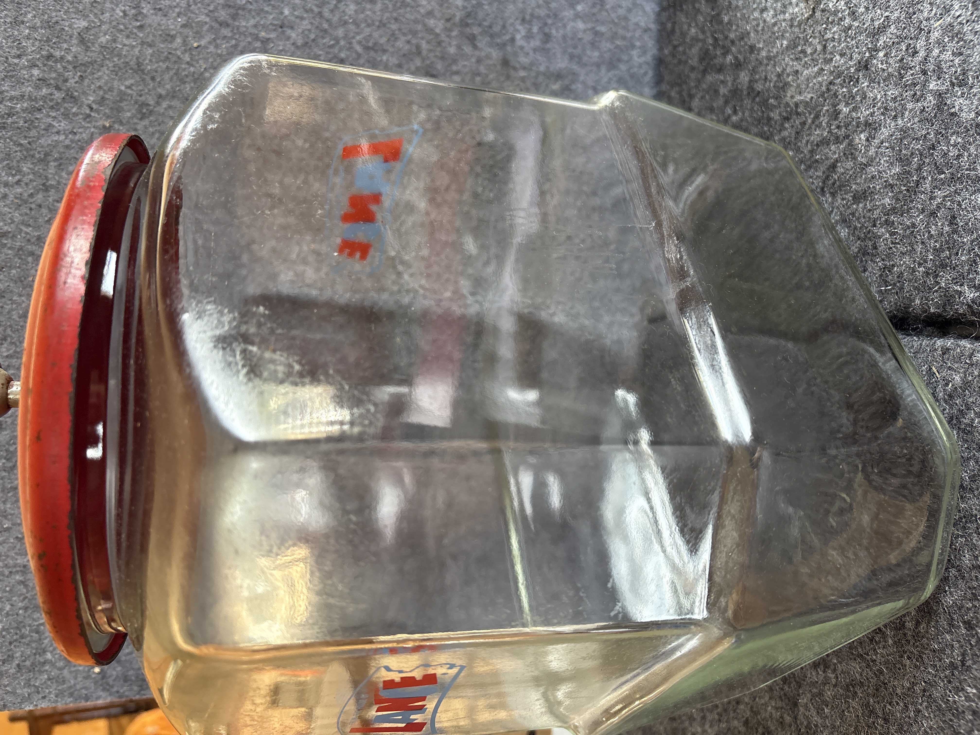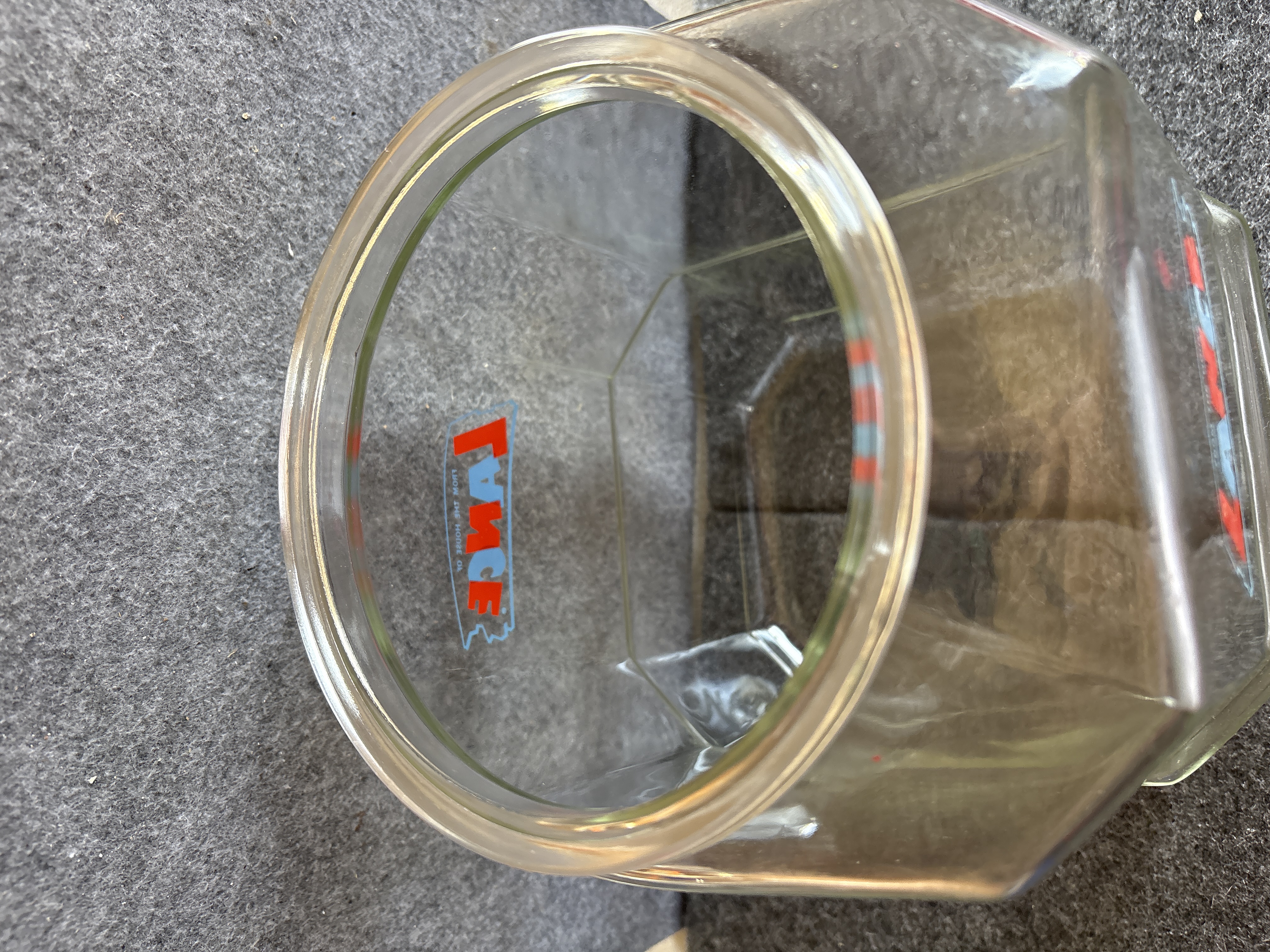 This vintage countertop display jar was produced for the Lance snack company. The jar features an eight-sided, faceted molded glass body designed for versatile store display, allowing it to sit upright or tilted on its side for easier access to contents. The front of the jar is screen-printed with a blue and red logo that reads From The House Of Lance. The underside of the glass base is embossed with the Lance name appearing twice in a circular pattern around the center. The jar includes its original stepped, circular metal lid finished in red paint with a central metal pull knob.