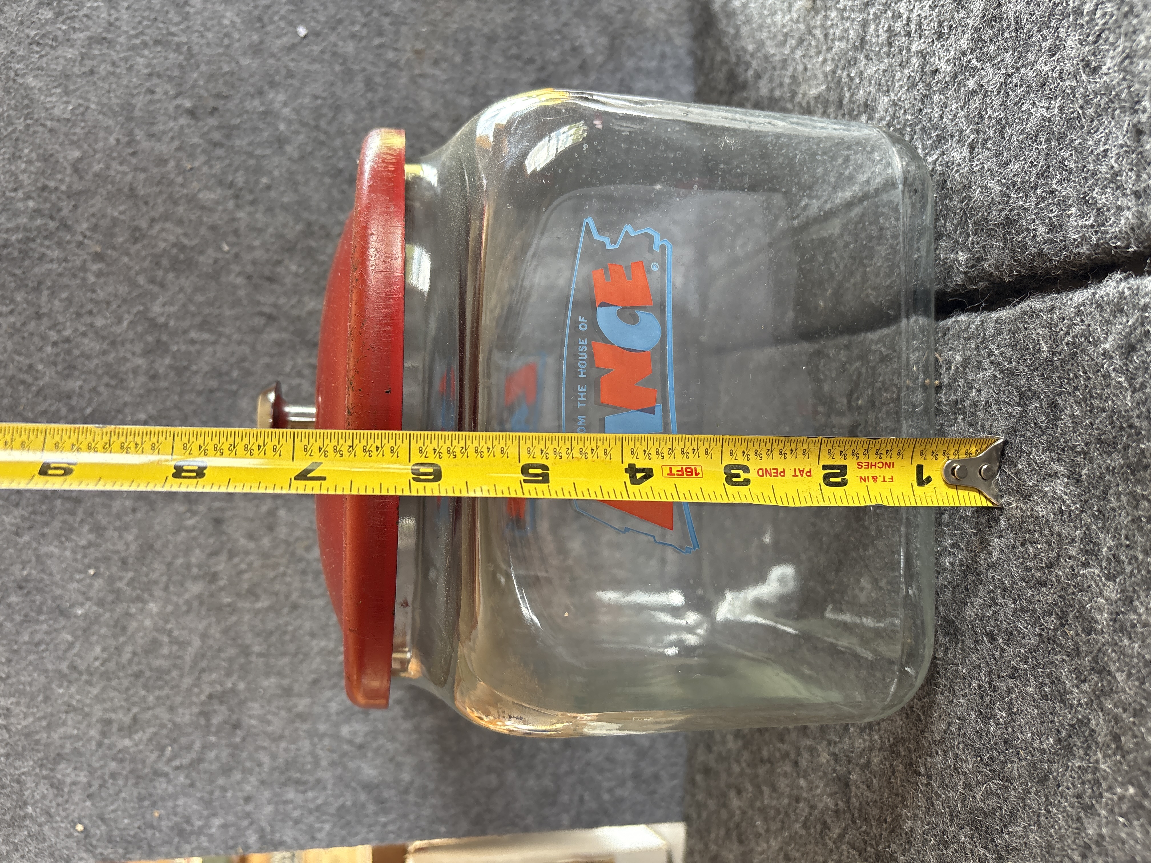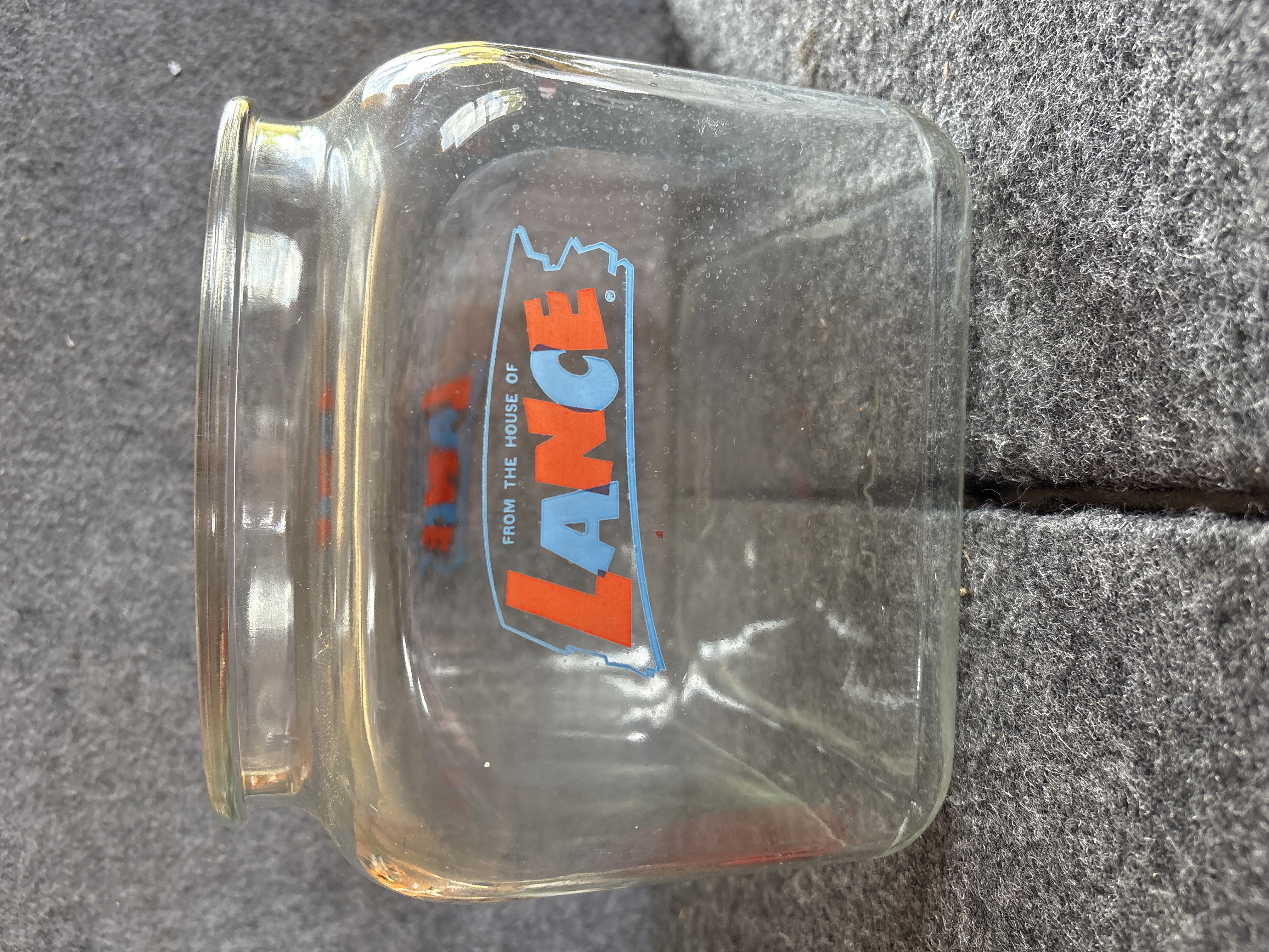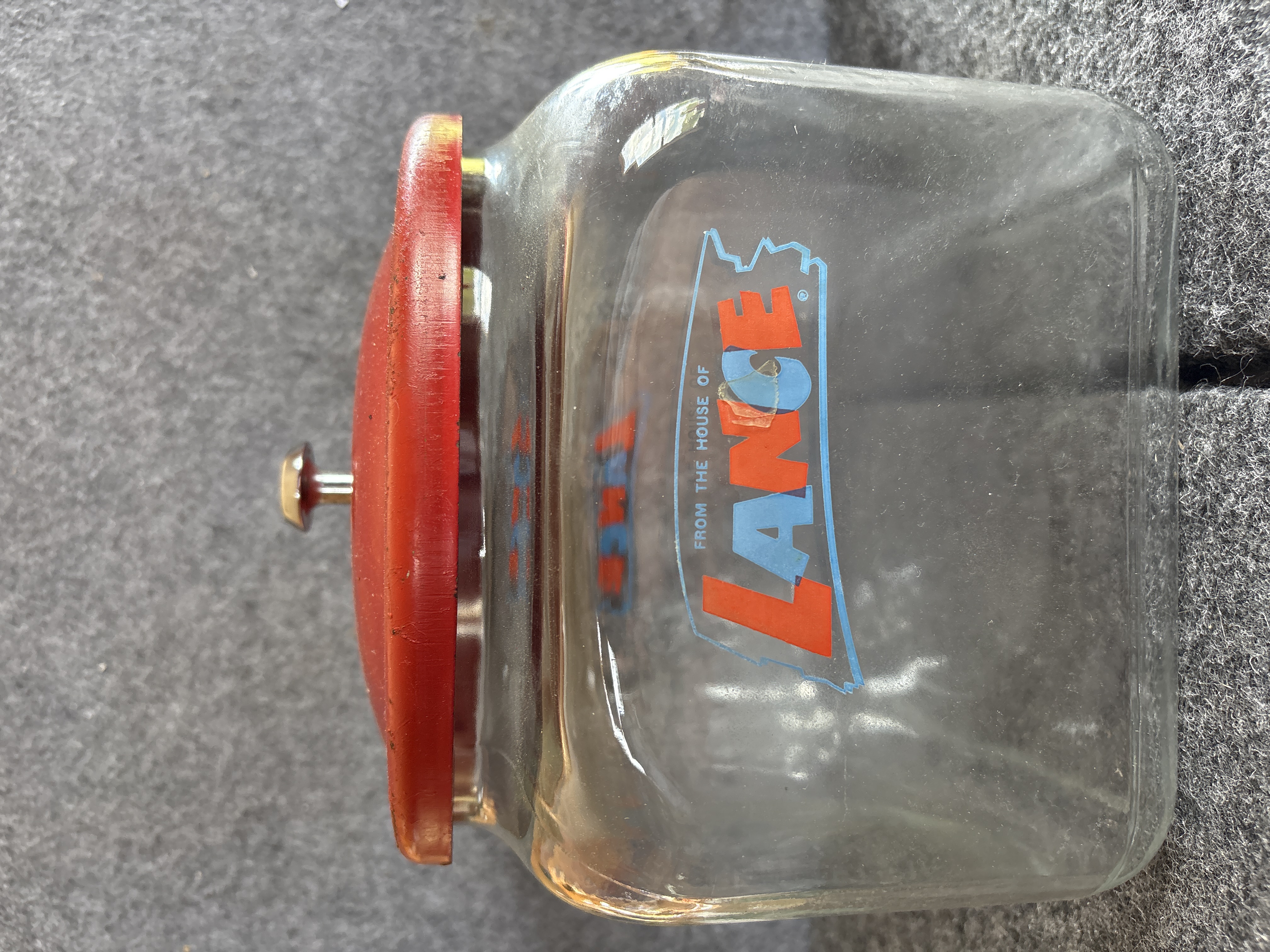 A vintage mid-20th-century commercial display jar manufactured for the Lance company. The jar features a square-shaped molded glass body with rounded corners and a wide mouth. The front of the jar displays a multi-colored logo that reads FROM THE HOUSE OF LANCE in stylized red and blue lettering, enclosed within a light blue border. The base of the glass jar is embossed with the LANCE brand name. Accompanying the jar is an original red painted metal lid featuring a small central metal knob. The interior of the metal lid is stamped with the LANCE name, indicating it is an original component of the display set.