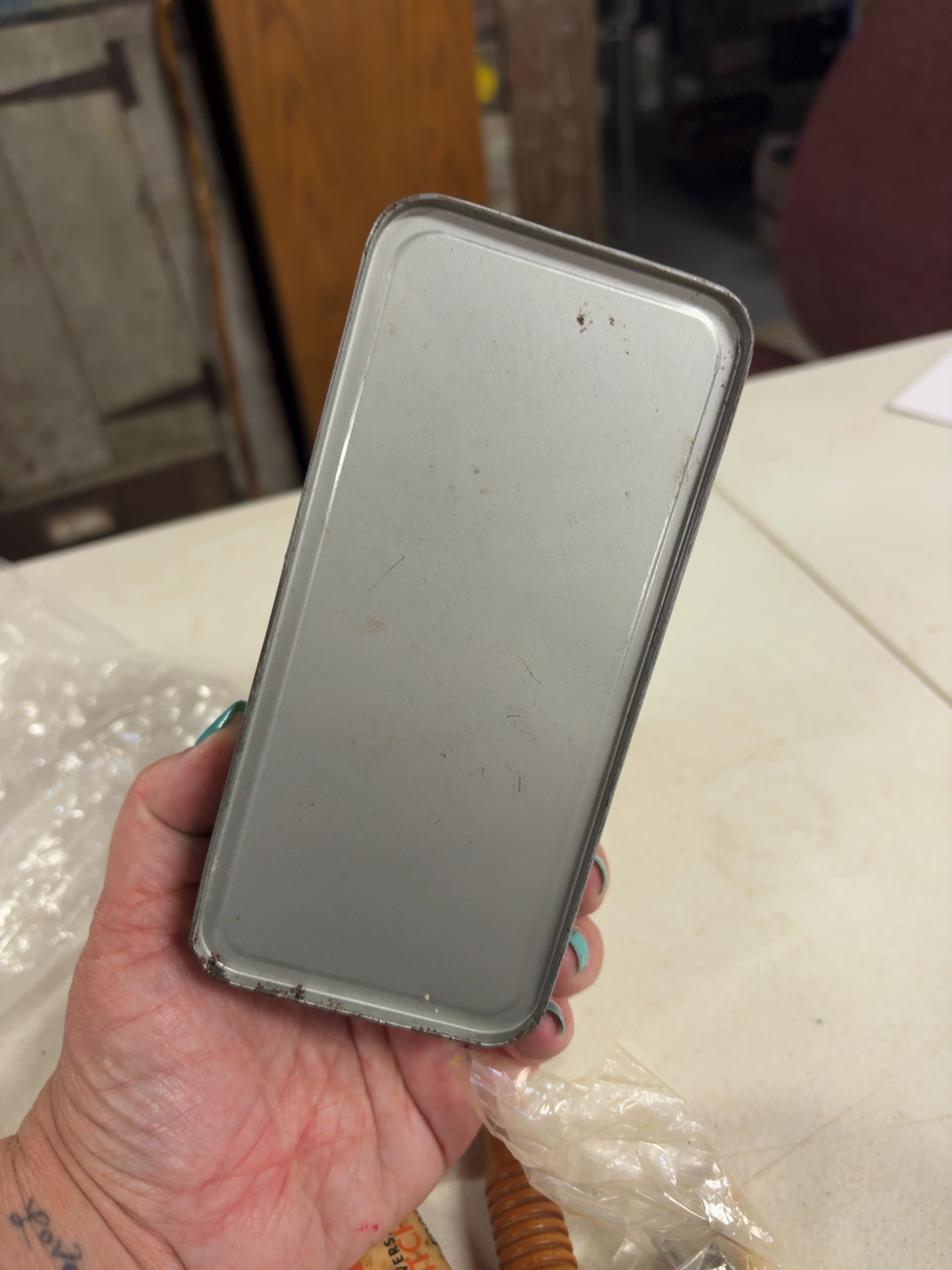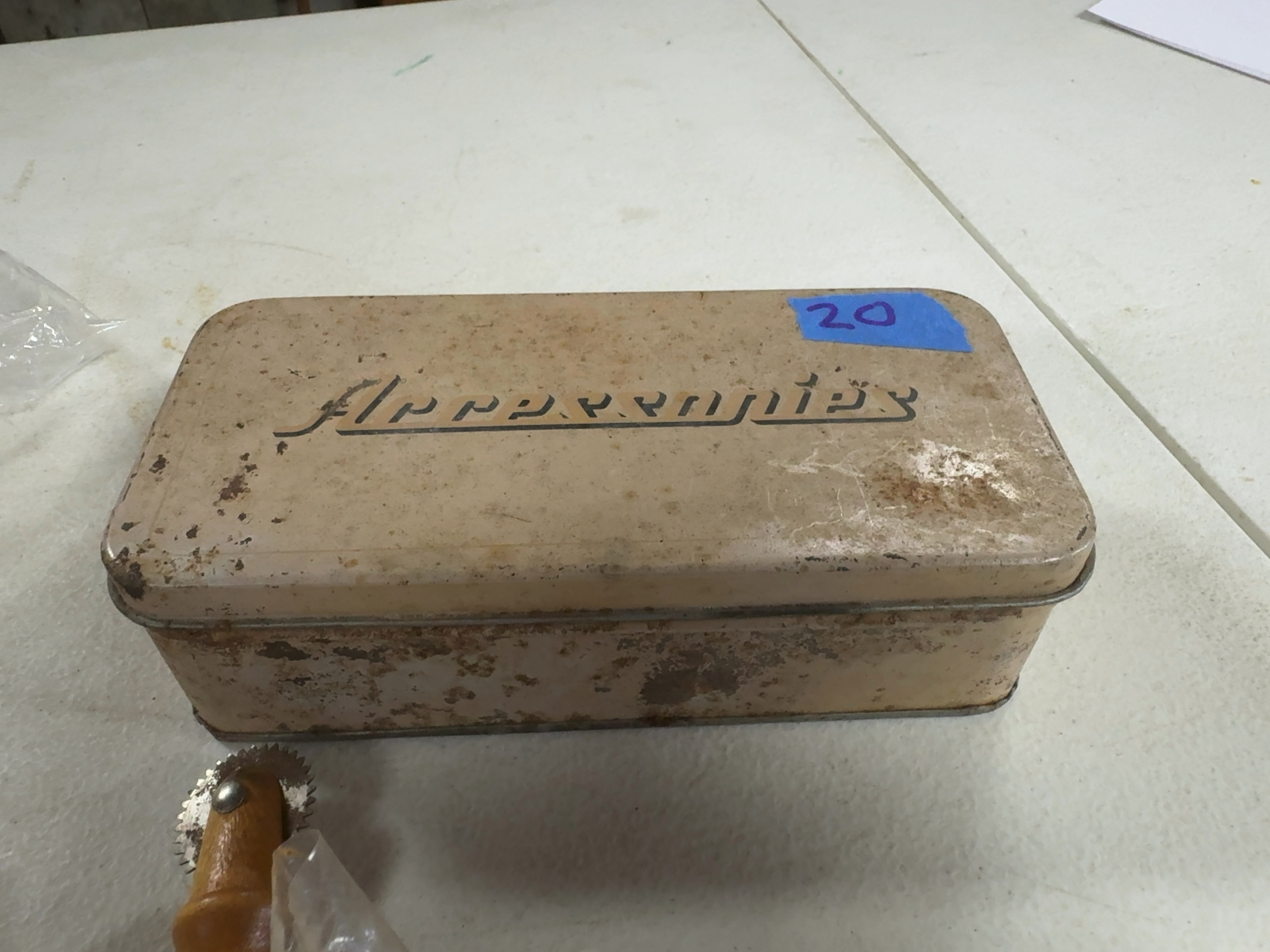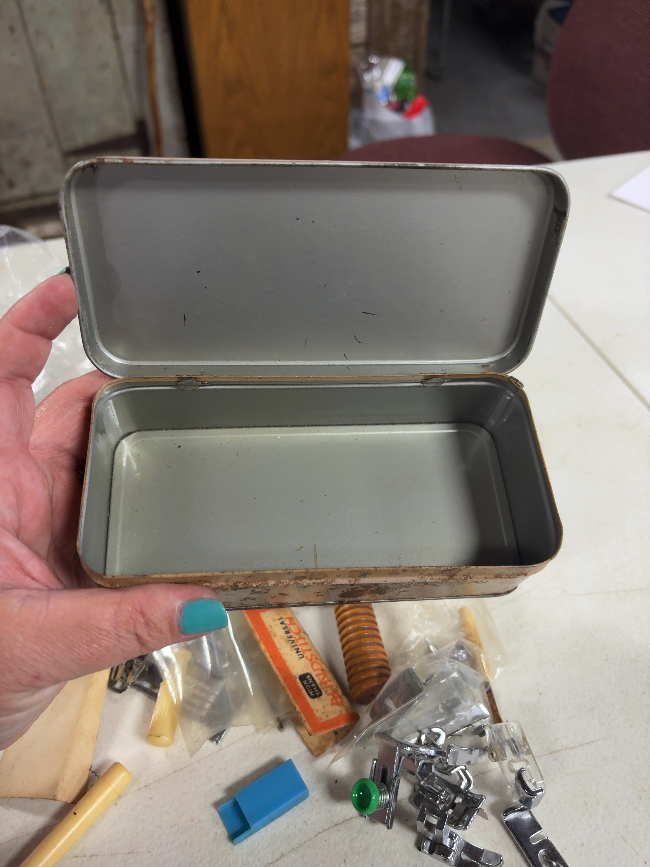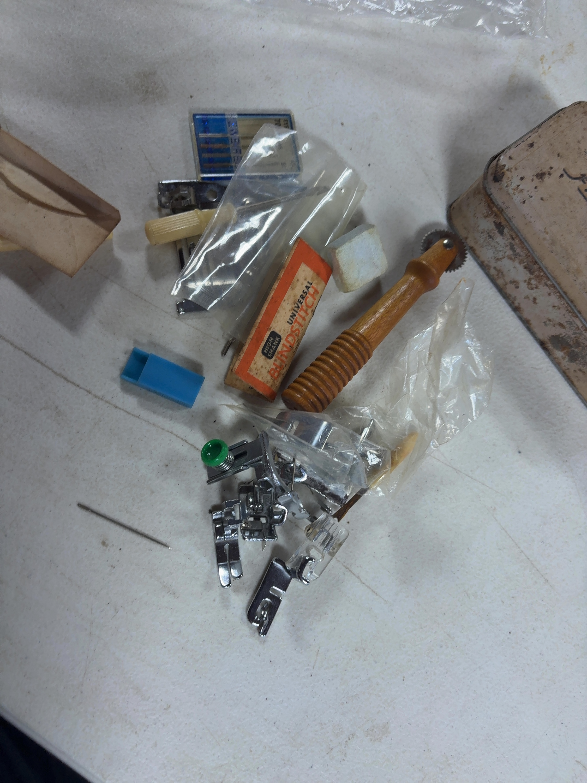 This lot features an assortment of vintage sewing accessories housed in a rectangular metal storage tin. The tin lid is lithographed with the word Accessories in a stylized black script on a cream-colored ground. Included in the collection are multiple metal sewing machine presser feet, one of which is housed in its original orange and white cardboard box labeled Universal Blindstitch High Shank. The lot also contains a tracing wheel featuring a serrated metal wheel and a decorative ribbed wooden handle, a block of white tailor chalk, and a partial pack of sewing machine needles along with a single loose needle.